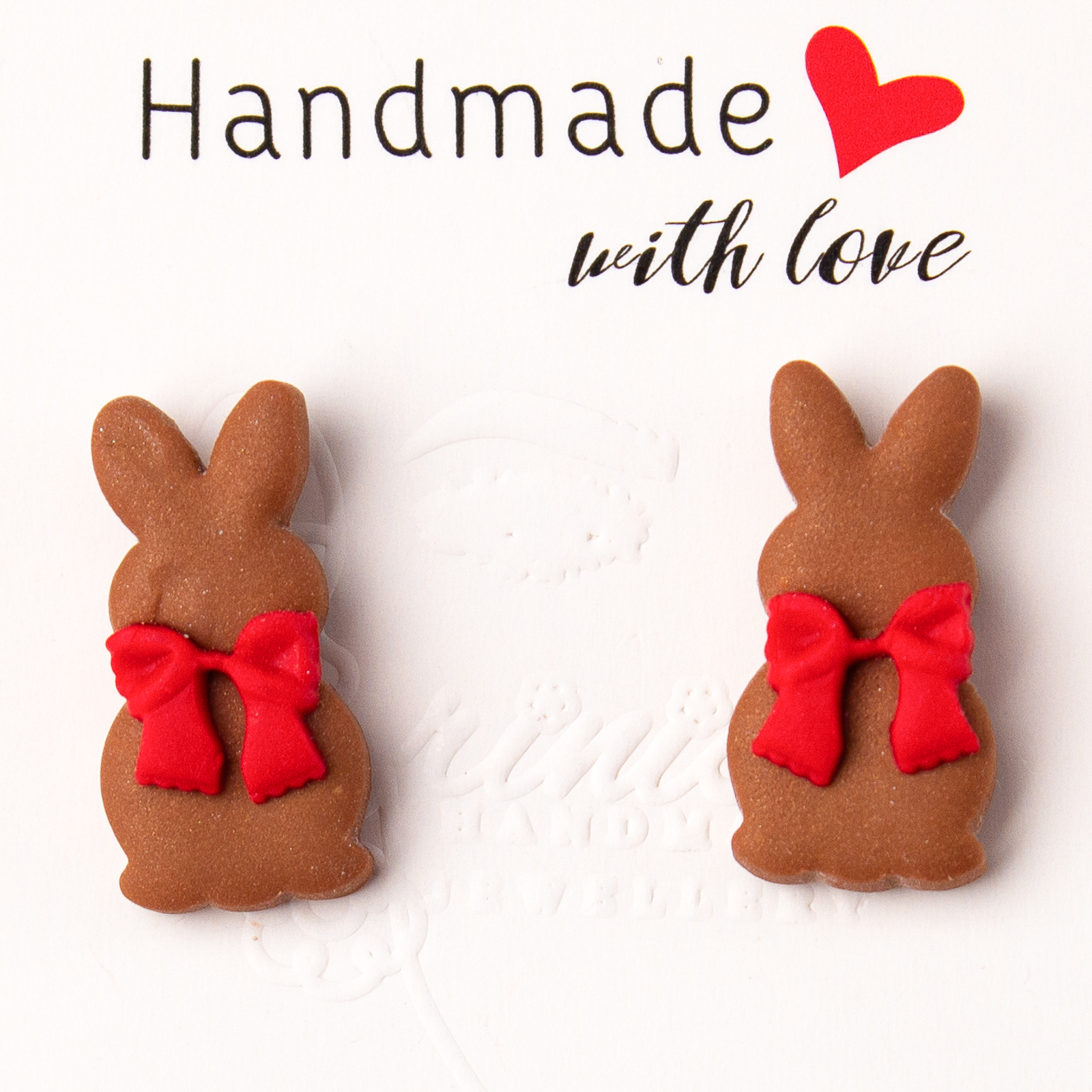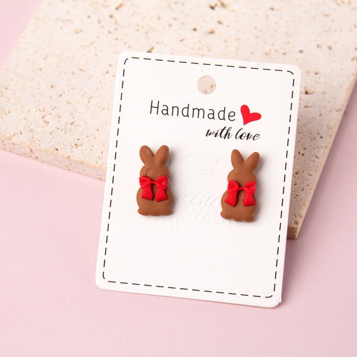 Această pereche de cercei mici din lut polimeric îți aduce aminte de iepurașii de ciocolată din copilărie! Cu un design adorabil, fiecare cercei este o mică bucată de dulceață pentru ochi. Perfectă pentru a completa o ținută jucausă sau pentru a aduce o notă dulce zilnic, acești cercei sunt o alegere delicioasă pentru oricine își dorește să aducă un strop de copilărie în viața lor.