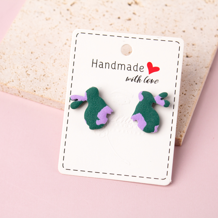 Bucură-te de o doză de veselie și culoare cu perechea noastră de cercei cu iepurași în nuanțe de verde și mov! Realizați cu migală din lut polimeric, acești cercei adorabili îți aduc aminte de iepurașii de ciocolată din copilărie. Perfecti pentru orice ocazie, acești cercei adaugă un strop de jucăușie și dulceață în viața ta de zi cu zi.