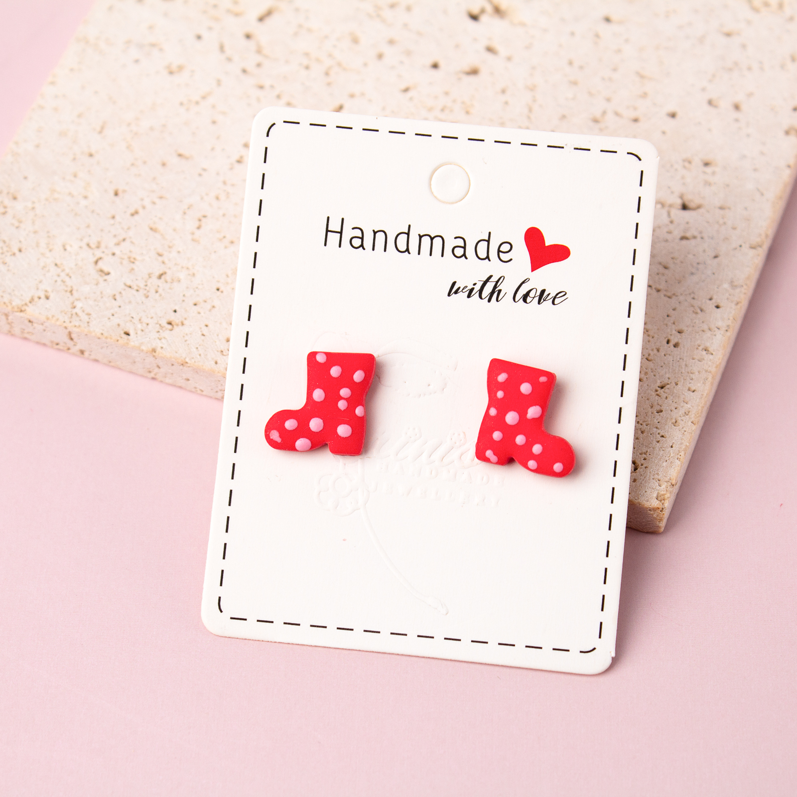 Această pereche de cercei mici din lut polimeric în formă de ghetuțe cu buline te va duce înapoi în timp, la zilele copilăriei, când purtai cu bucurie ghete de ploaie roșii cu buline. Amuzanți și adorabili, acești cercei sunt o reminiscență a jocului și al inocenței vremurilor trecute. Cu un design ludic și o notă de nostalgie, acești cercei sunt nu doar accesorii, ci și povești mici purtate la urechi.
