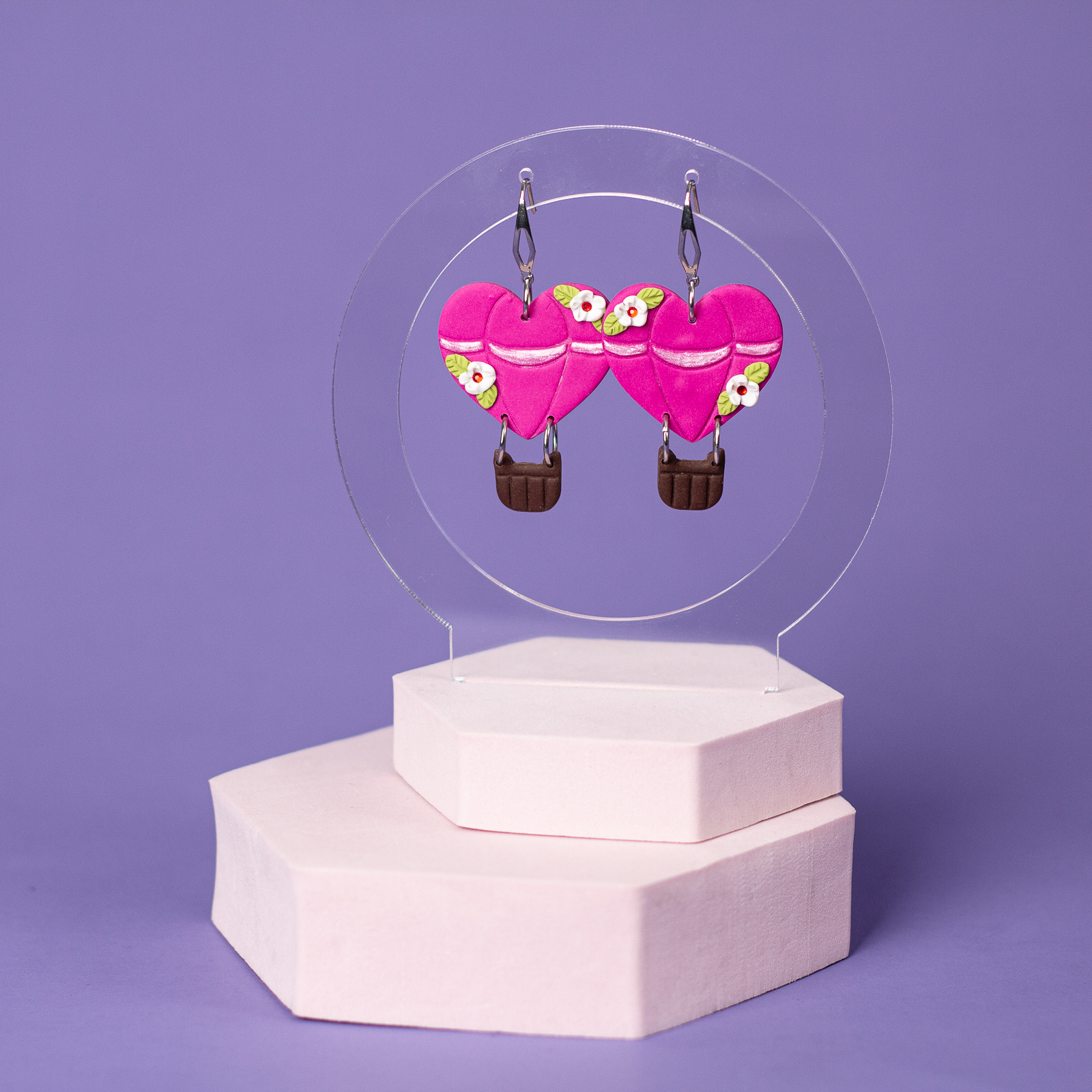Acești cercei adorabili în formă de balon cu aer cald, de culoare roz cu flori albe, sunt lucrați manual din lut polimeric. Delicați și ușor de purtat, sunt perfecti pentru a adăuga un strop de farmec oricărei ținute.