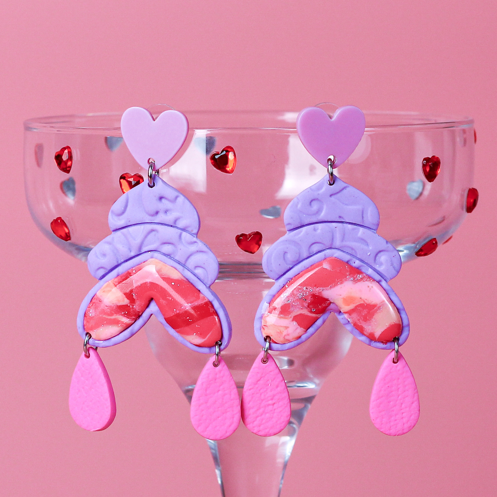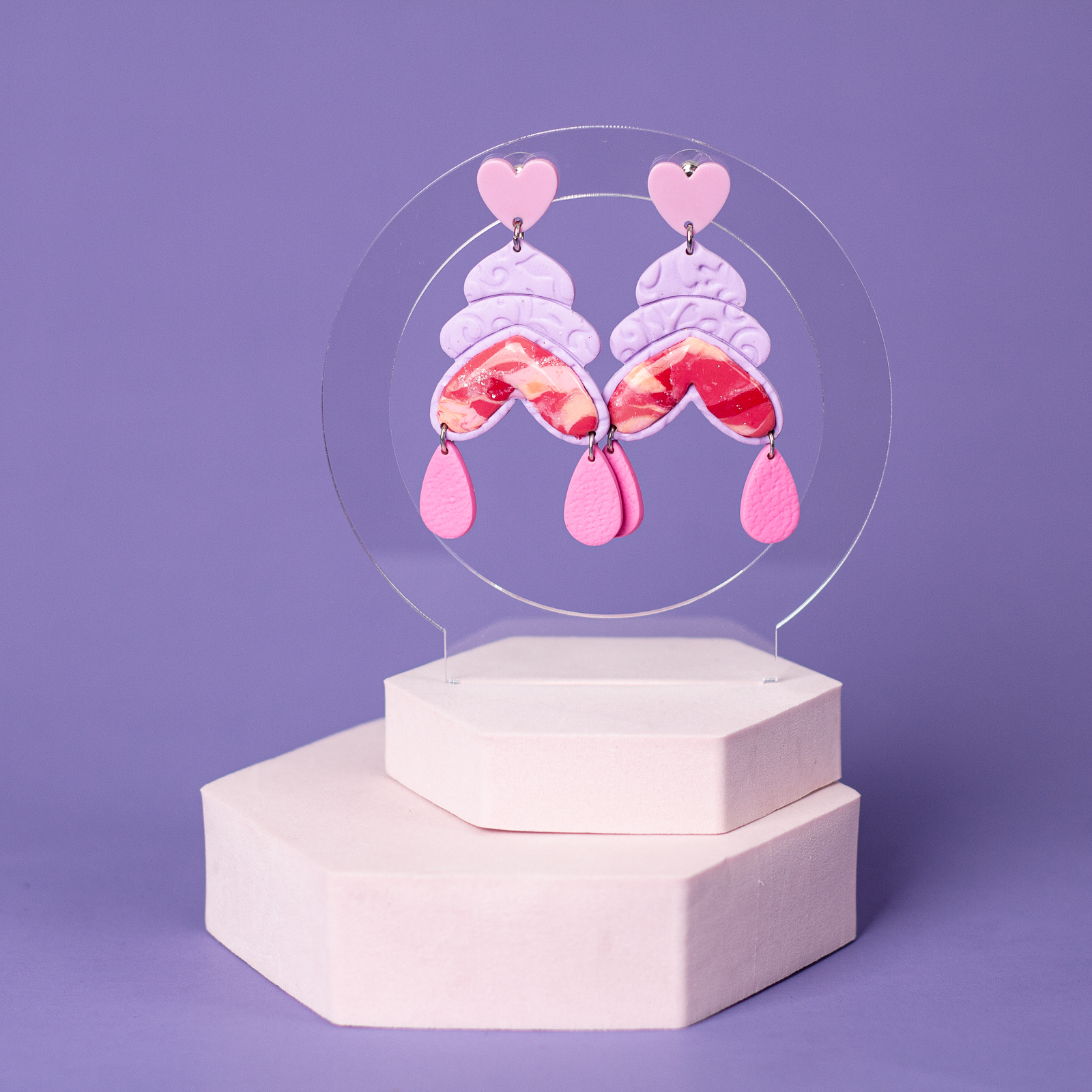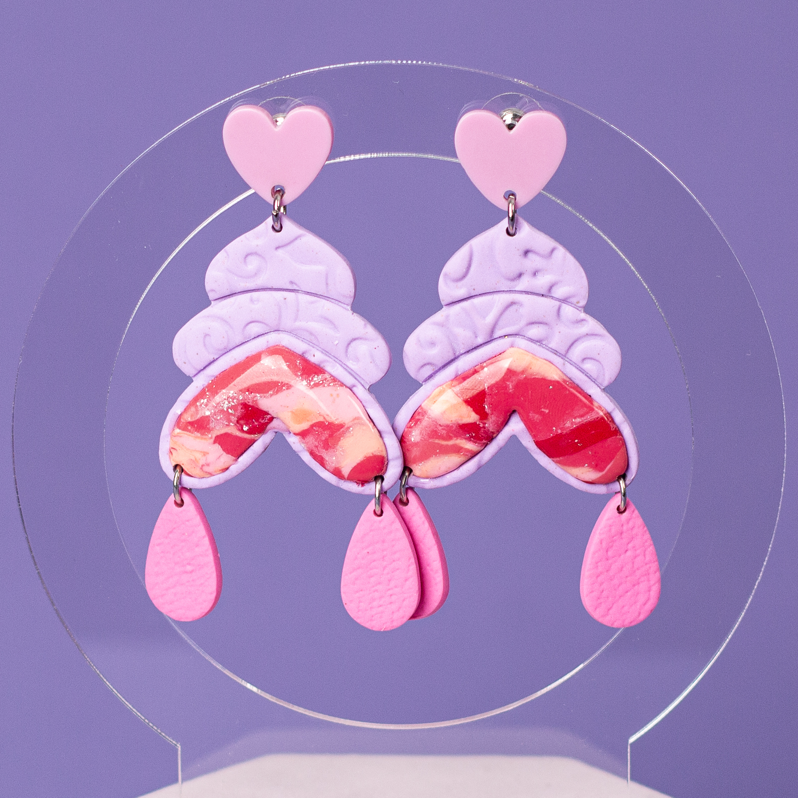 Acești cercei lungi, în nuanțe delicate de roz și mov, au ca piesă de rezistență o inimioară multicoloră cu un design unic. Ușor de purtat și plini de veselie, sunt creați pentru a-ți aduce un zâmbet chiar și în zilele mai gri. Un produs handmade, lucrat cu iubire, special pentru tine!