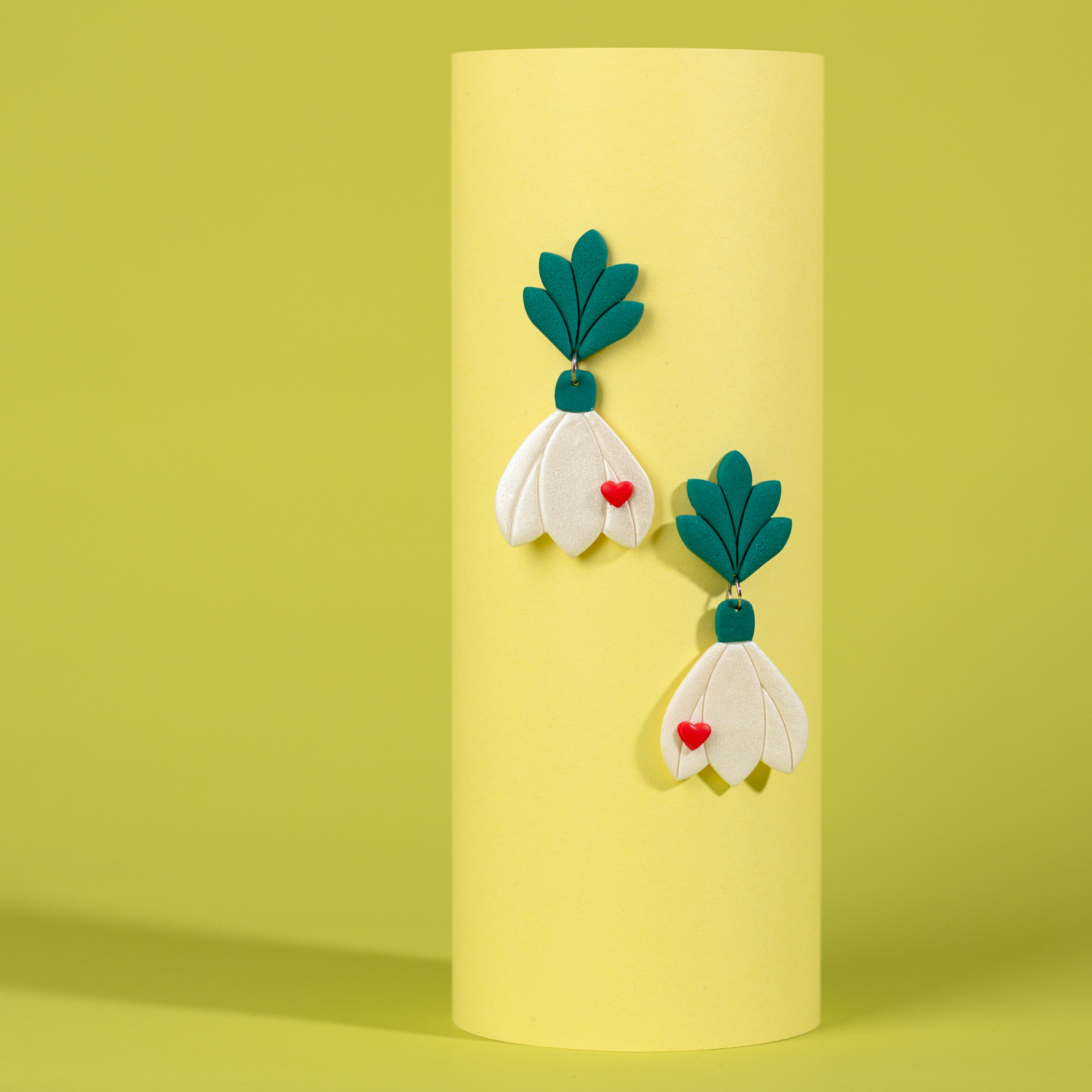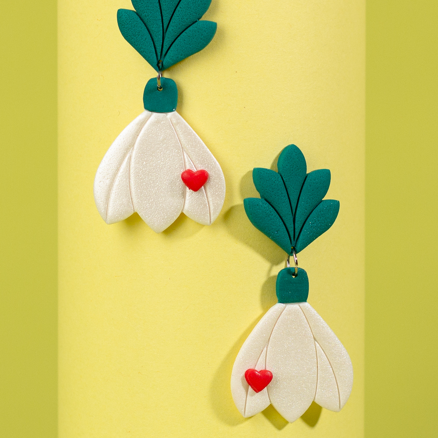 Explorează universul vesel al acestei perechi de cercei handmade din lut polimeric, în forma unui ghiocel sprinten însoțit de o inimioară jucăușă.