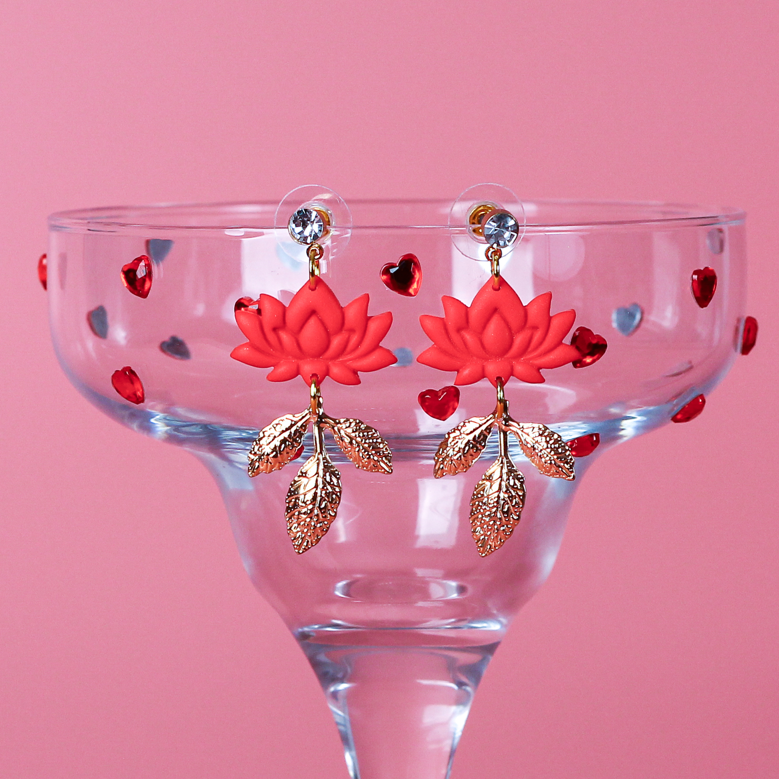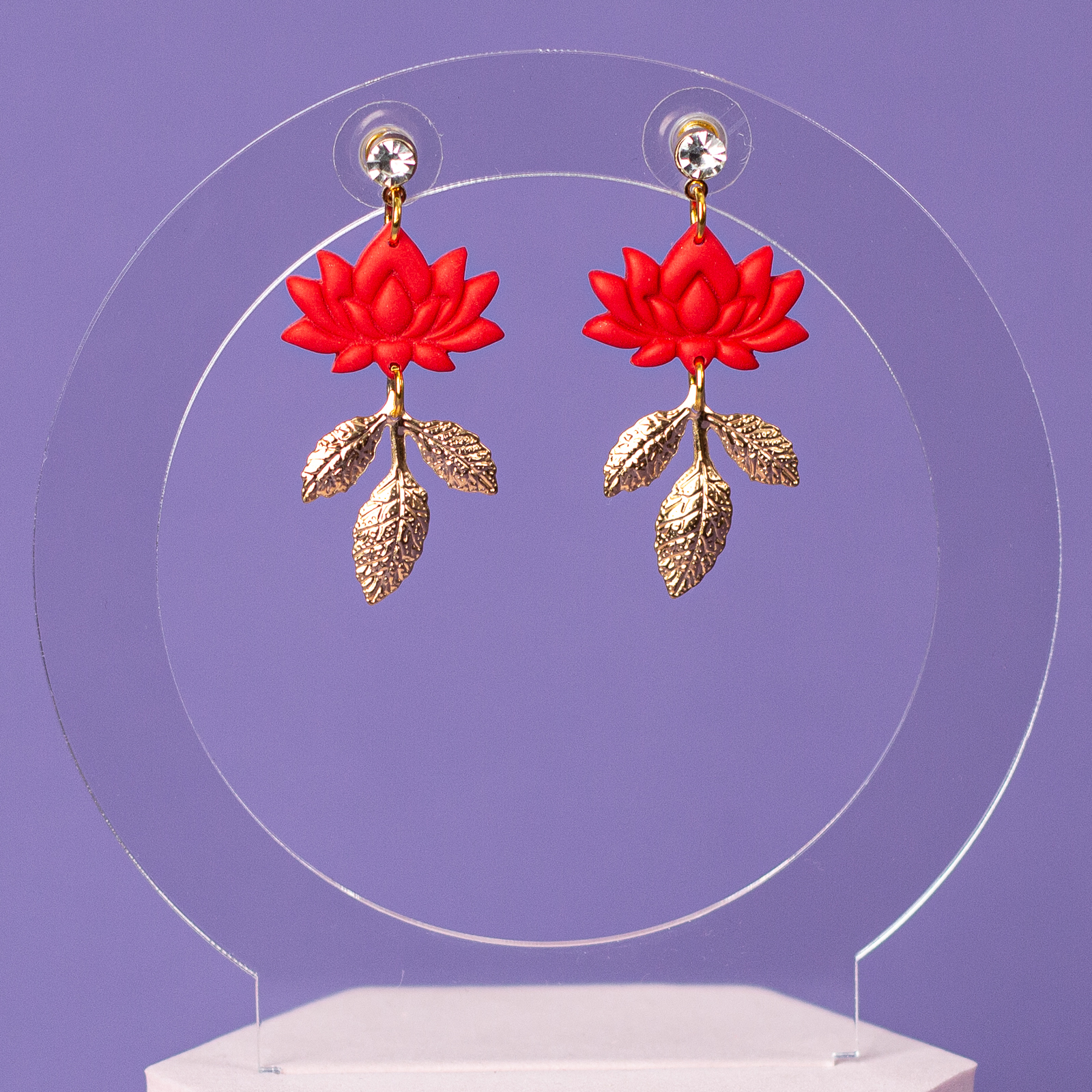 Explorează eleganța și rafinamentul cu această pereche de cercei handmade din lut polimeric, în formă de floare de lotus, cu frunze aurii.