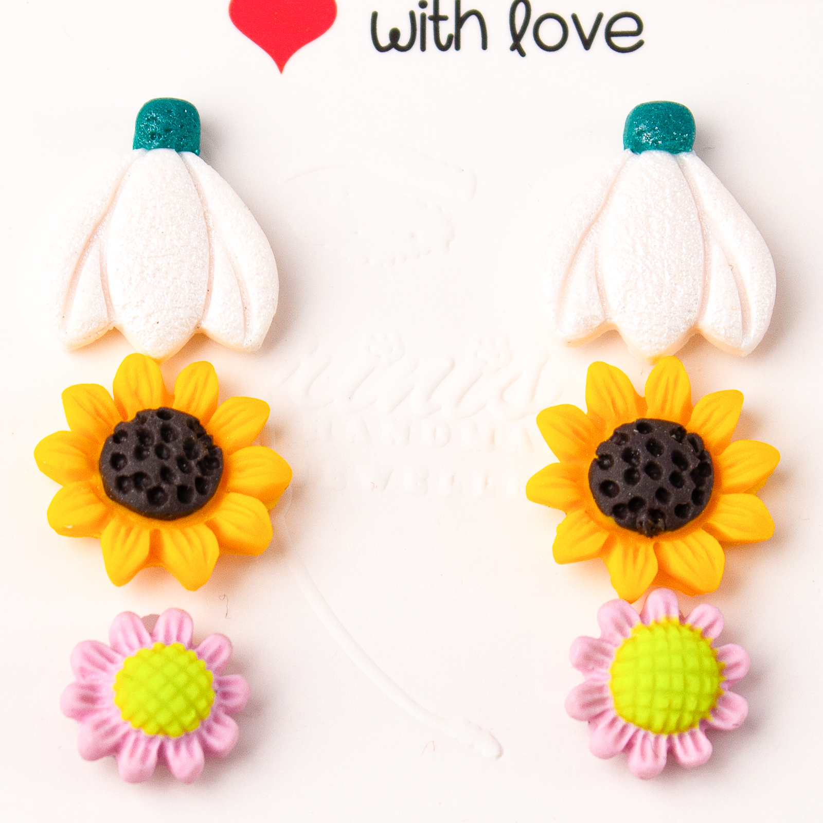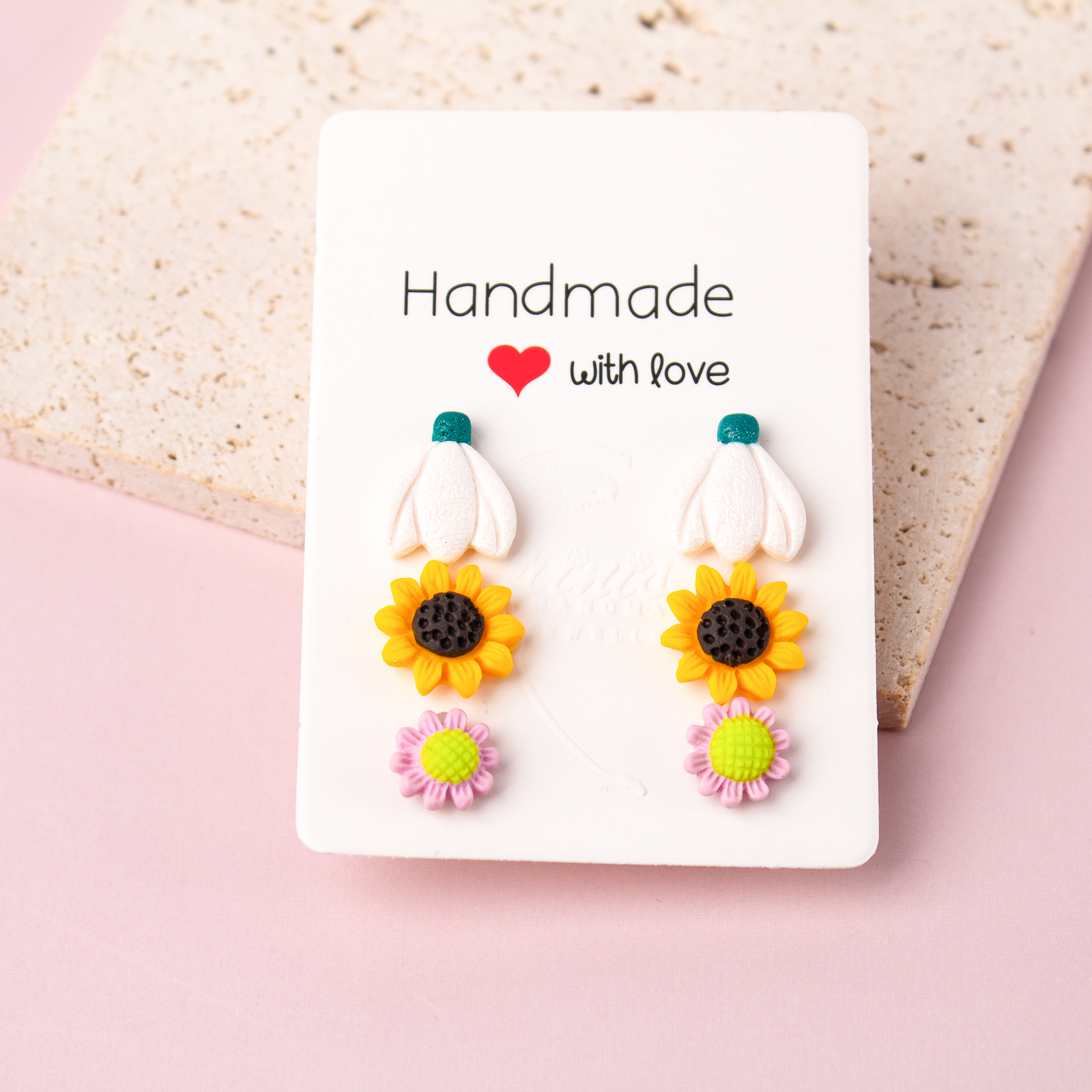 Acest set adorabil de cercei handmade din lut polimeric te va purta cu gândul la primăvară în fiecare zi! Fiecare pereche de cercei este în formă de floare, aducând un strop de prospețime și veselie oricărei ținute. Cu cele trei modele diferite, poți alege varianta perfectă pentru a completa look-ul tău primăvăratic. Bucură-te de frumusețea și delicatețea acestor cercei care aduc cu ei farmecul și prospețimea primăverii!