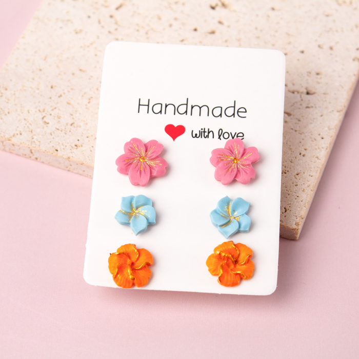 Setul include 3 perechi de cercei tip studs, inspirați de frumusețea florilor exotice, în nuanțe pastel armonios alese: roz fin, albastru pal și portocaliu cald. Fiecare pereche are propria personalitate, dar împreună creează un echilibru vizual plin de prospețime și rafinament.