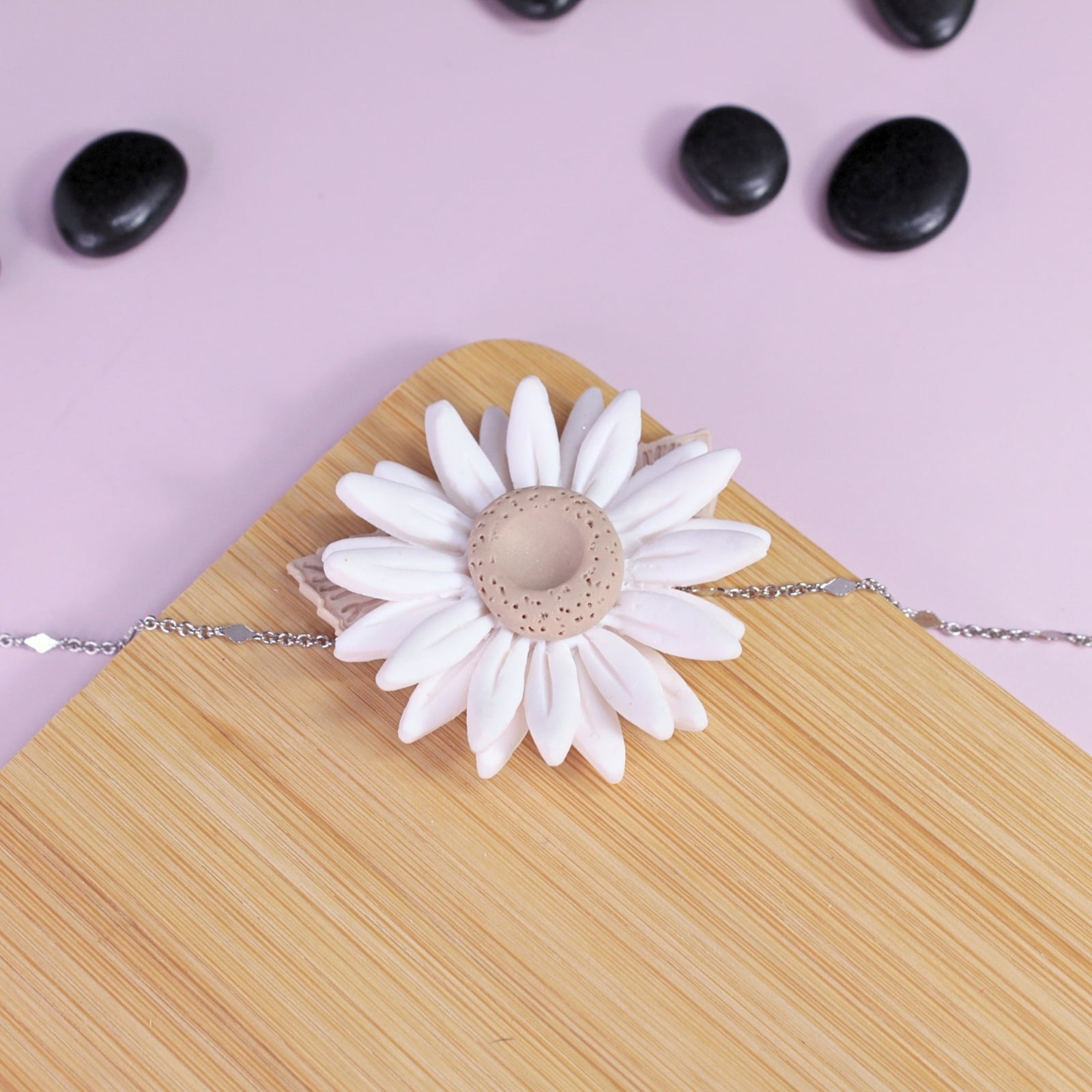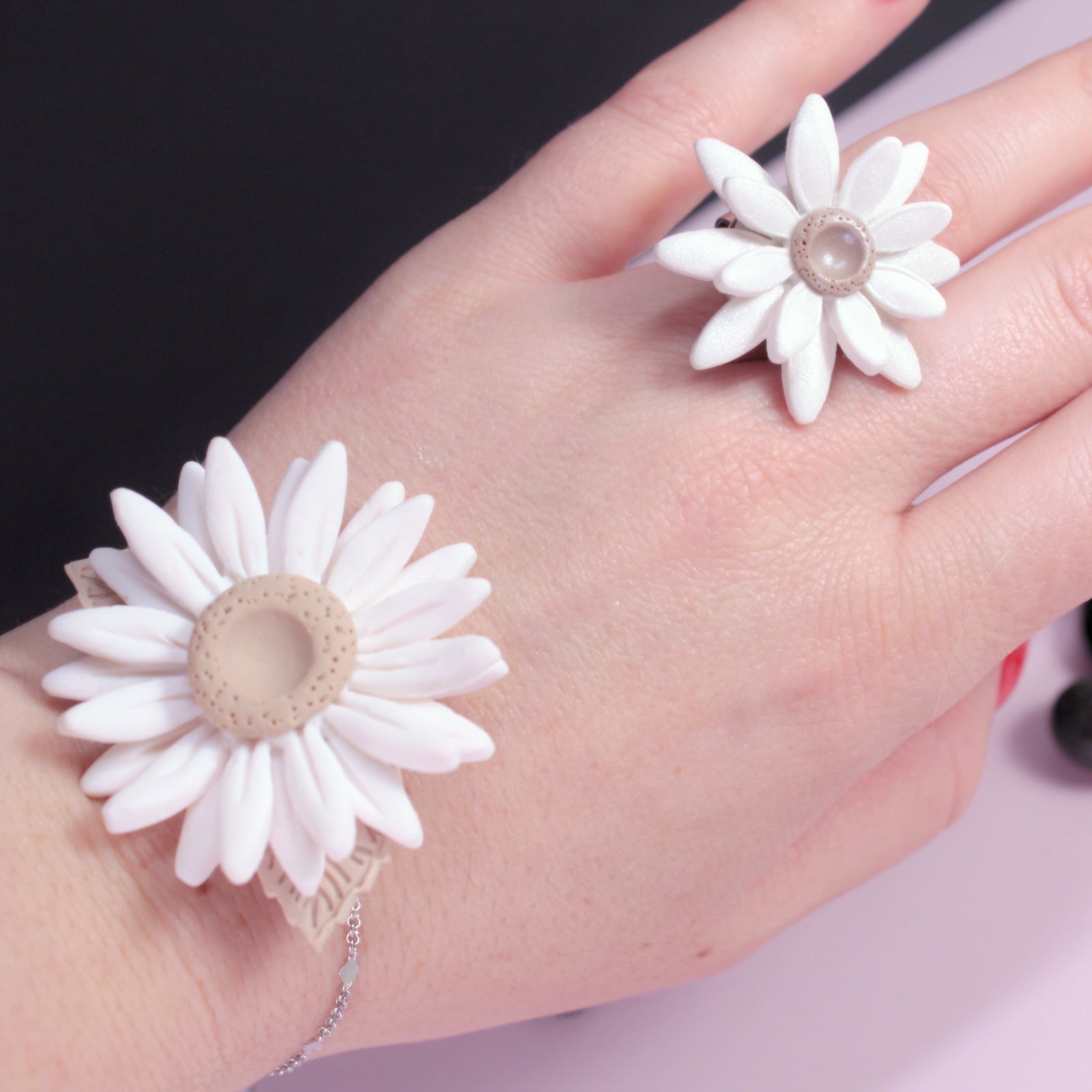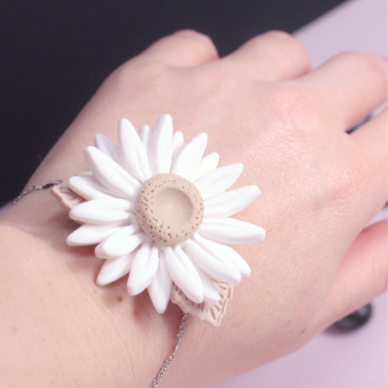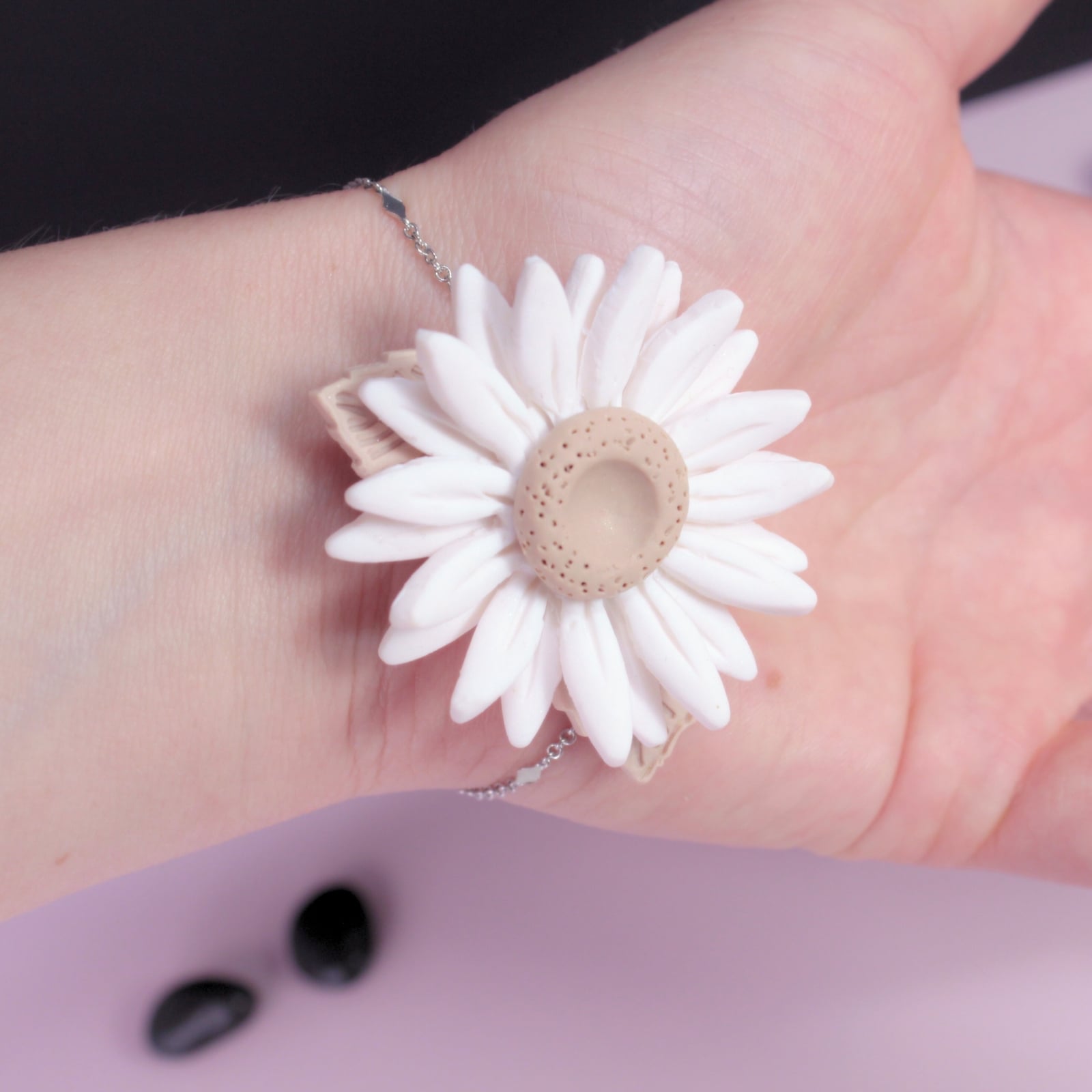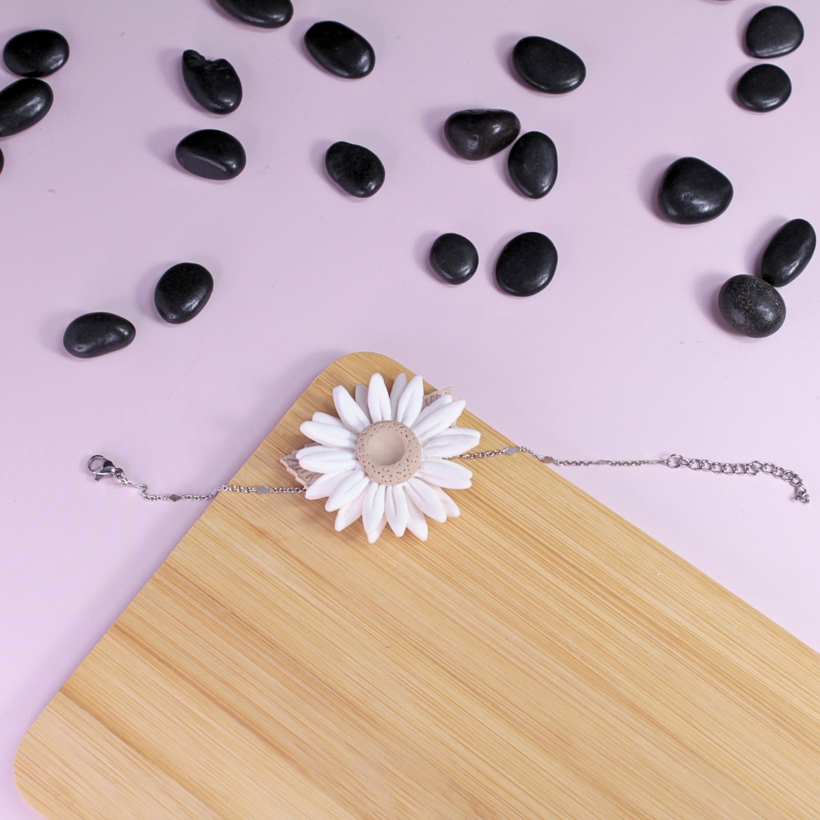 Brățara „Flori de Mușețel” aduce un strop de prospețime și delicatețe în orice ținută.