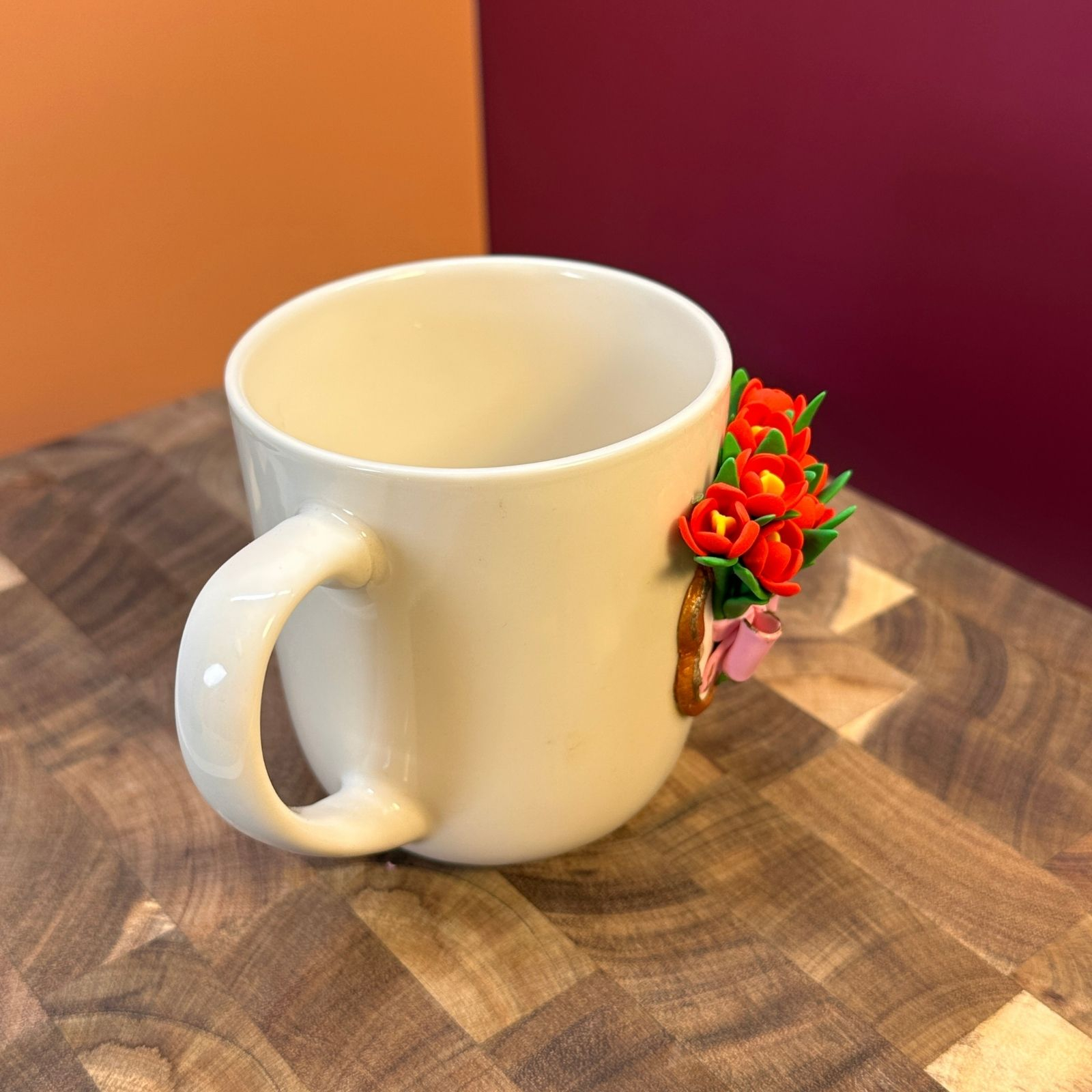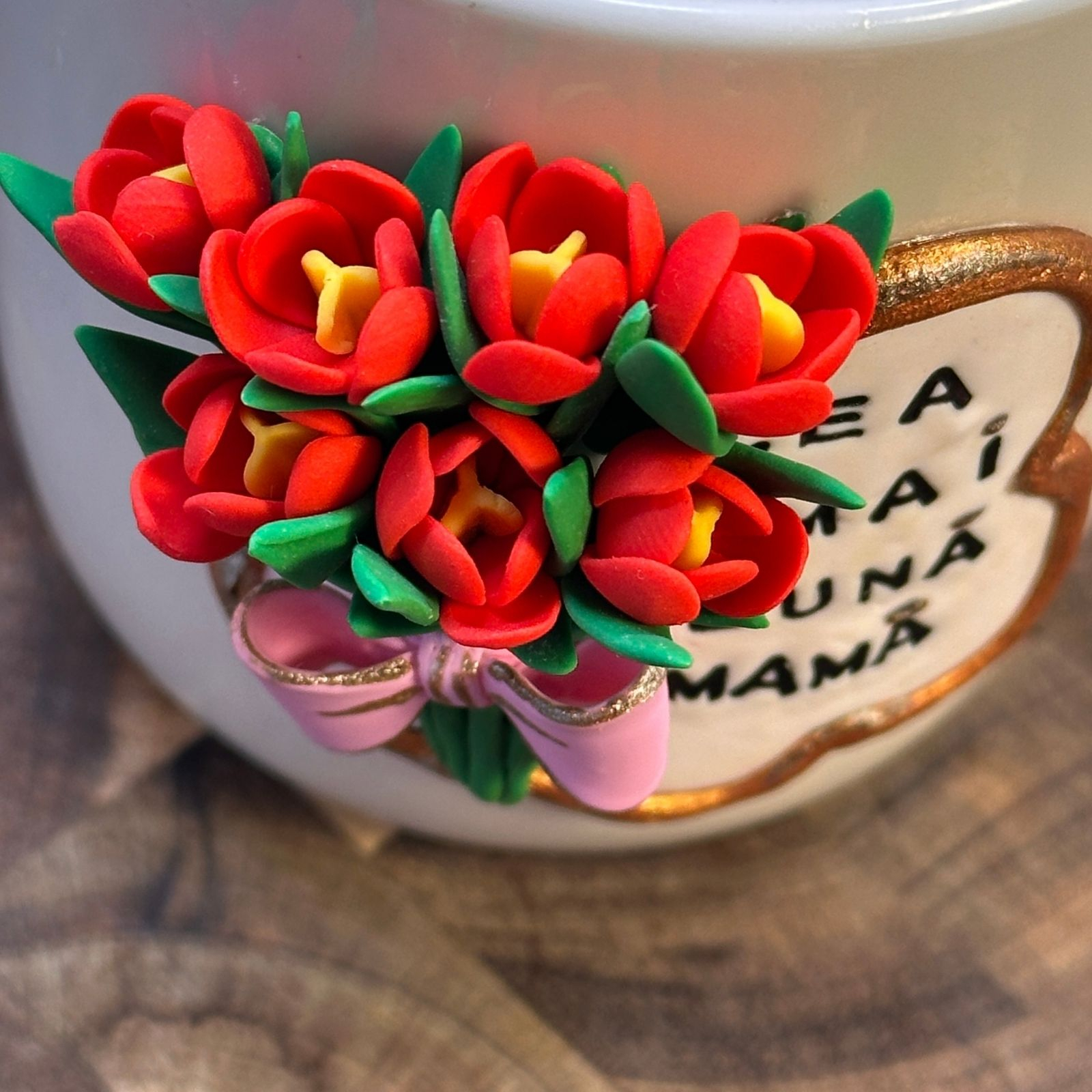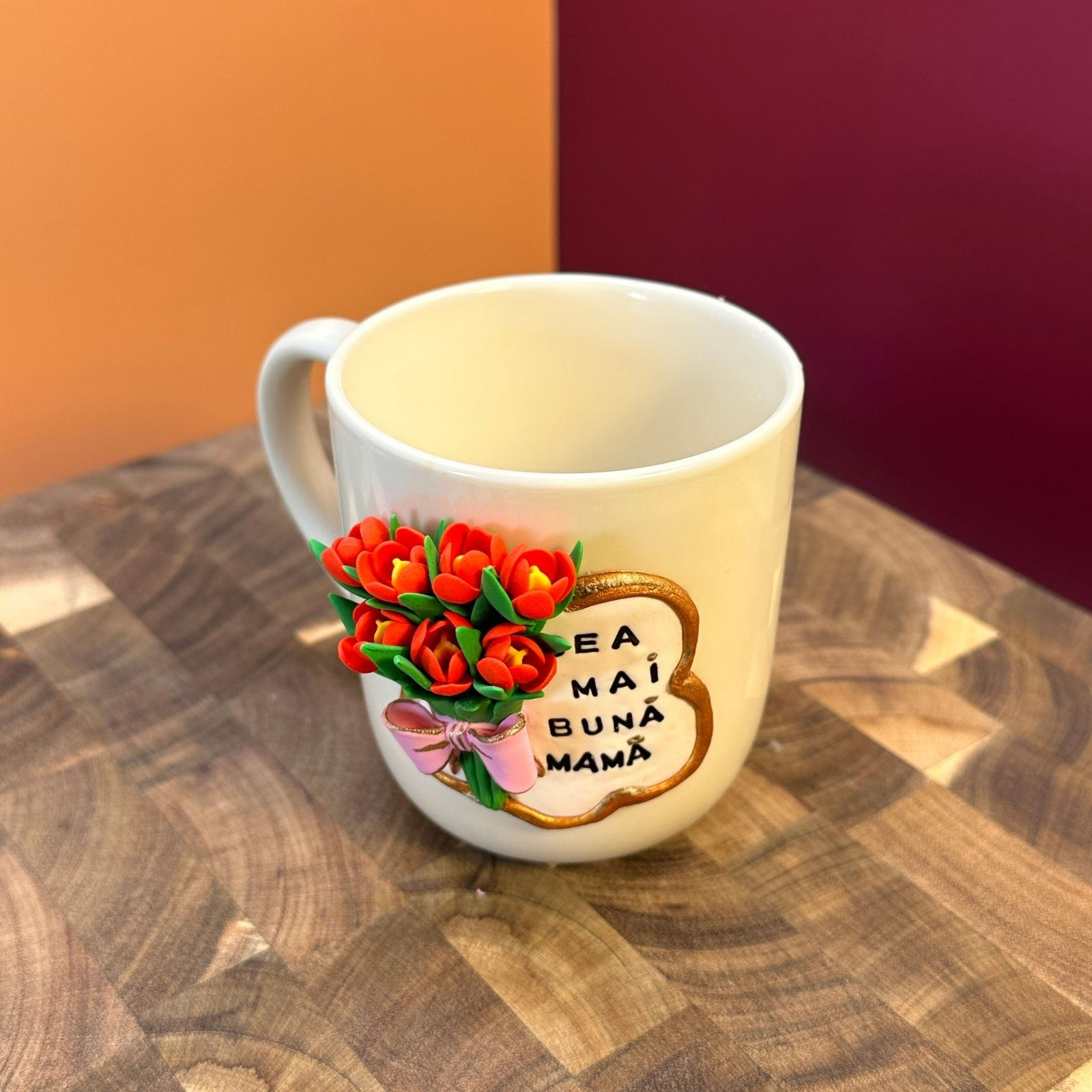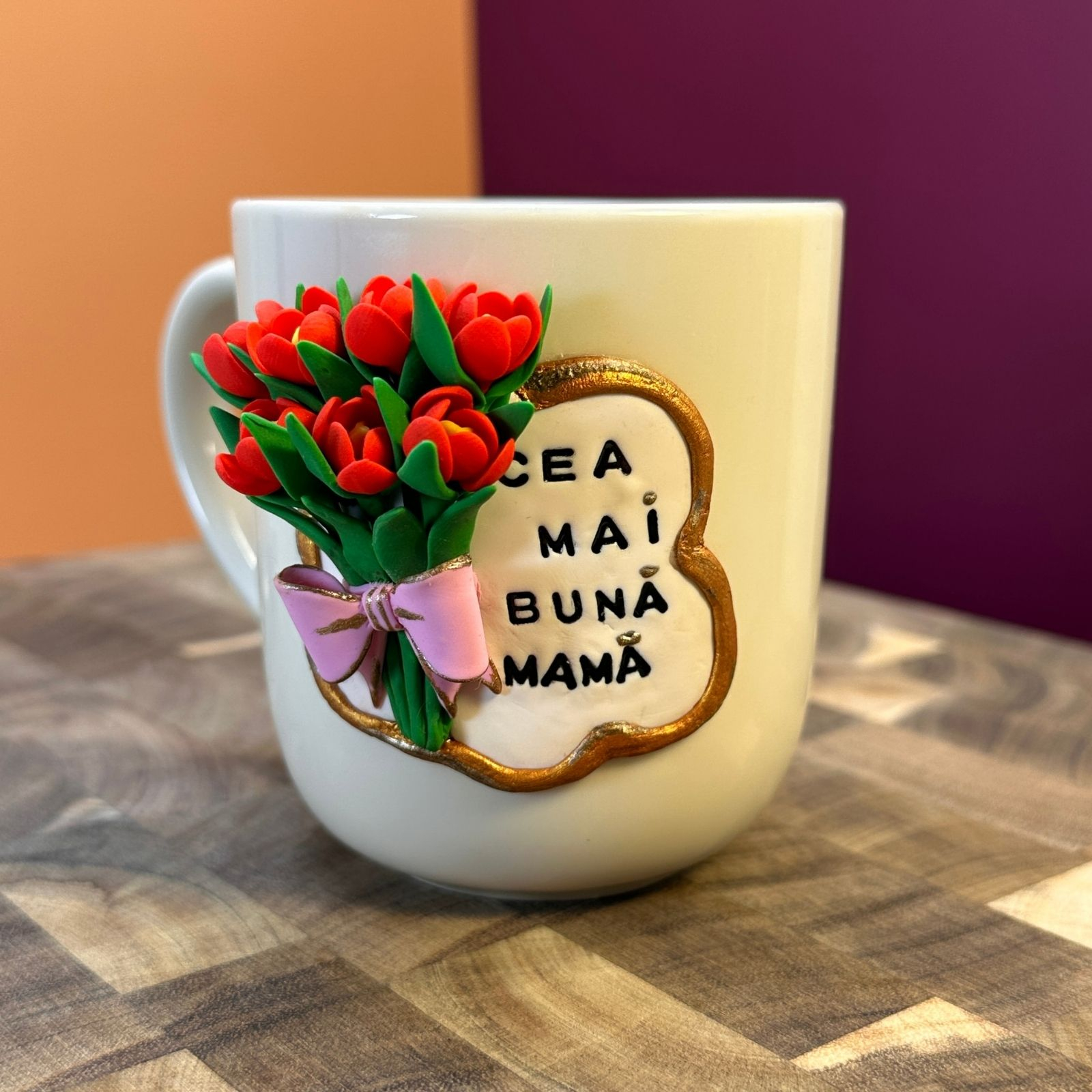 Cană din ceramică, decorată manual cu lalele înflorite din lut polimeric, atent modelate petală cu petală, și însoțită de mesajul „Cea mai bună mamă”. Un design delicat, plin de sensibilitate, creat pentru a transmite iubire, recunoștință și apreciere.