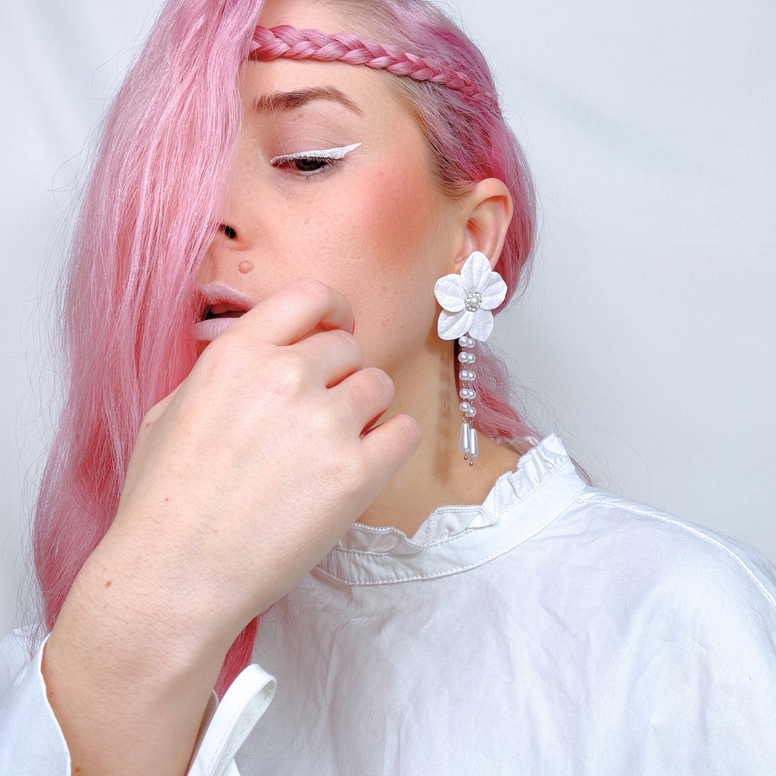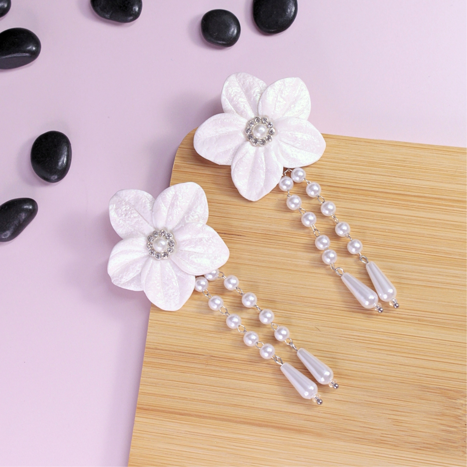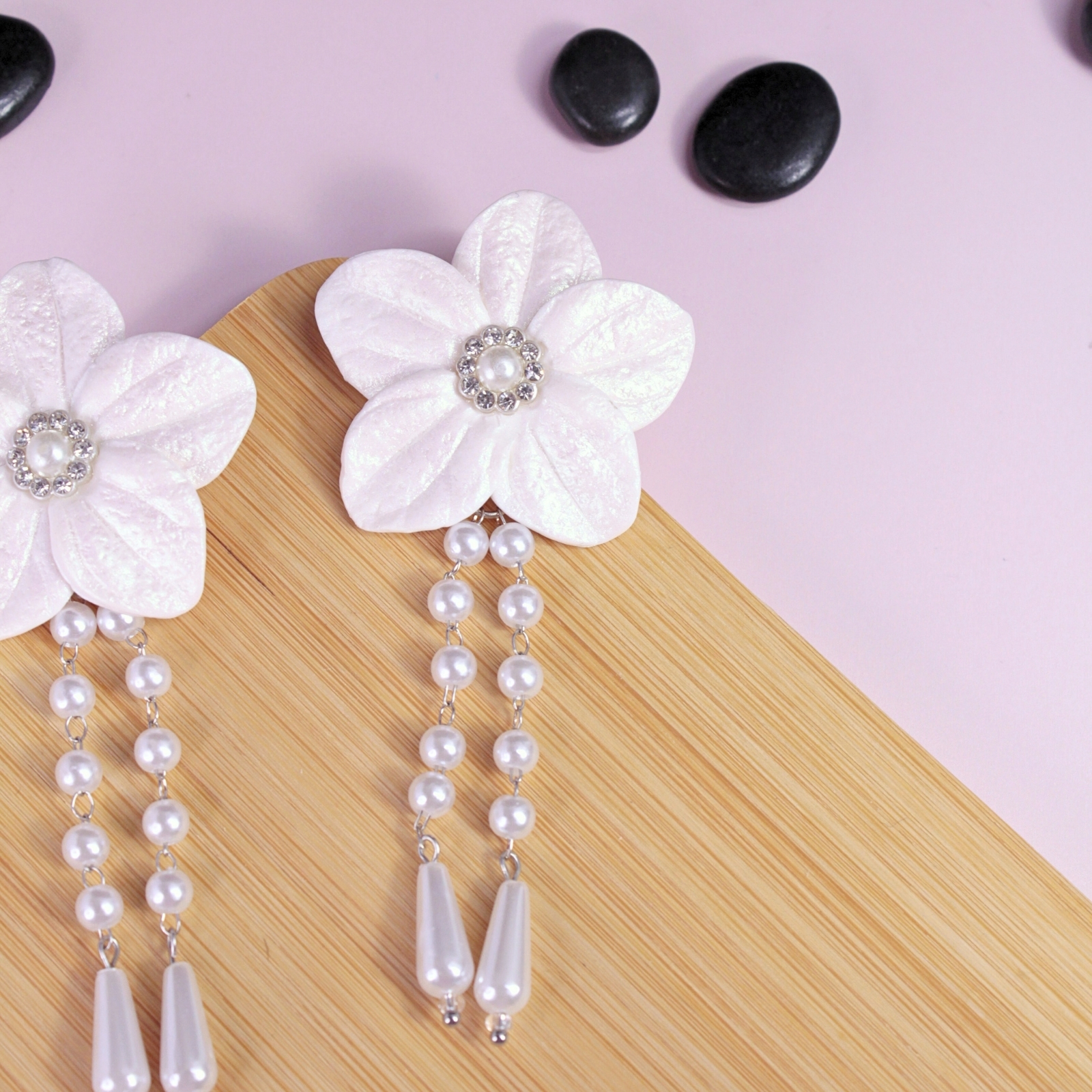 O mică floare sidefată prinde viață în acești cercei, iar perlele care „curg” elegant sub ea par să continue povestea ca o tulpină grațioasă. Forma lor feminină și detaliul rafinat din centrul florii aduc o notă de delicatețe, iar albul sidefat le oferă o strălucire luminoasă, subtilă.