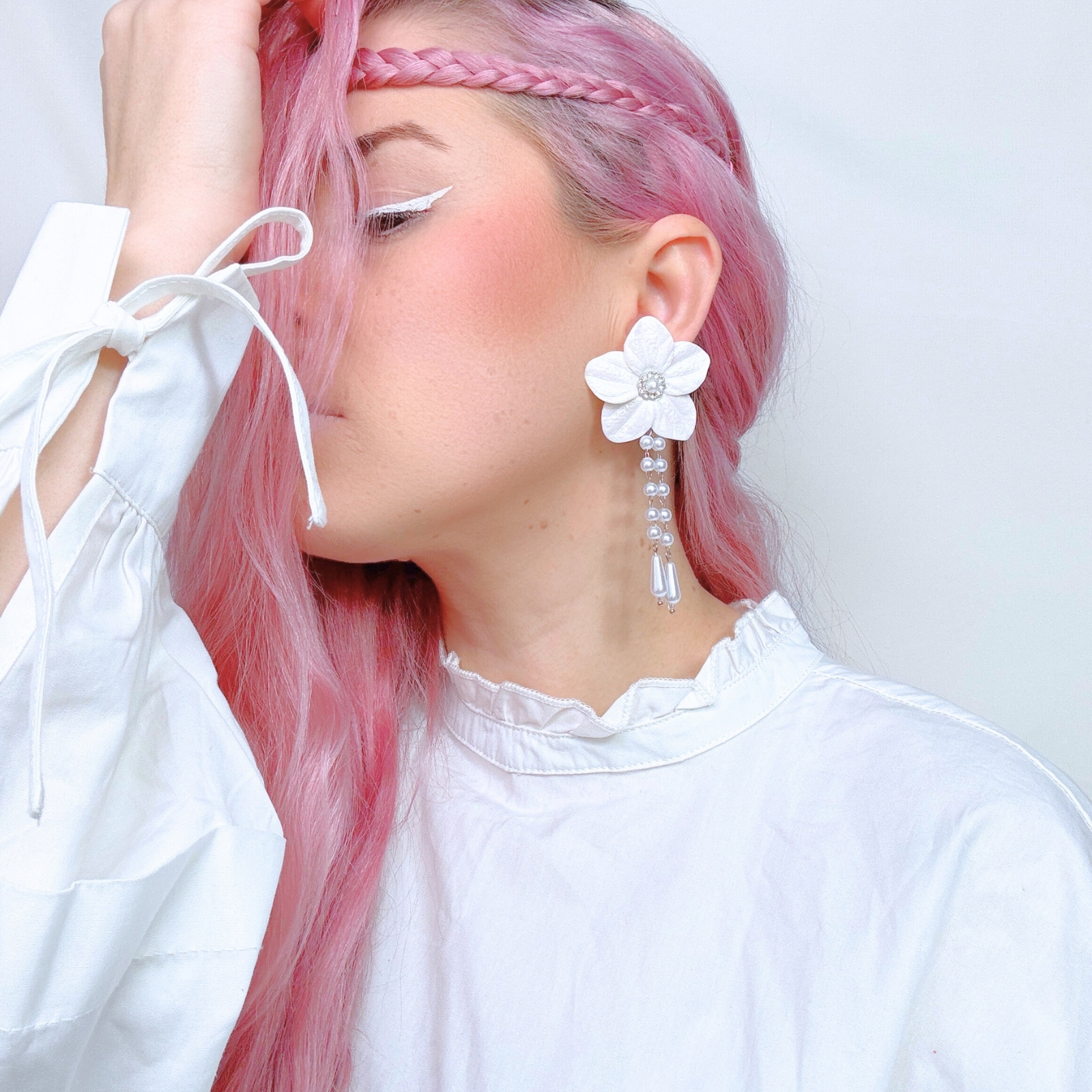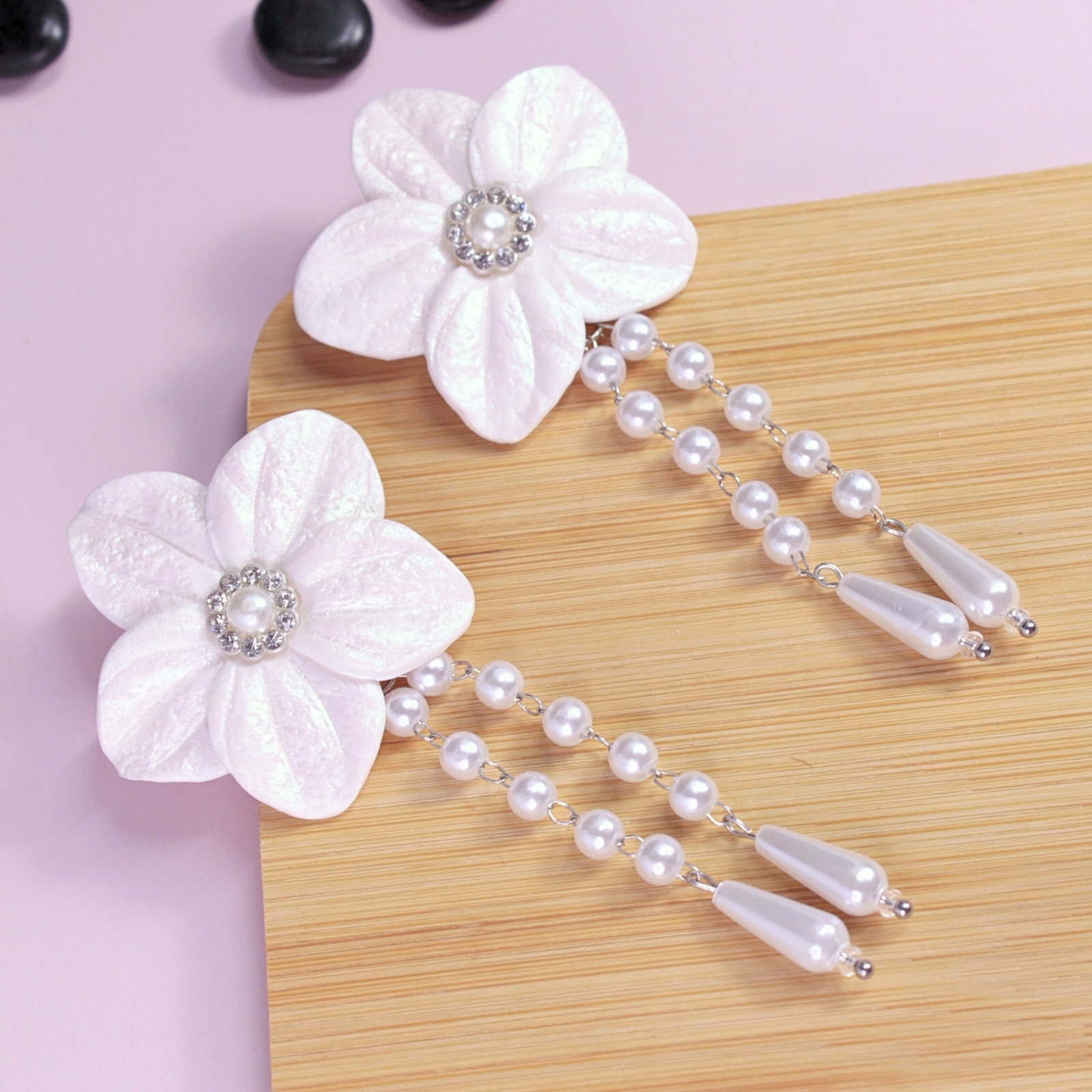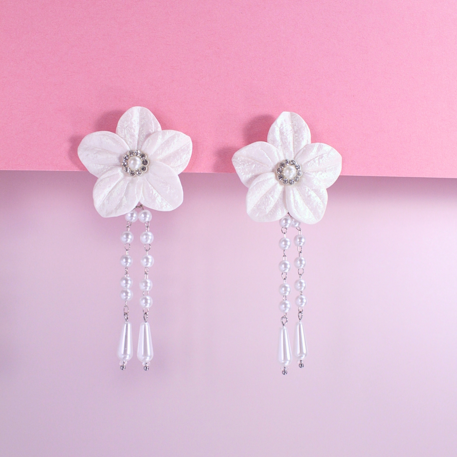 O mică floare sidefată prinde viață în acești cercei, iar perlele care „curg” elegant sub ea par să continue povestea ca o tulpină grațioasă. Forma lor feminină și detaliul rafinat din centrul florii aduc o notă de delicatețe, iar albul sidefat le oferă o strălucire luminoasă, subtilă.