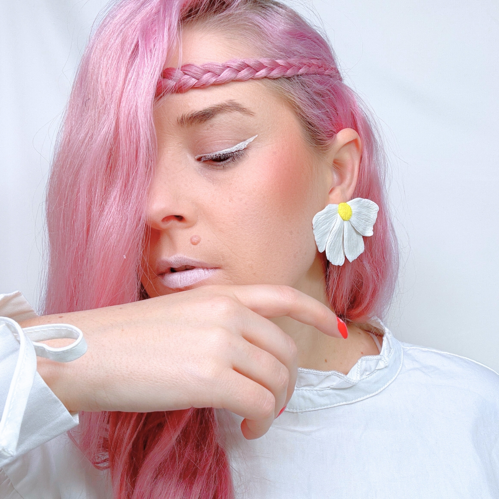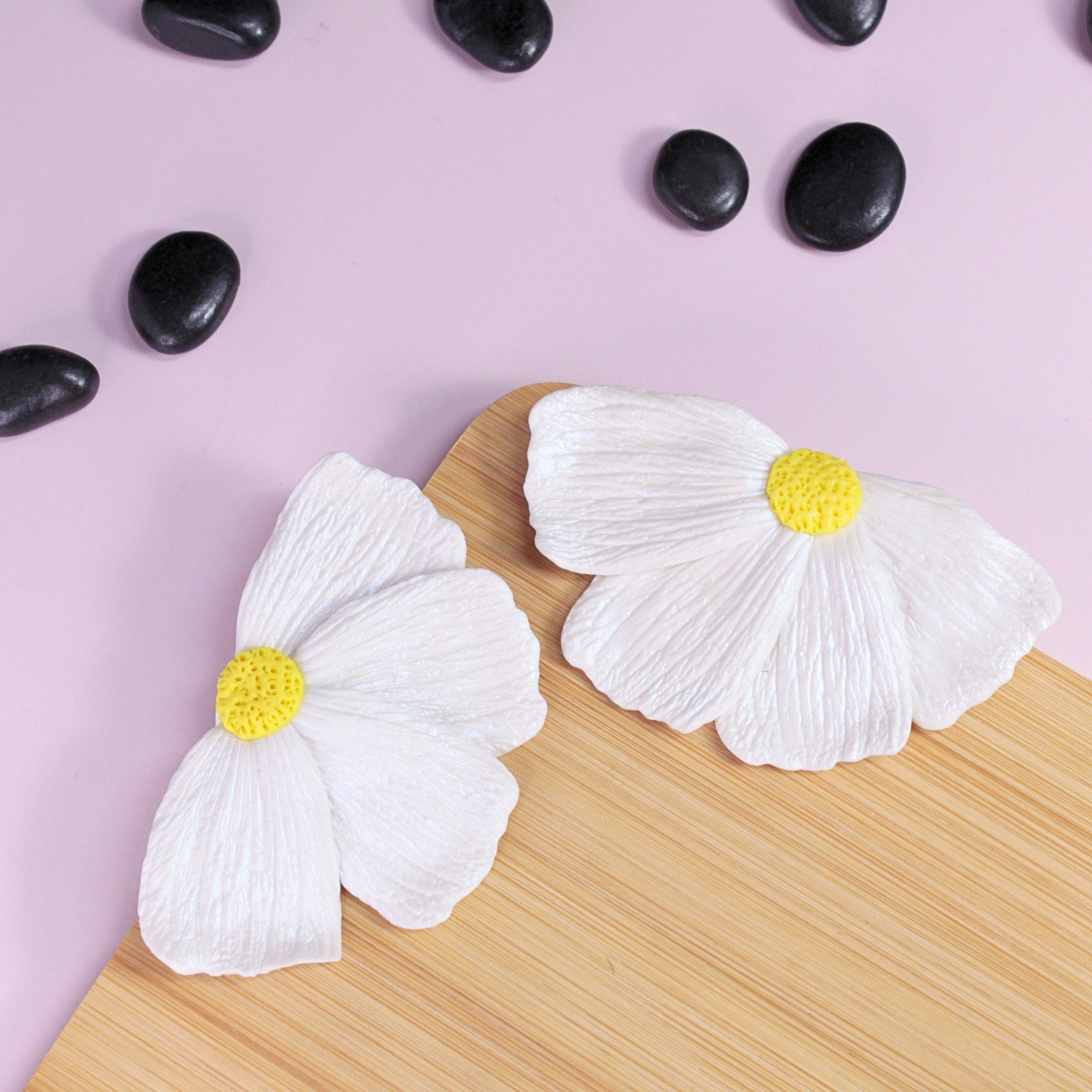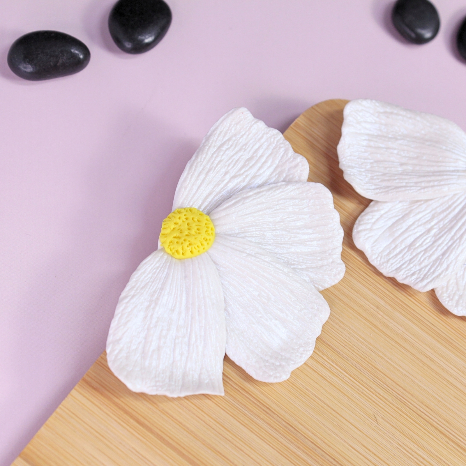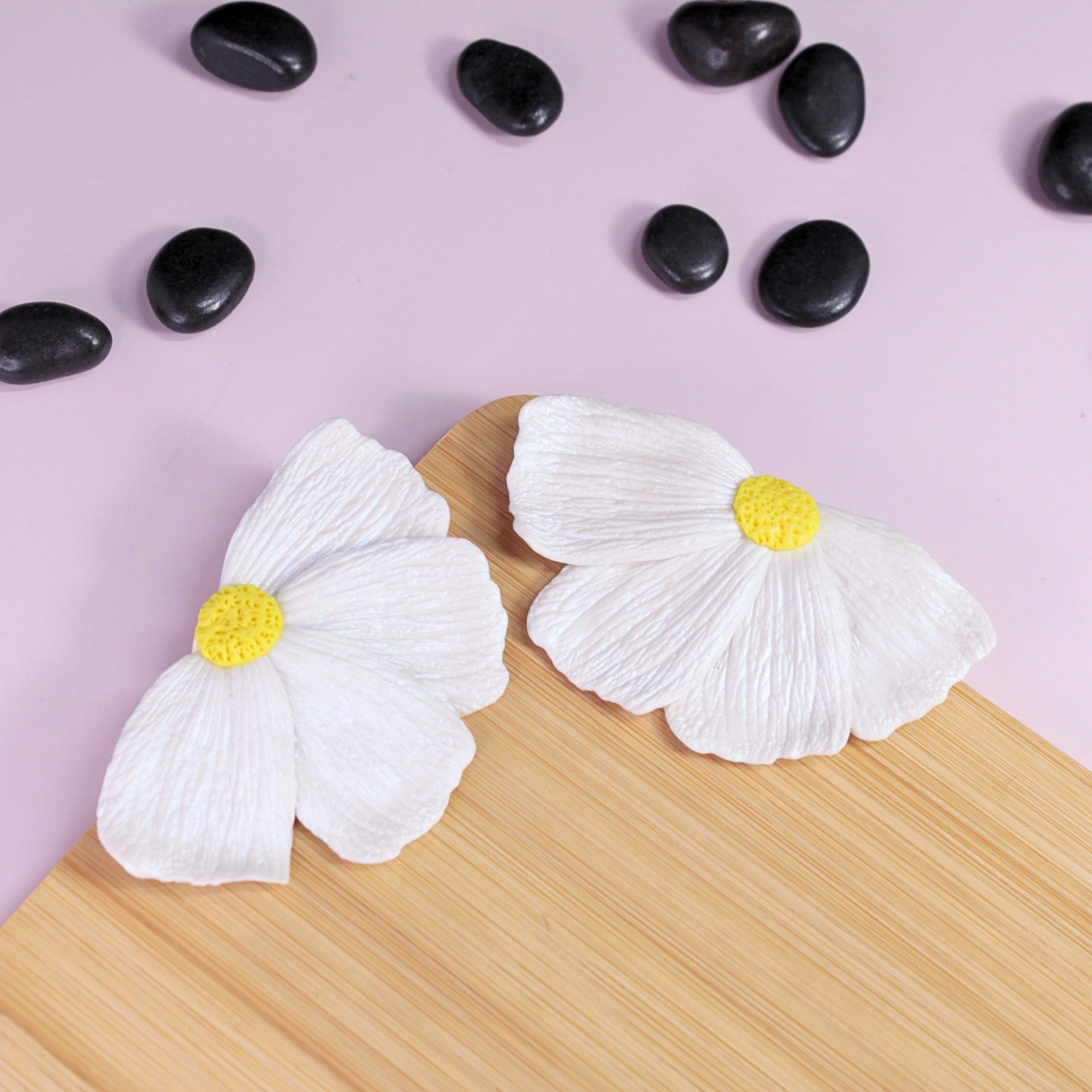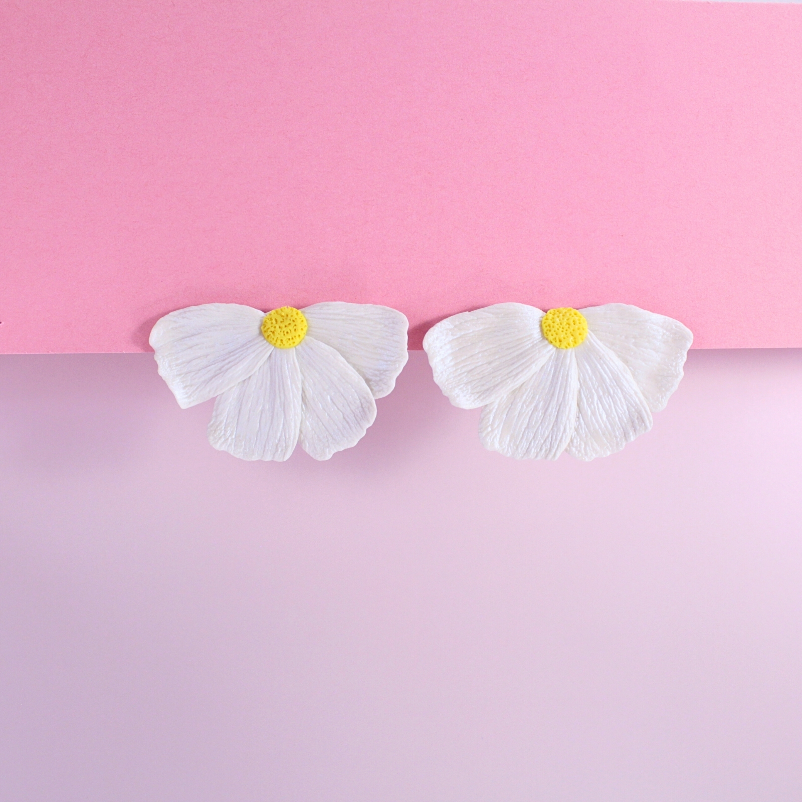 Gingașe și luminoase, aceste jumătăți de floare par să fure un strop din magia unui câmp scăldat în soare. Cele patru petale voluminoase, albe și sidefate, se așază frumos pe ureche și radiază o delicatețe care te duce imediat cu gândul la natură, la liniște și la aer proaspăt.