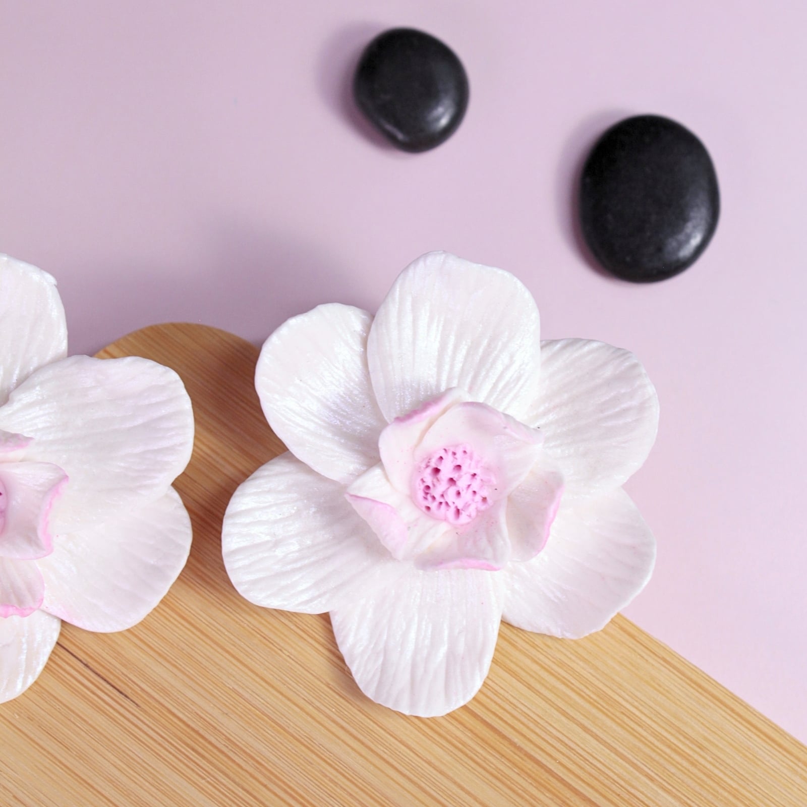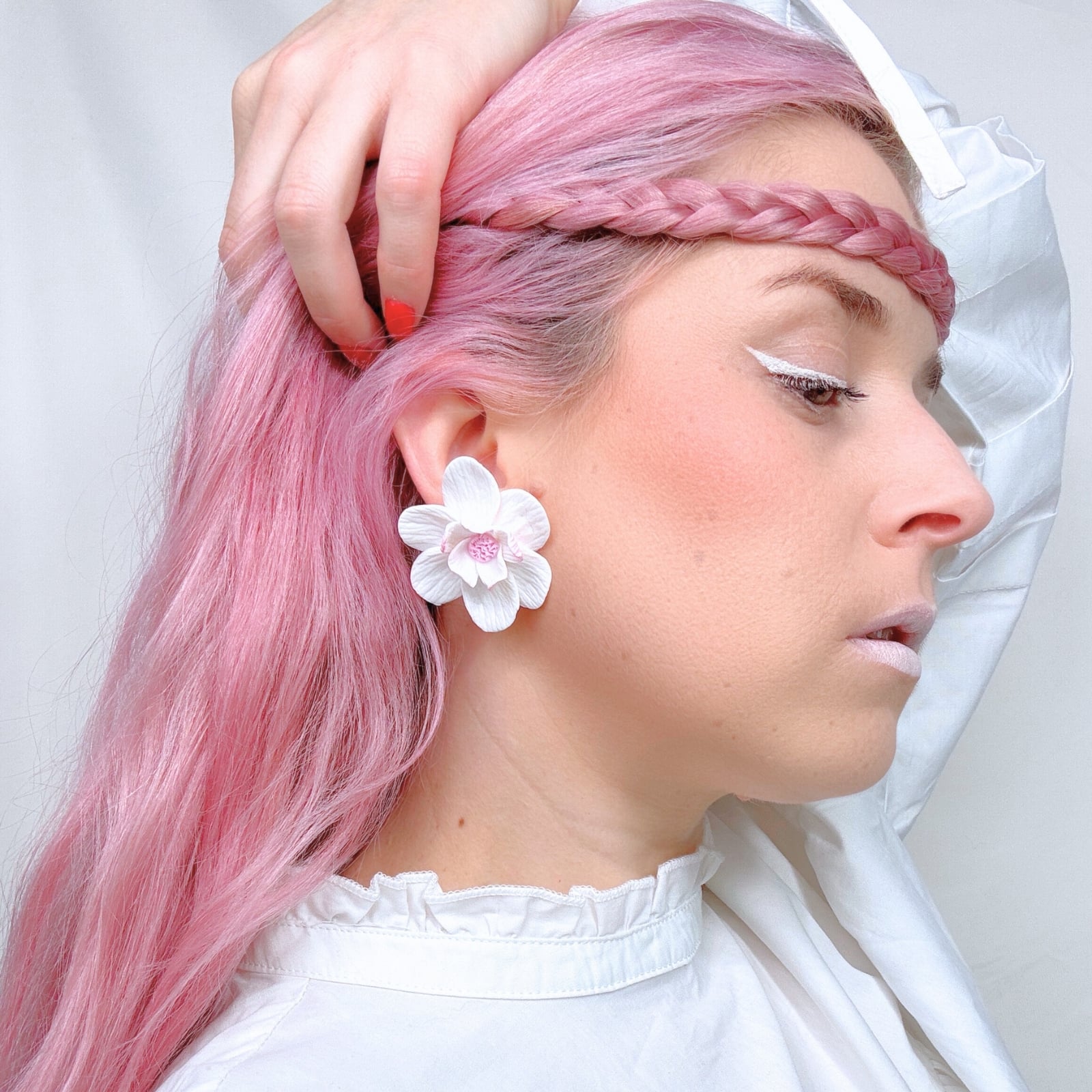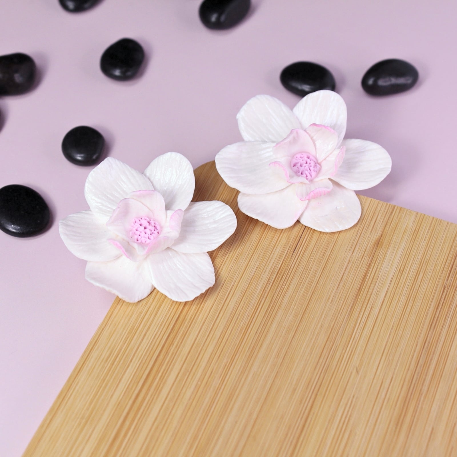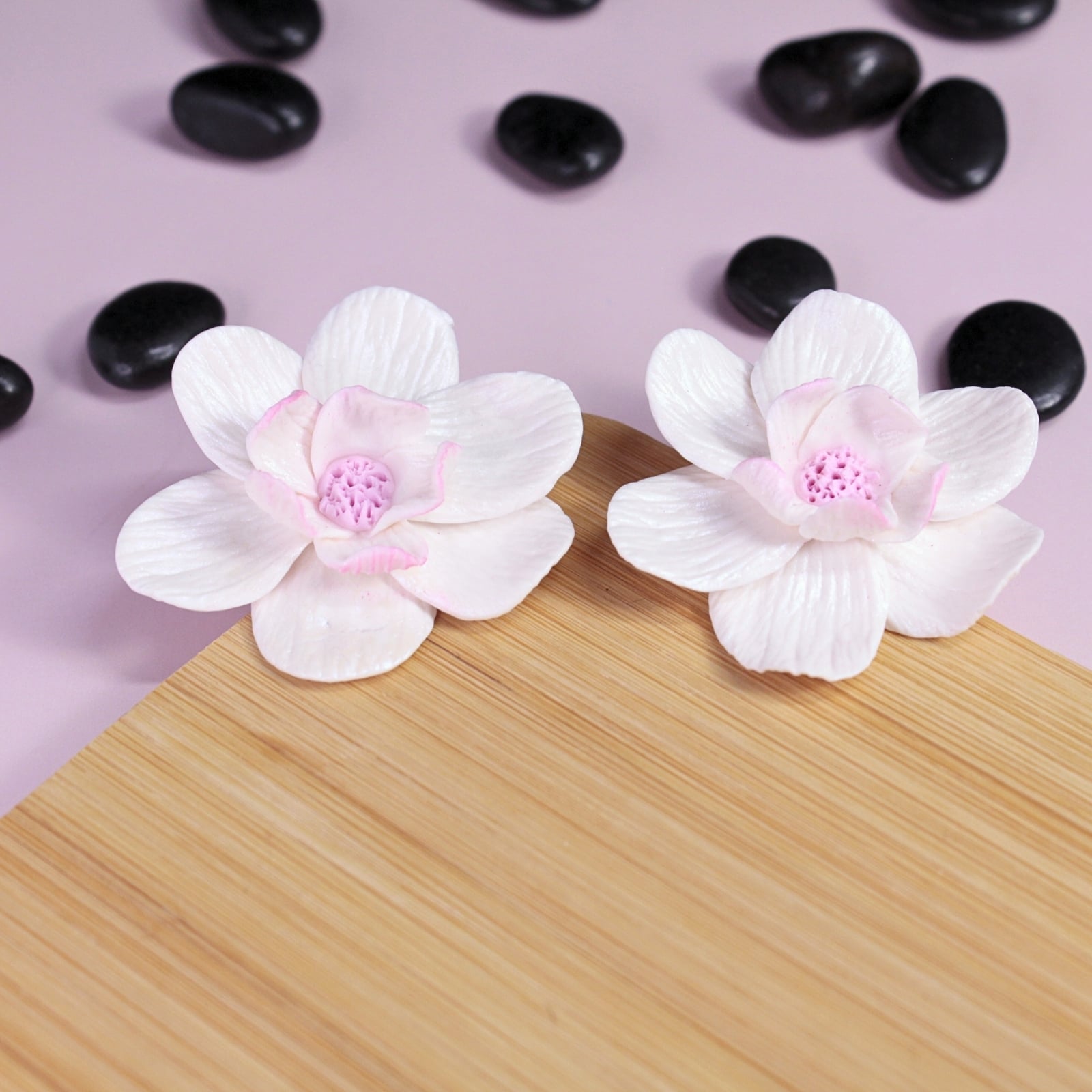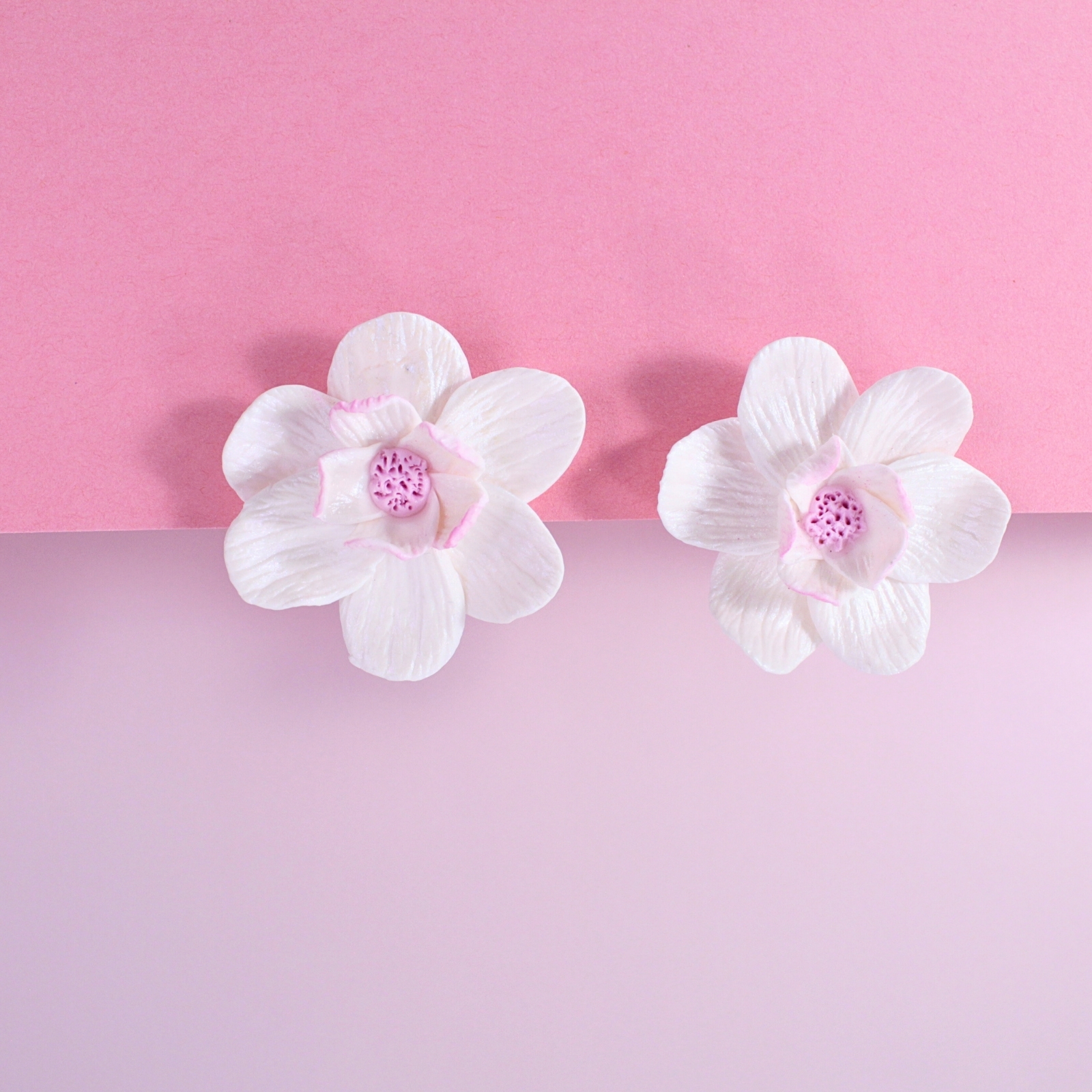 Încântă privirile cu acești cercei în formă de floare, modelată manual petală cu petală. Petalele albe, strălucitoare, cu un subtil efect sidefat și un strop delicat de roz, creează un efect surprinzător și rafinat.