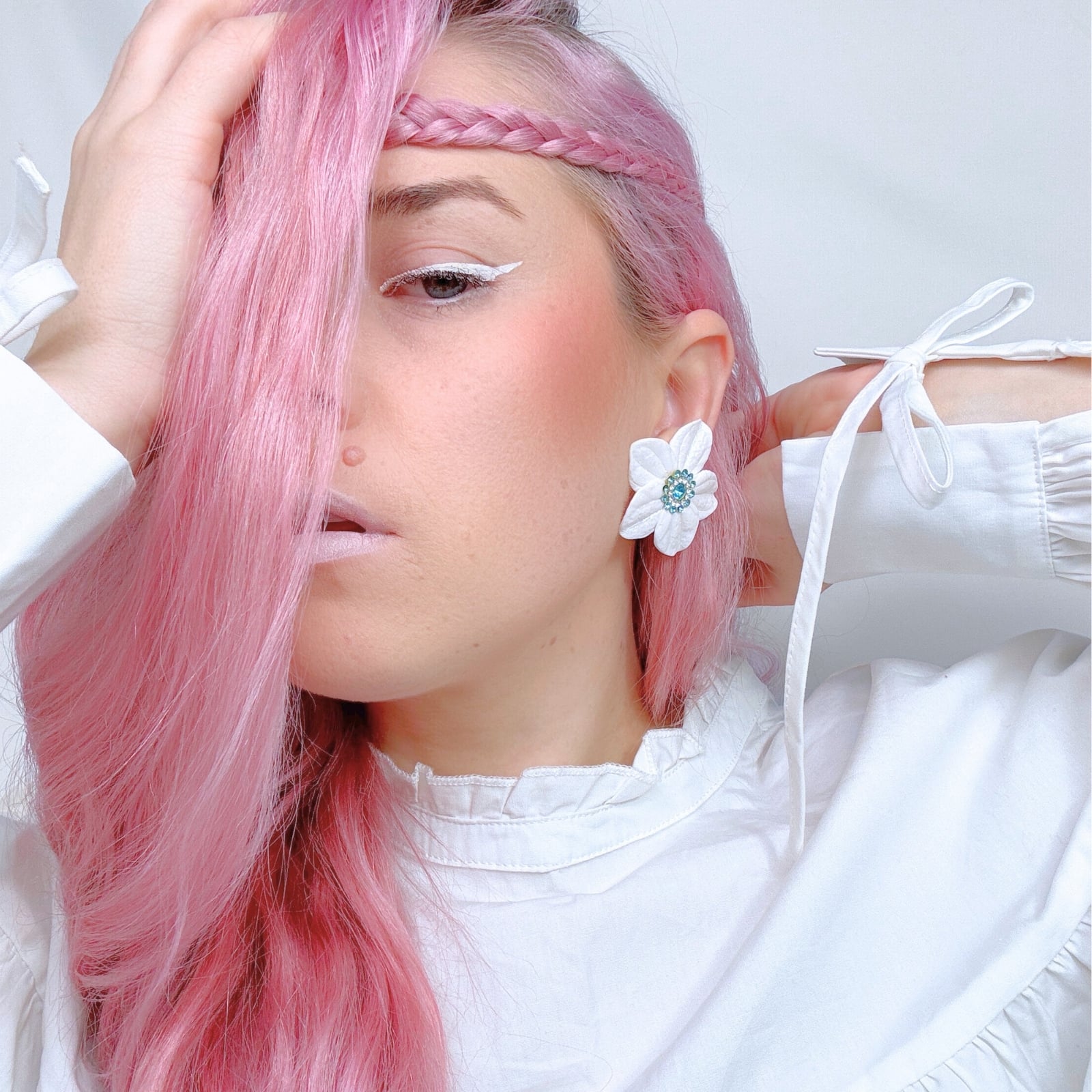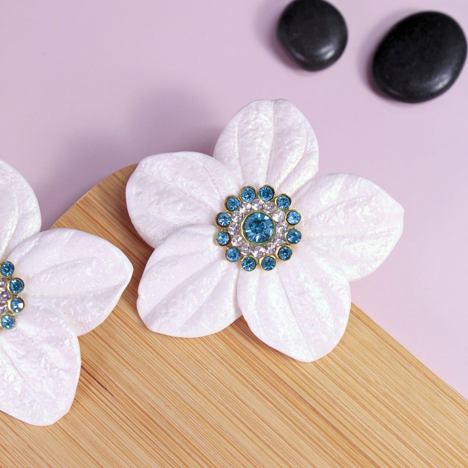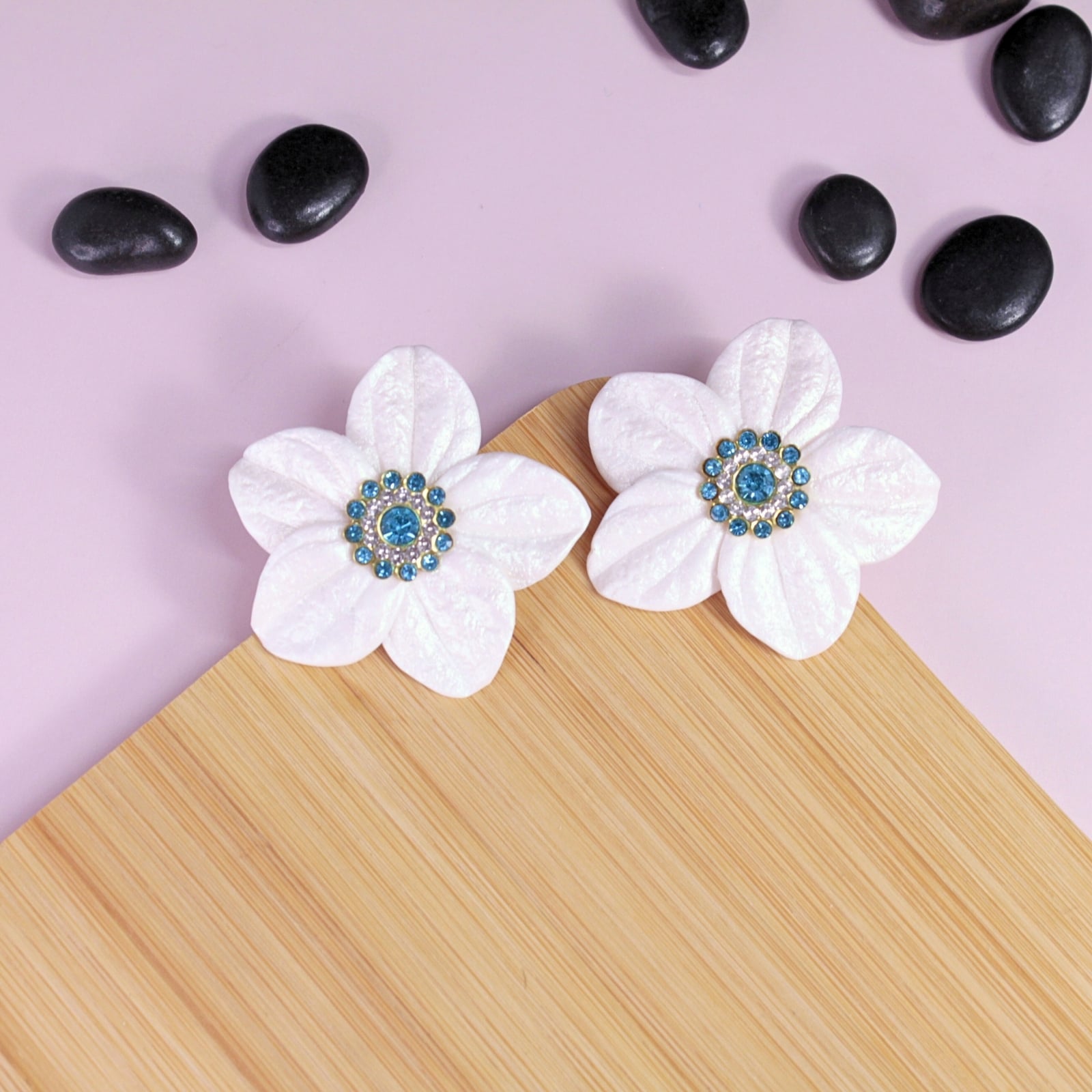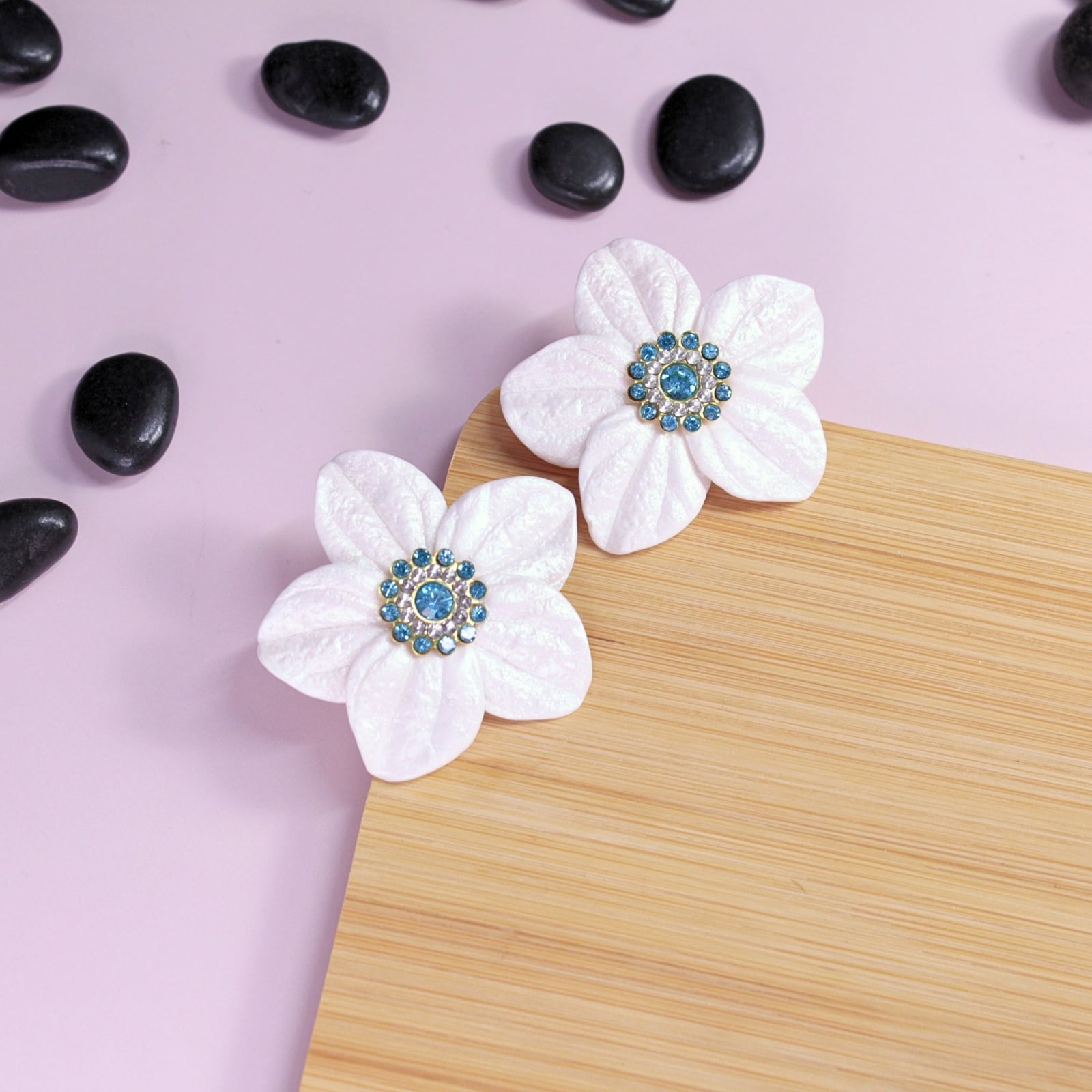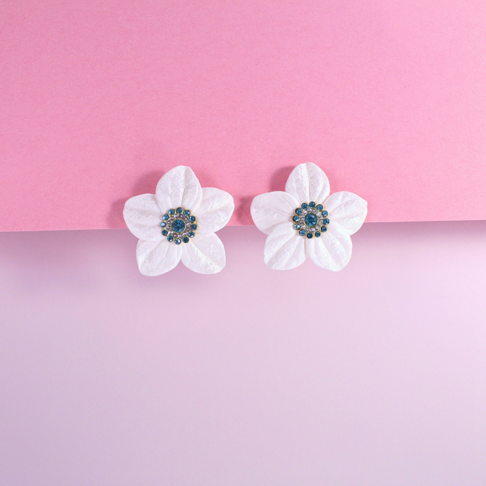 Fiecare detaliu contează cu acești cercei în formă de floare, modelată manual petală cu petală. Petalele albe, strălucitoare, cu un subtil efect sidefat și un strop delicat de albastru, creează un efect surprinzător și rafinat.