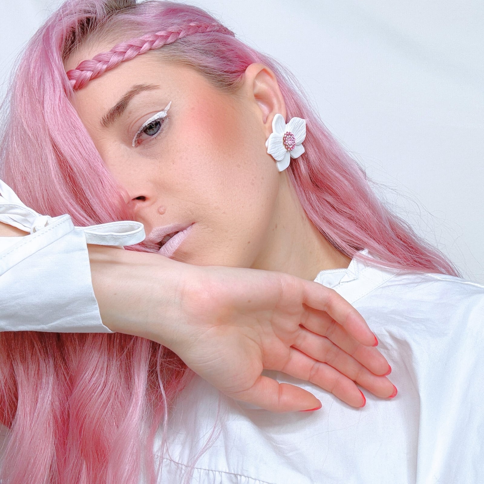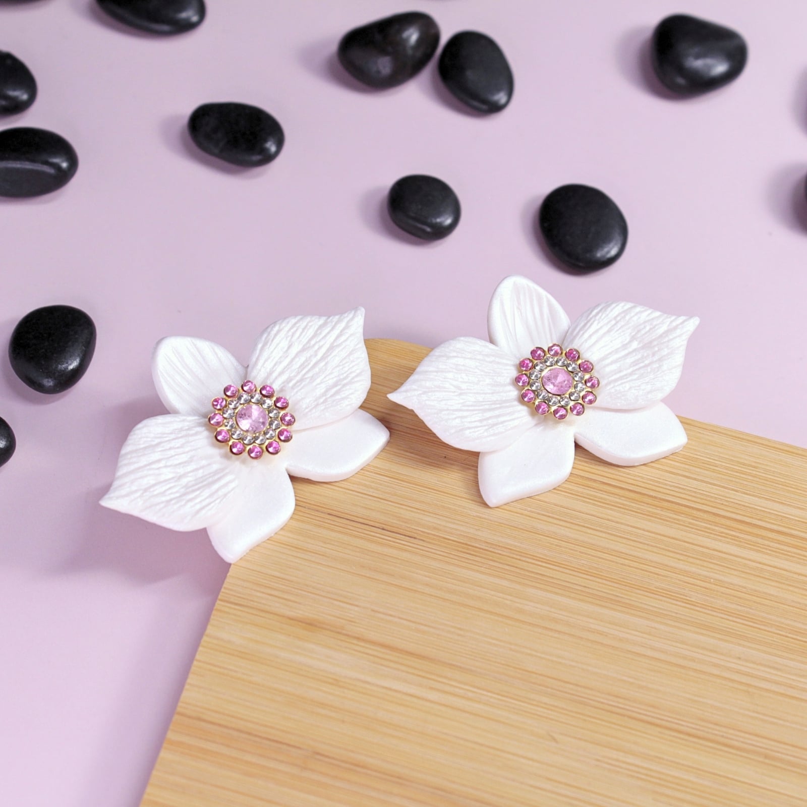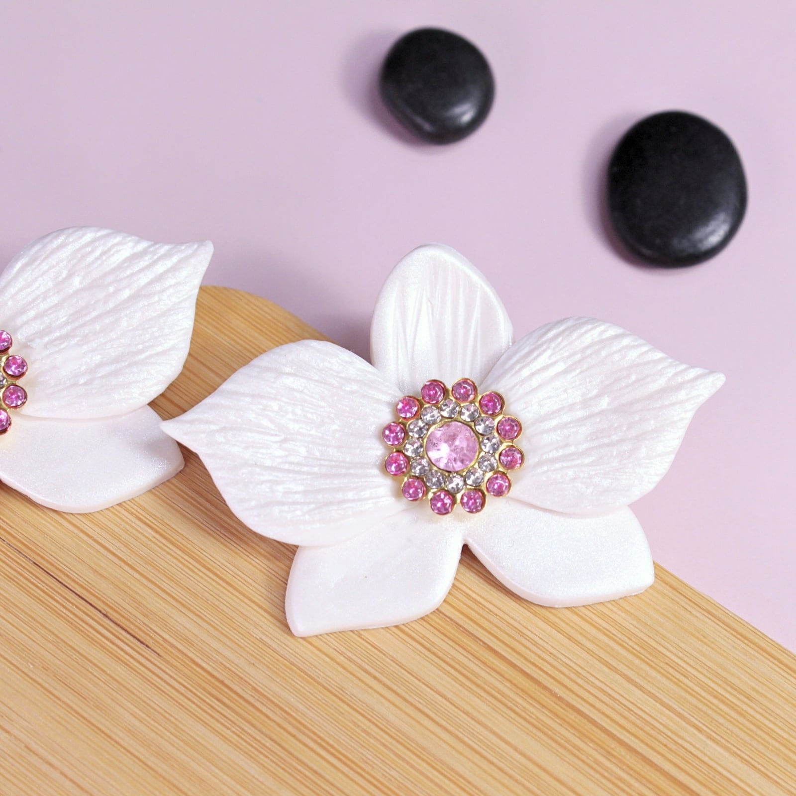 Petalele albe, strălucitoare, sunt completate de un charm roz subtil în centru, adăugând o notă jucăușă și sofisticată în același timp.