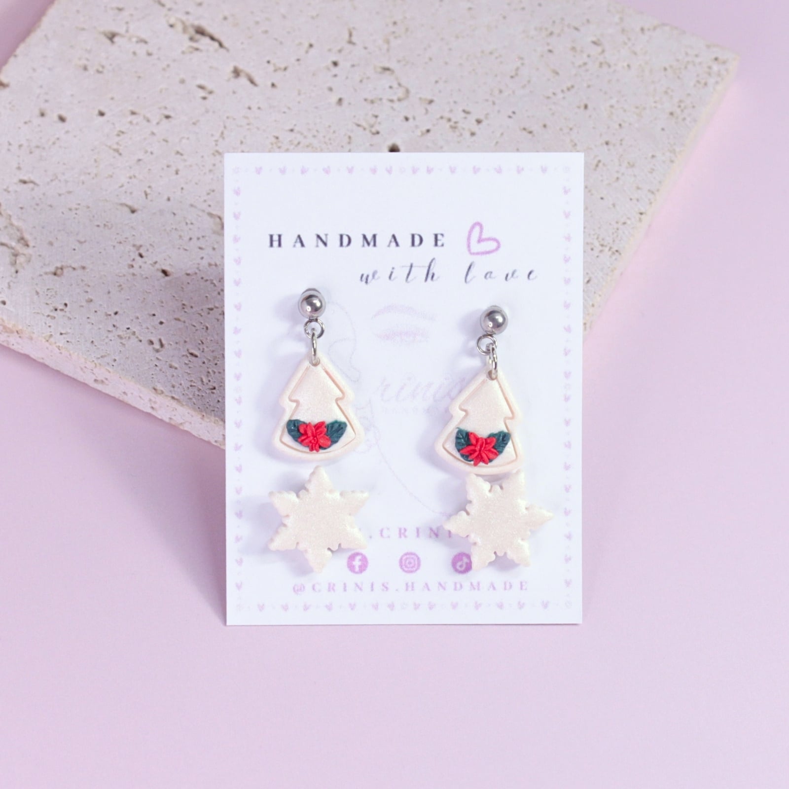 Setul „Frosty Fun” aduce farmecul iernii în cele mai delicate forme! Format din două perechi de cercei tip studs, albi sidefați ce imită strălucirea zăpezii, acest set include o pereche de fulgi de nea și o pereche puțin mai mare cu brăduți albi. Simpli, eleganți și adorabili, acești cercei sunt perfecți pentru a completa orice ținută de sezon sau pentru a fi oferiți cadou. Fiecare piesă este creată cu grijă în micul nostru atelier, din lut polimeric fin, cu tije din oțel inoxidabil, pentru confort și durabilitate.