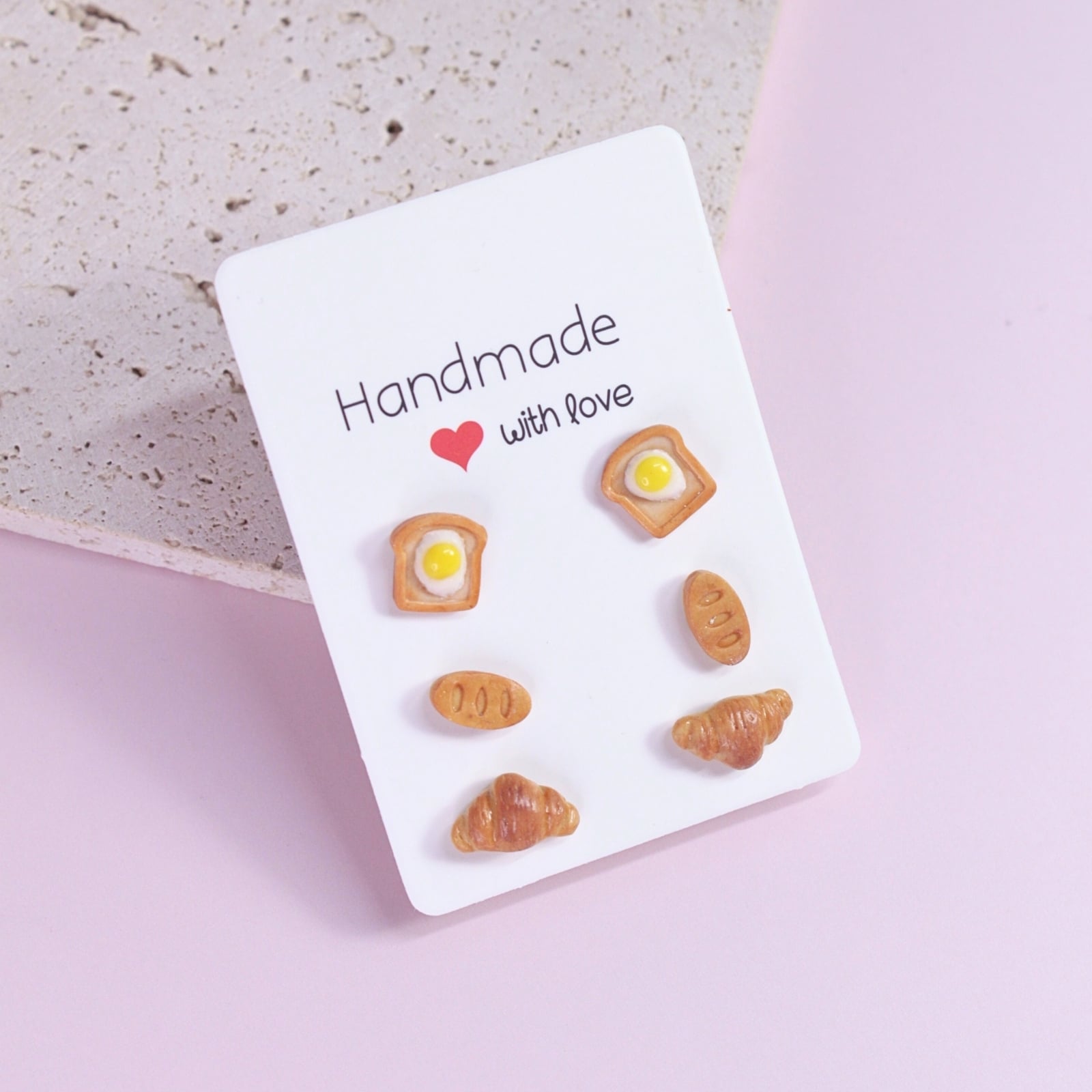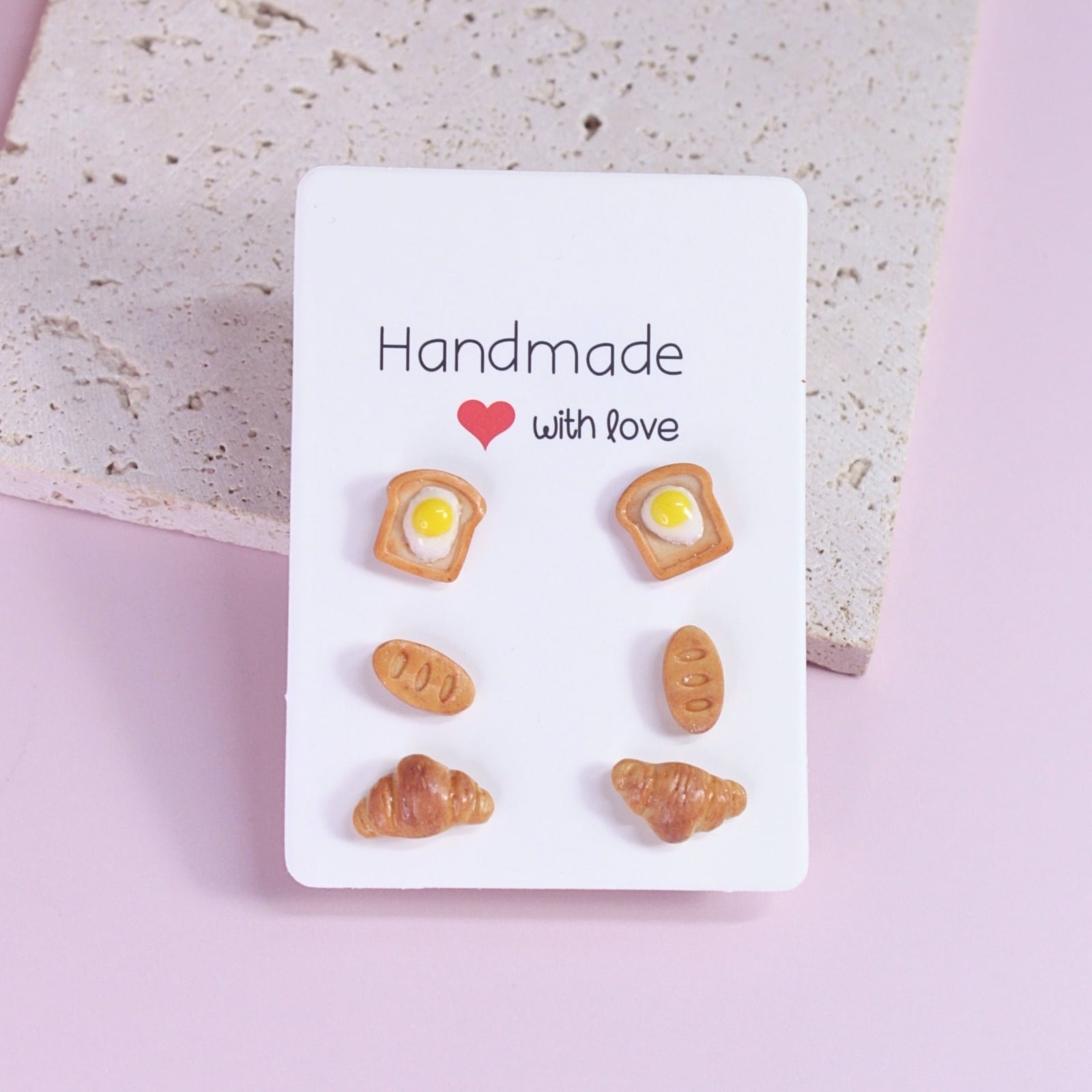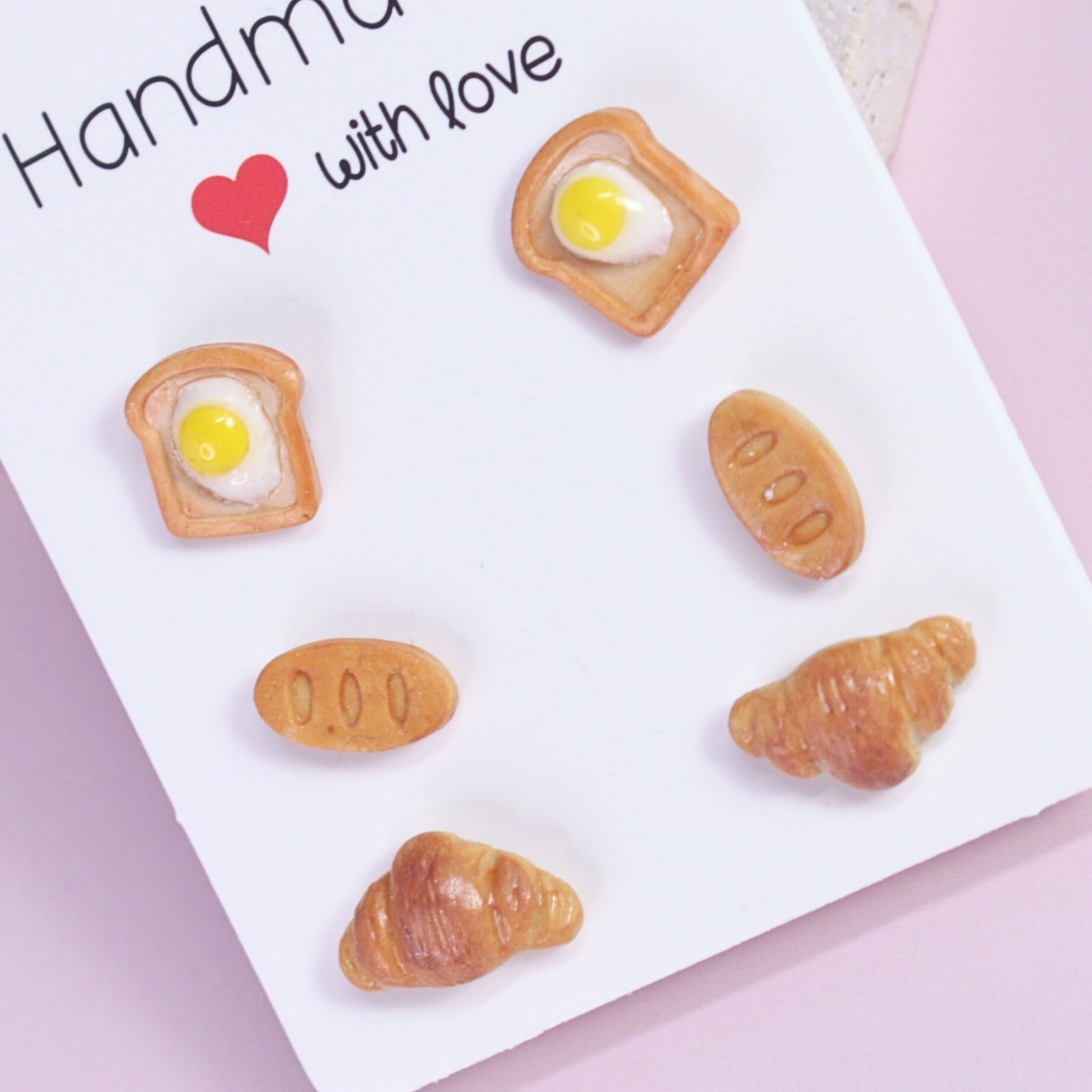Format din trei perechi mici de cercei tip studs – o felie de pâine toast cu ou, un croissant și o mini franzelă – acest set funny și drăgălaș este perfect pentru persoanele nonconformiste care adoră să poarte accesorii originale.