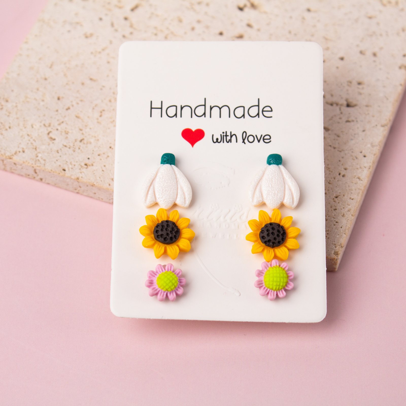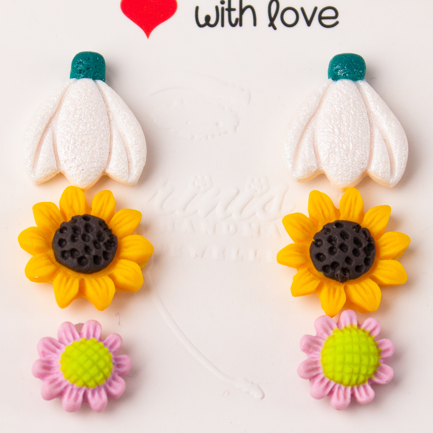 Acest set adorabil de cercei handmade din lut polimeric te va purta cu gândul la primăvară în fiecare zi! Fiecare pereche de cercei este în formă de floare, aducând un strop de prospețime și veselie oricărei ținute. Cu cele trei modele diferite, poți alege varianta perfectă pentru a completa look-ul tău primăvăratic. Bucură-te de frumusețea și delicatețea acestor cercei care aduc cu ei farmecul și prospețimea primăverii!