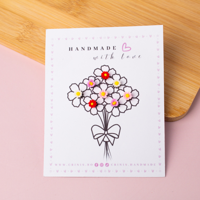 Fiind un produs handmade, pot exista mici imperfecțiuni, fiecare pereche de cercei fiind unică.