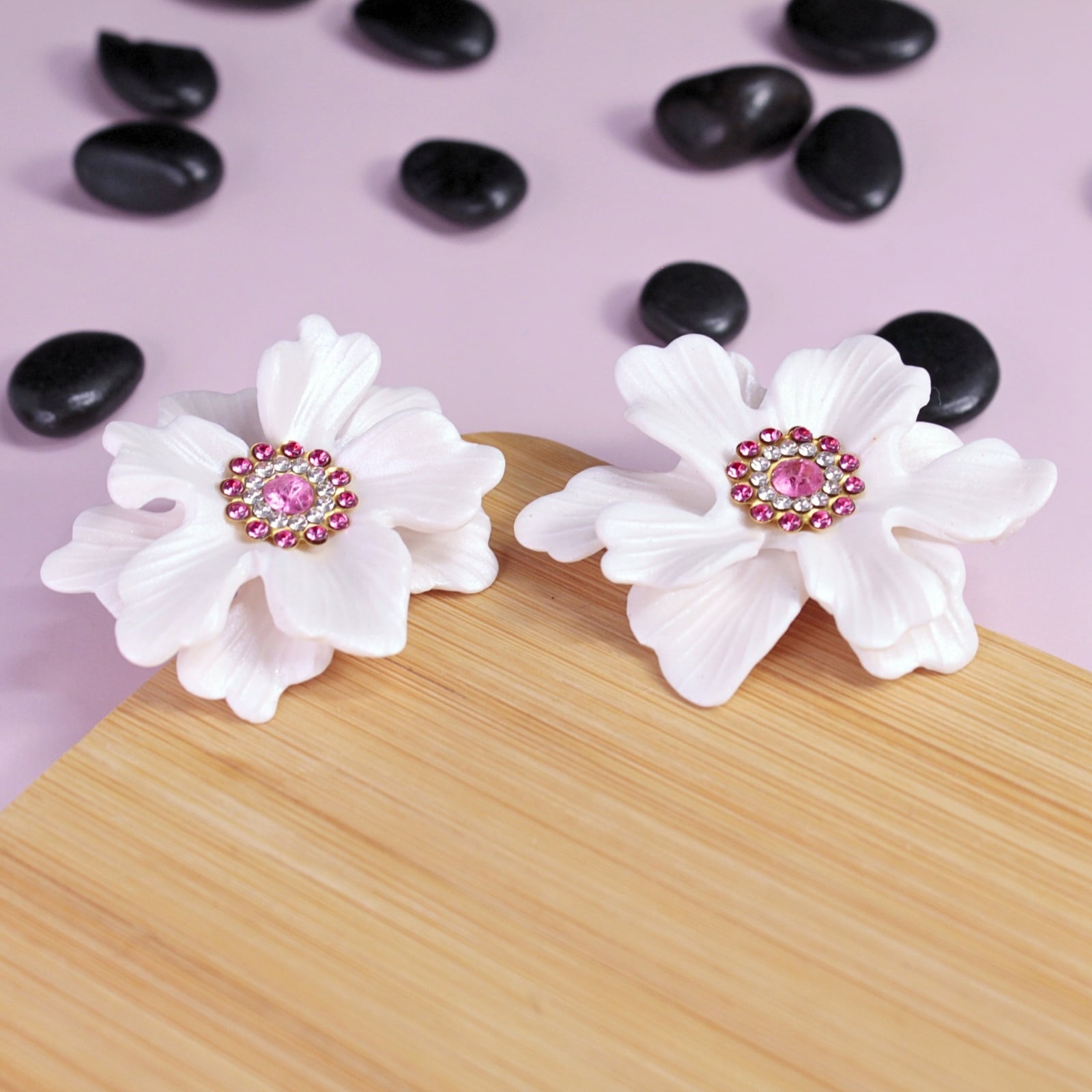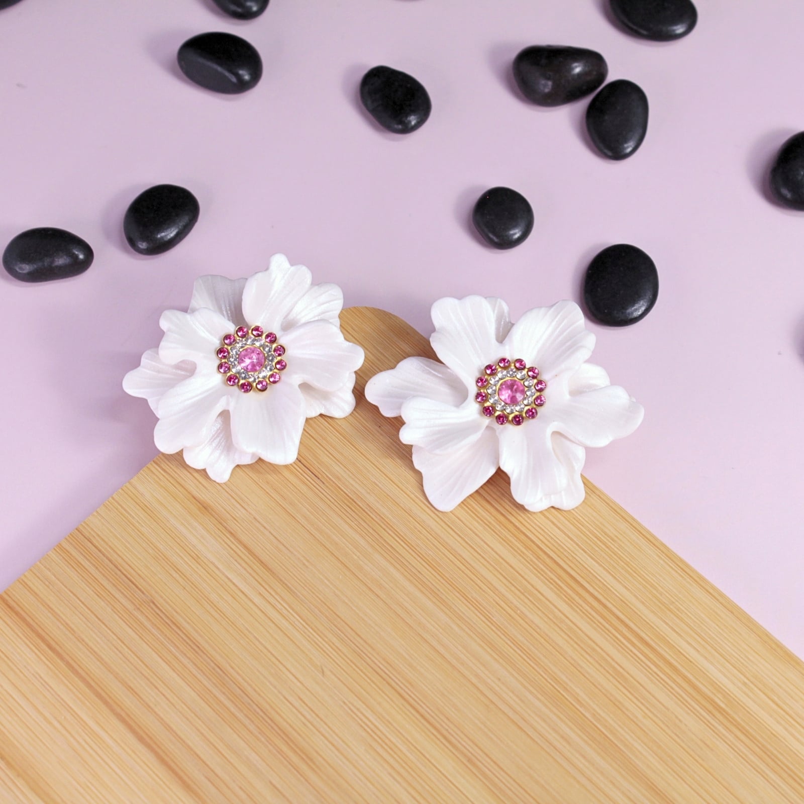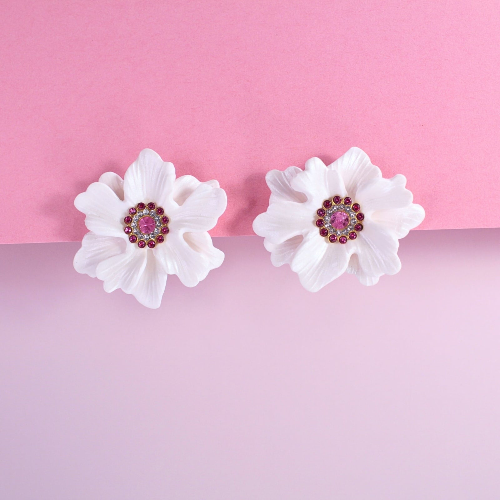 Adaugă o notă delicată și feminină ținutelor tale cu acești cercei în formă de floare gingașă. Petalele albe, cu un subtil finisaj sidefat, reflectă lumina elegant, evidențiindu-se frumos în ureche.