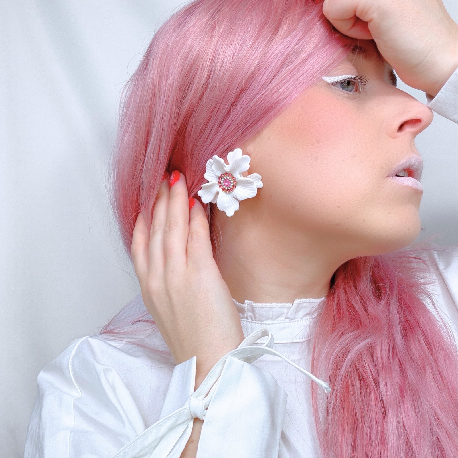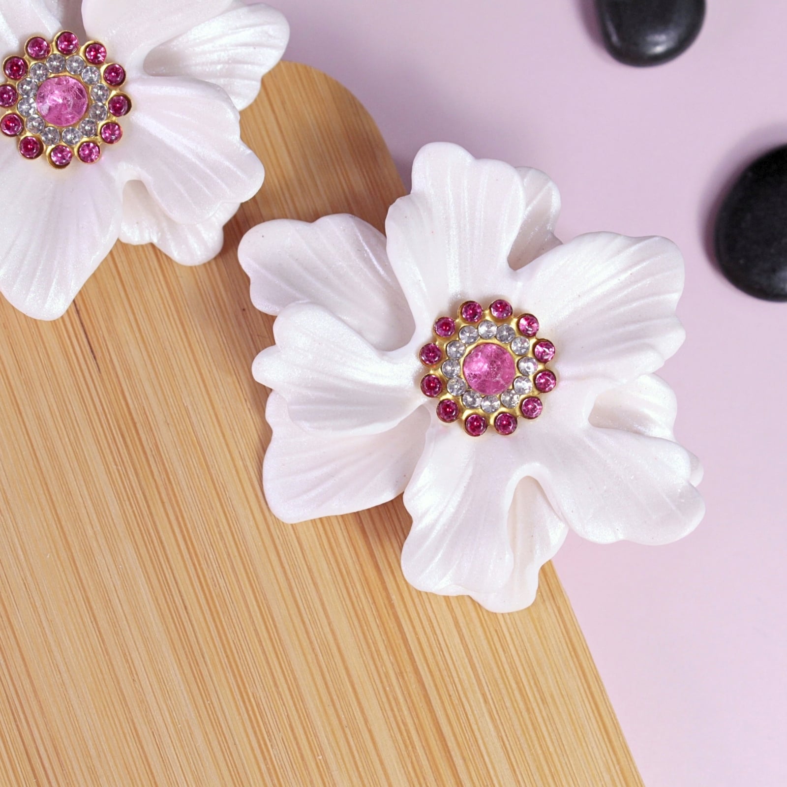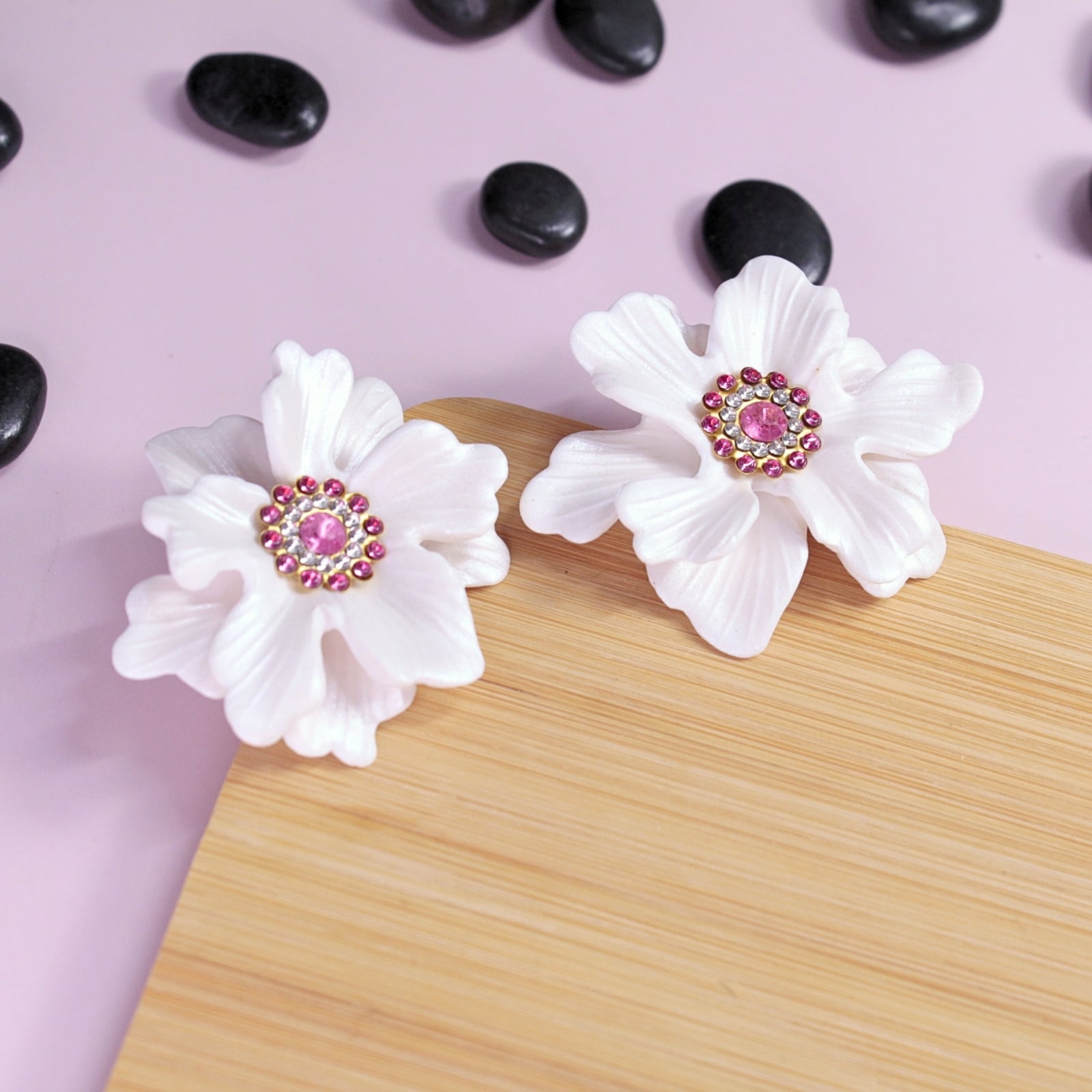 Adaugă o notă delicată și feminină ținutelor tale cu acești cercei în formă de floare gingașă. Petalele albe, cu un subtil finisaj sidefat, reflectă lumina elegant, evidențiindu-se frumos în ureche.
