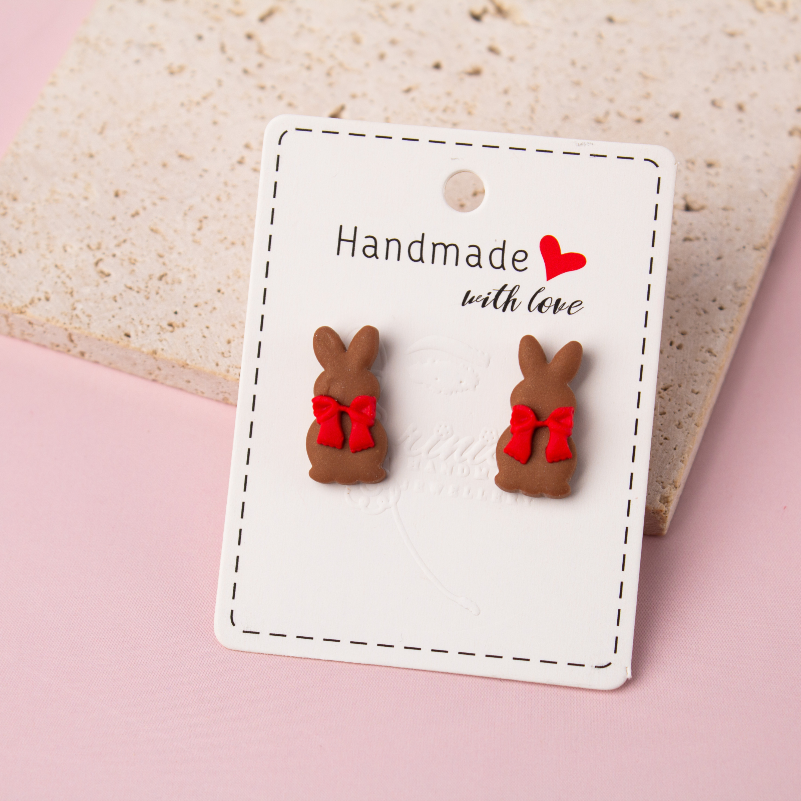 Această pereche de cercei mici din lut polimeric îți aduce aminte de iepurașii de ciocolată din copilărie! Cu un design adorabil, fiecare cercei este o mică bucată de dulceață pentru ochi. Perfectă pentru a completa o ținută jucausă sau pentru a aduce o notă dulce zilnic, acești cercei sunt o alegere delicioasă pentru oricine își dorește să aducă un strop de copilărie în viața lor.