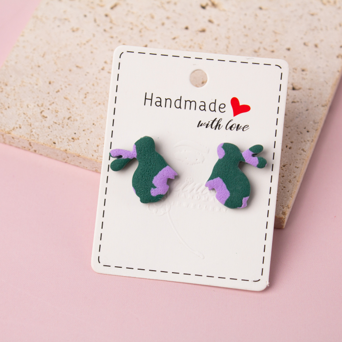 Bucură-te de o doză de veselie și culoare cu perechea noastră de cercei cu iepurași în nuanțe de verde și mov! Realizați cu migală din lut polimeric, acești cercei adorabili îți aduc aminte de iepurașii de ciocolată din copilărie. Perfecti pentru orice ocazie, acești cercei adaugă un strop de jucăușie și dulceață în viața ta de zi cu zi.