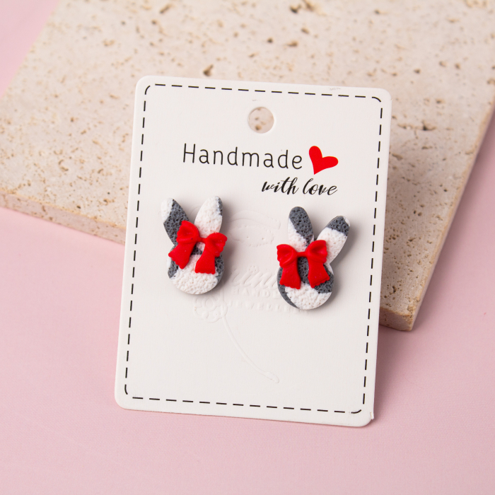 Această pereche de cercei din lut polimeric aduce un zâmbet pe chipul oricui! Cu un design jucaus, fiecare cercei înfățișează o adorabilă față de iepuraș împodobită cu o fundiță roșie. Sunt micuți și ușori, perfecti pentru a fi purtați zilnic. De culoare neagră cu pete albe adaugă un plus de stil și versatilitate, făcându-i să se potrivească cu orice ținută.