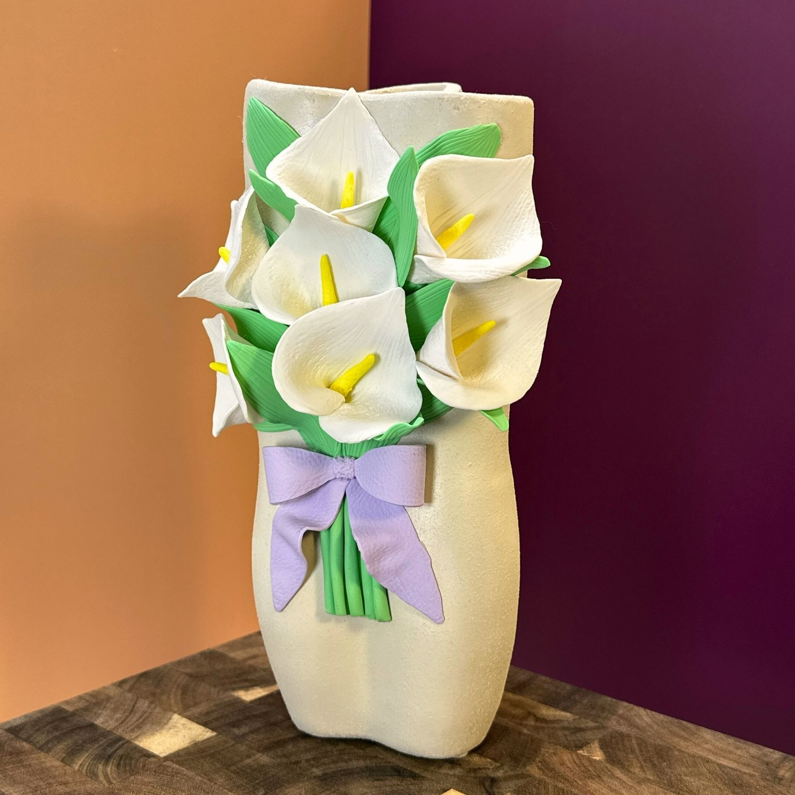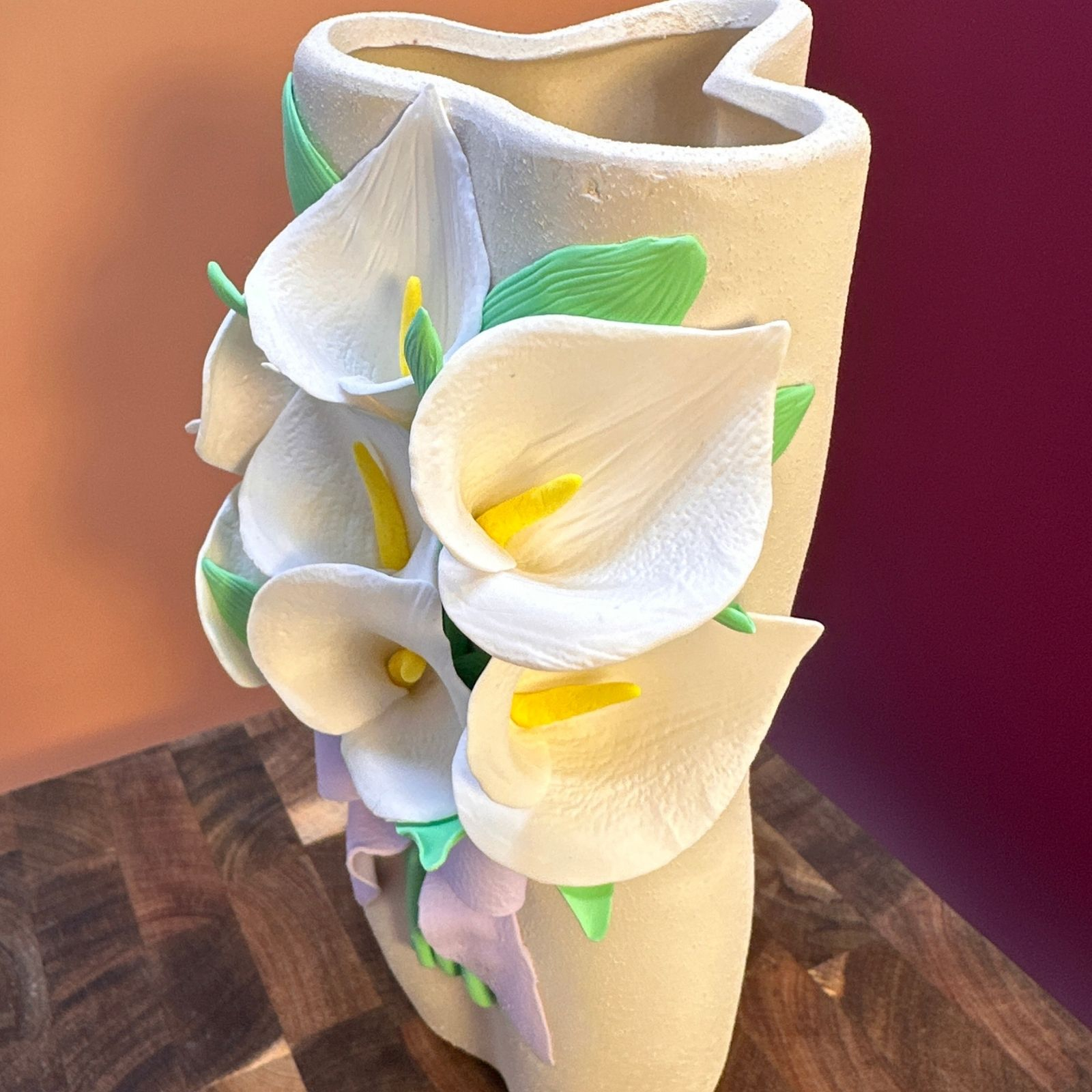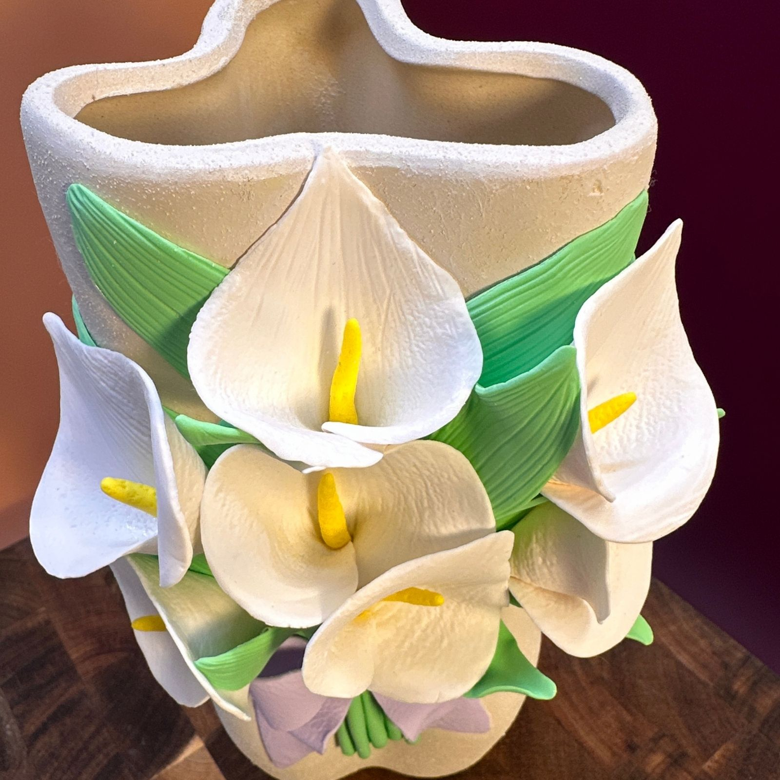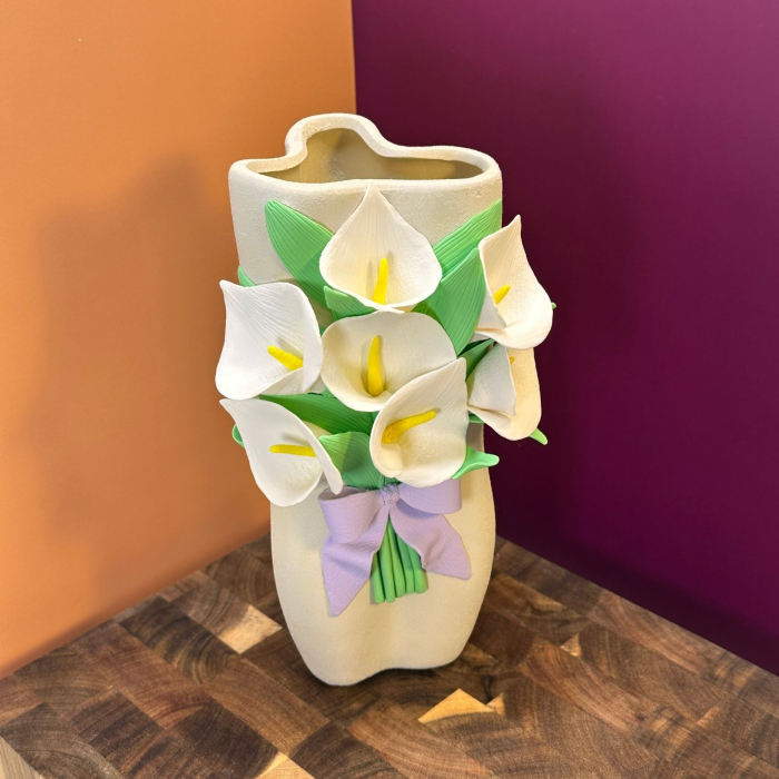 Vază din ceramică, decorată manual cu cale albe delicate, modelate din lut polimeric petală cu petală, cu atenție și migală. Un omagiu adus tuturor iubitoarelor de flori, în special celor care adoră eleganța simplă și nobilă a calelor.