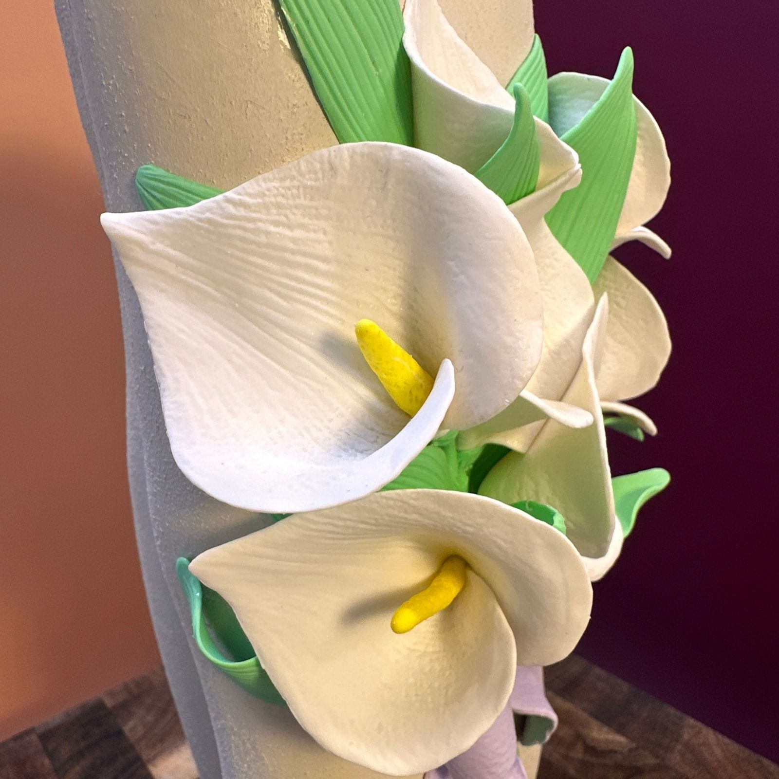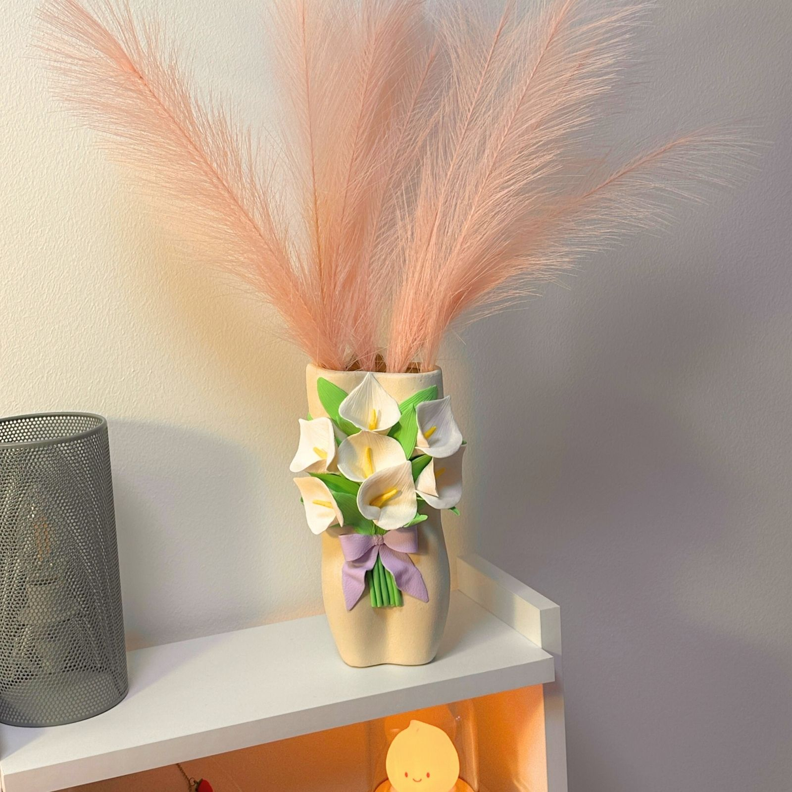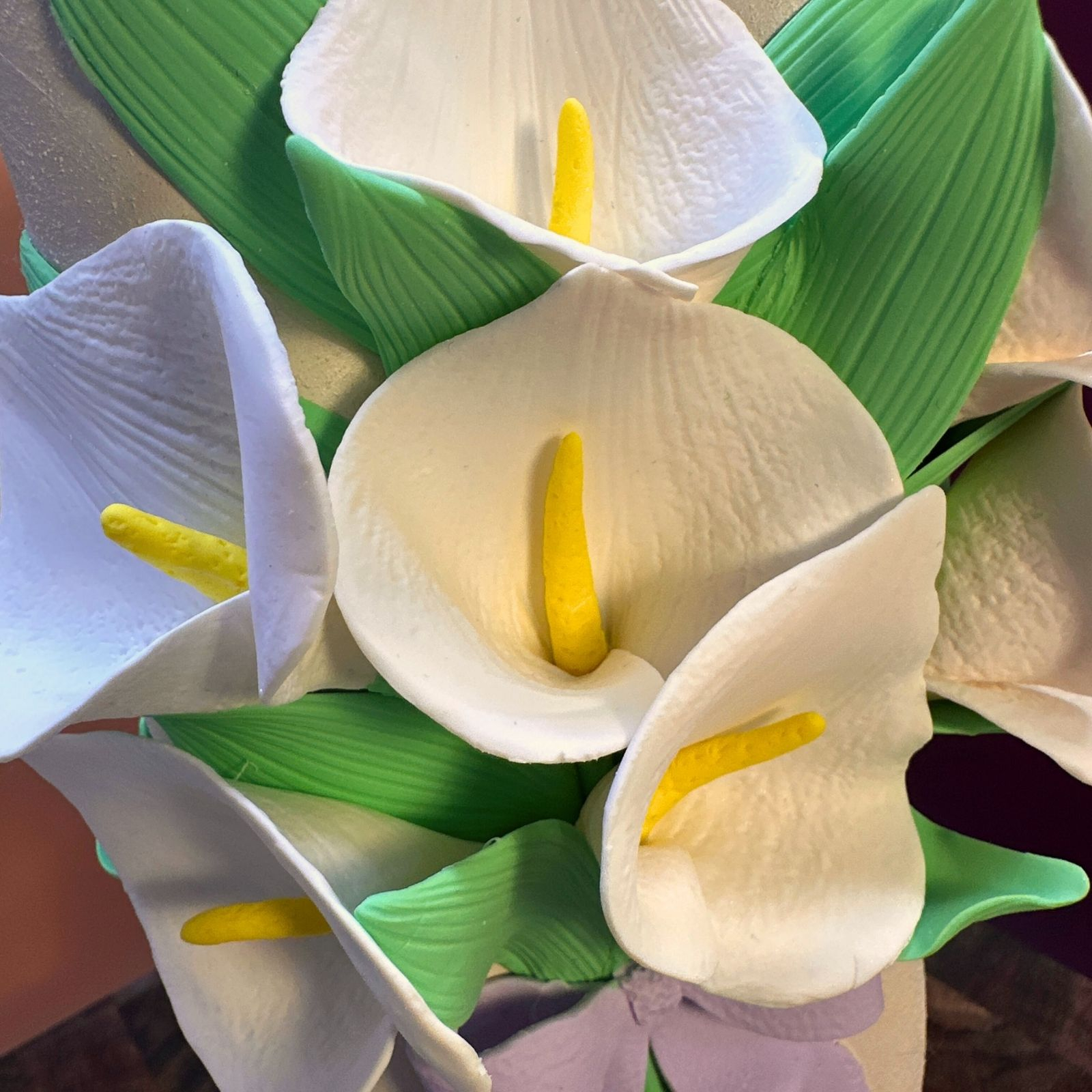 Vază din ceramică, decorată manual cu cale albe delicate, modelate din lut polimeric petală cu petală, cu atenție și migală. Un omagiu adus tuturor iubitoarelor de flori, în special celor care adoră eleganța simplă și nobilă a calelor.
