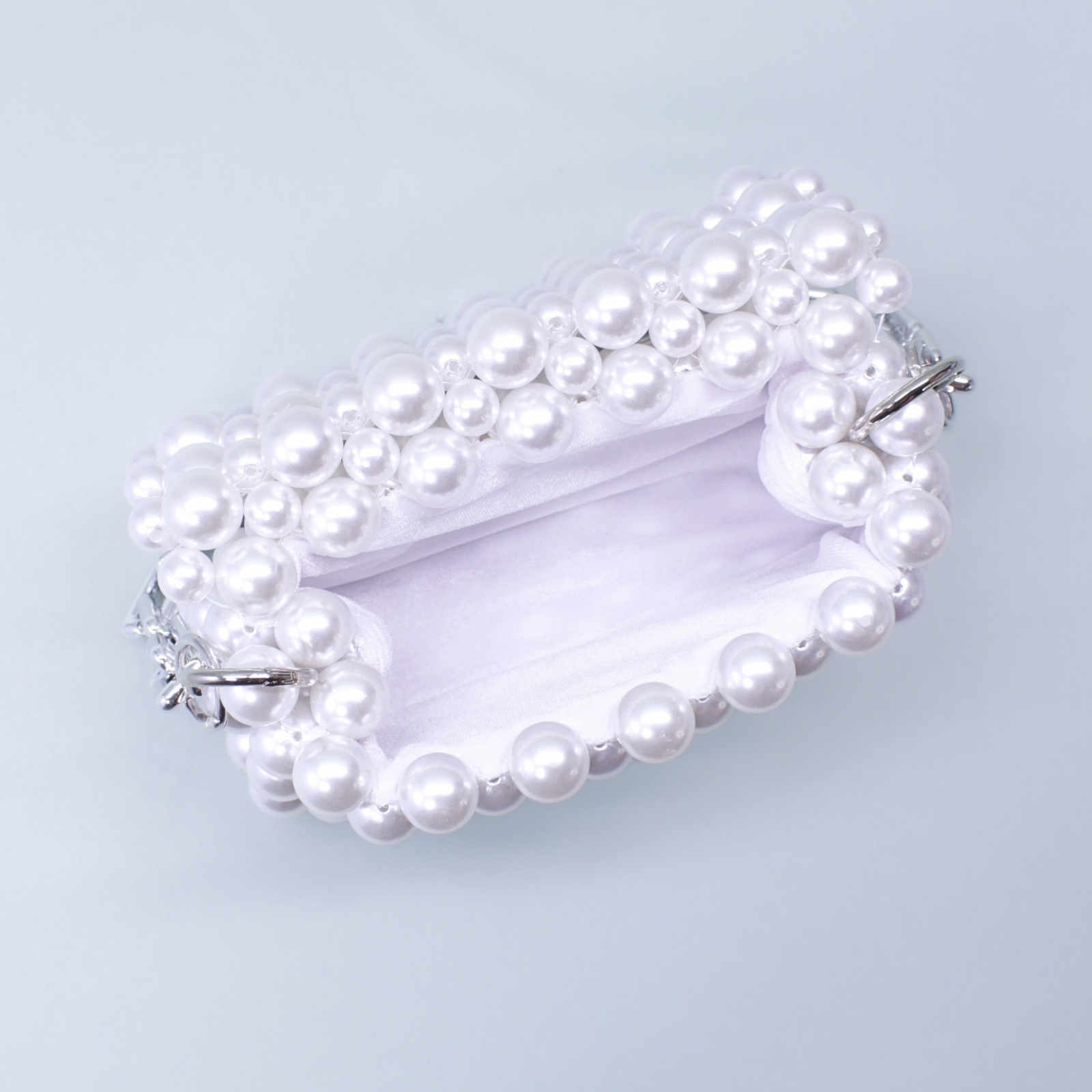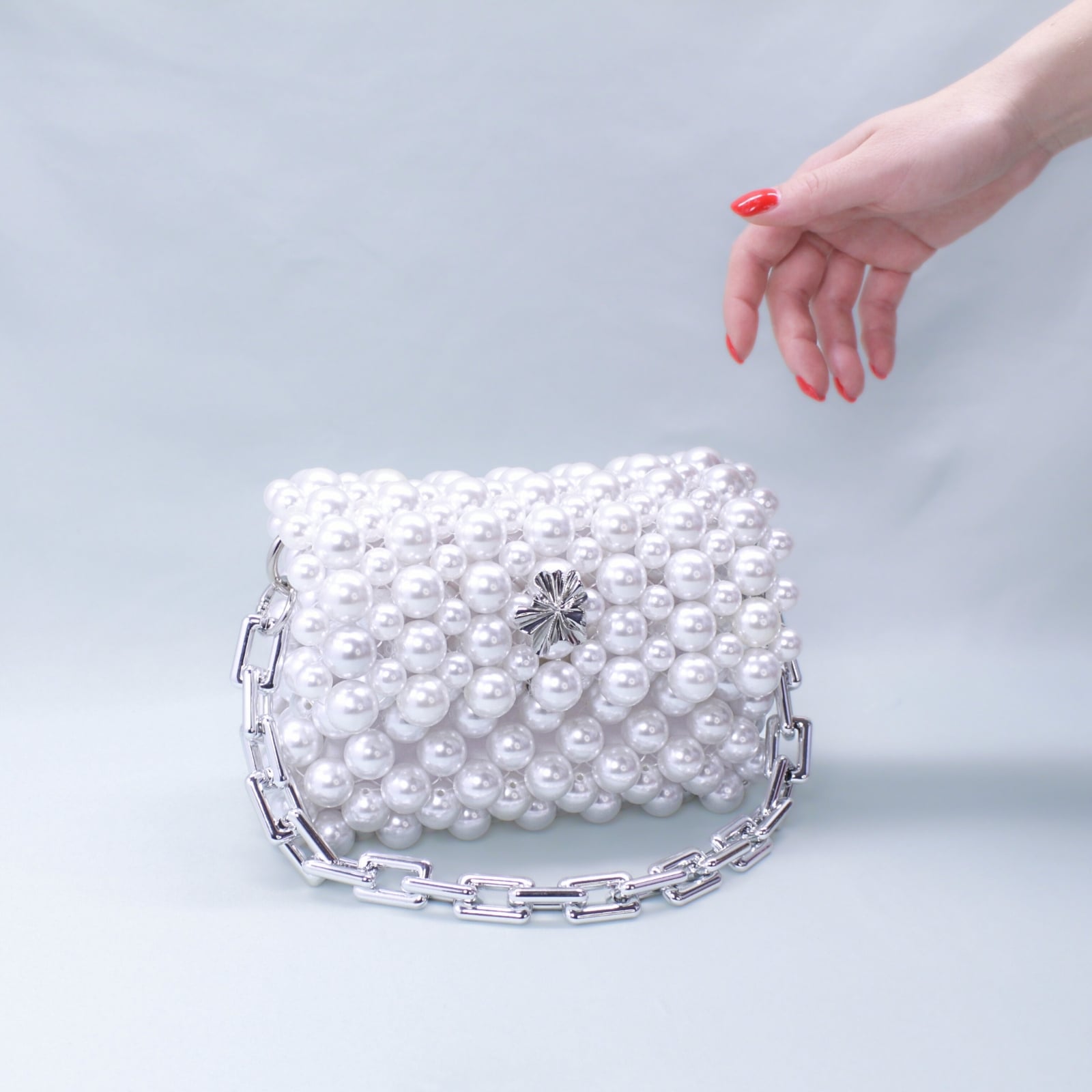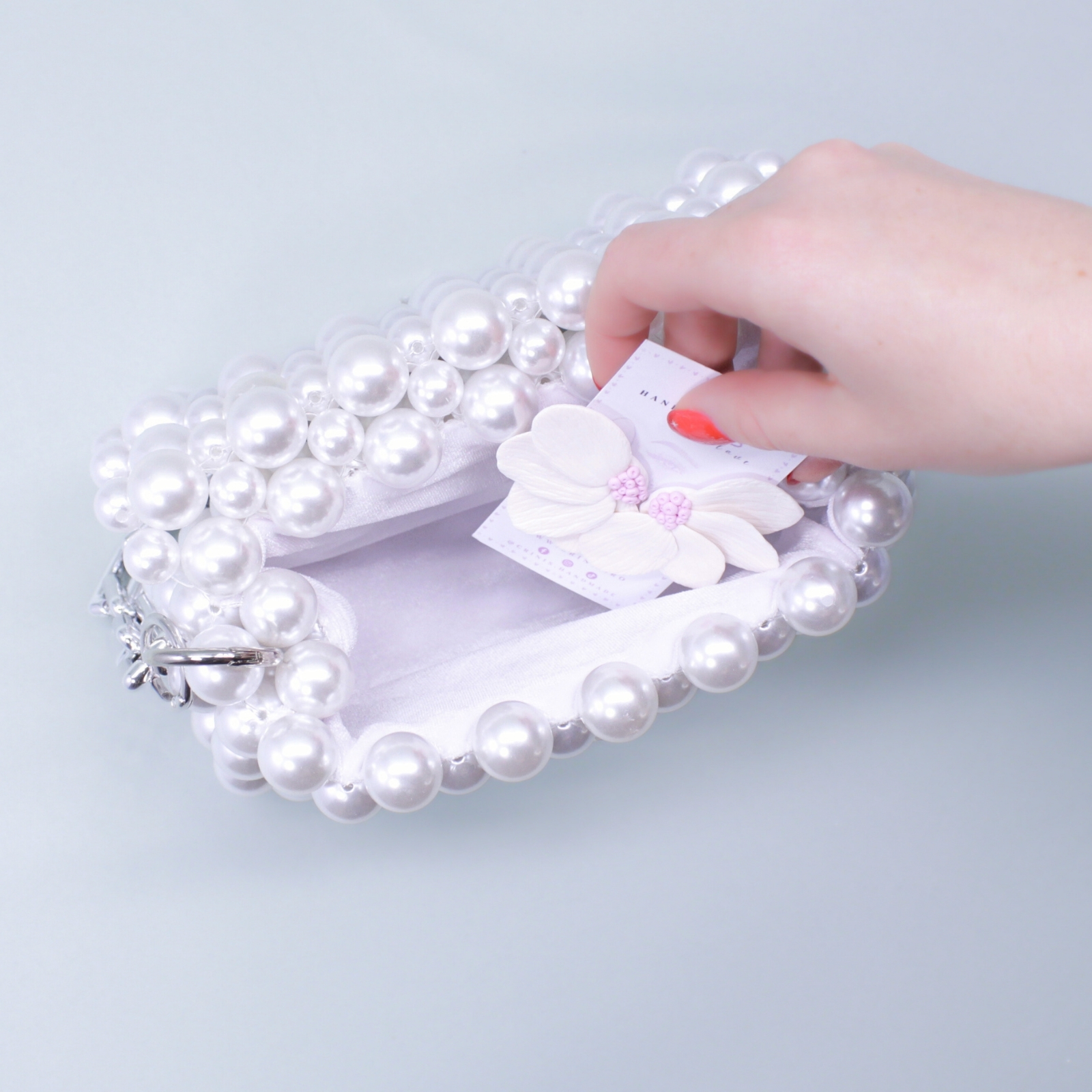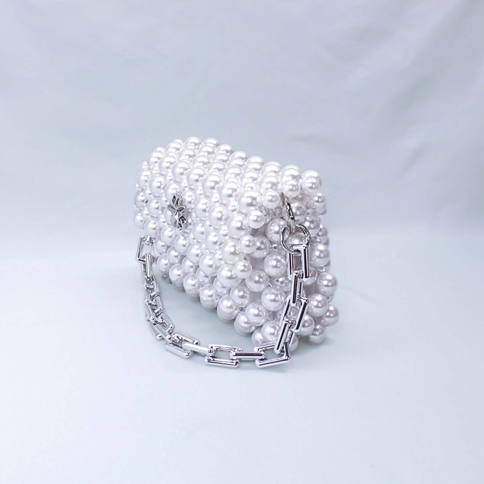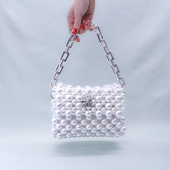 O geantă unică, lucrată manual în micul nostru atelier din mărgele acrilice albe, care nu se va mai reface după epuizarea stocului.