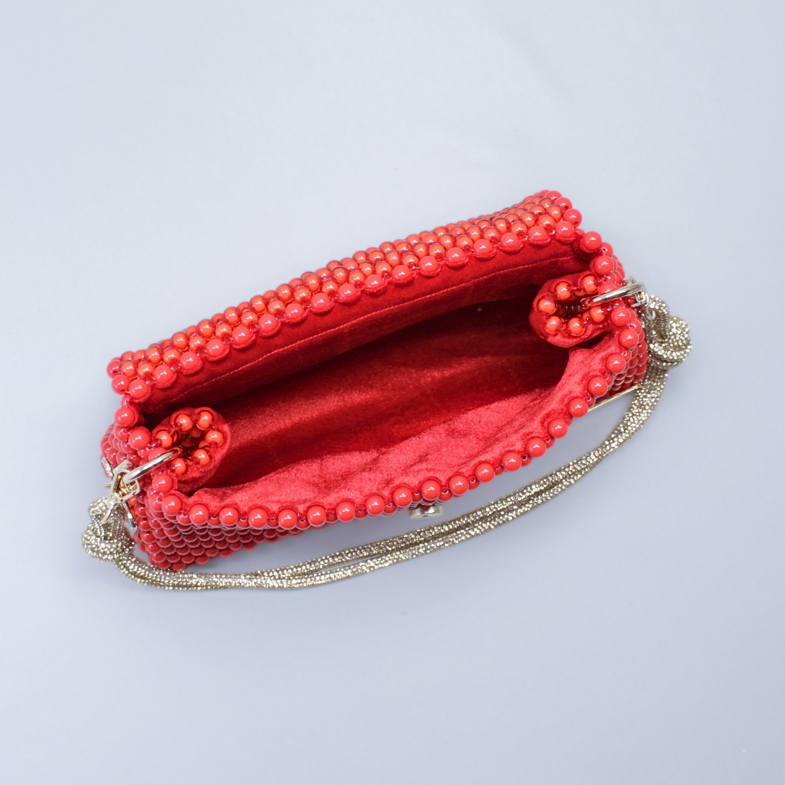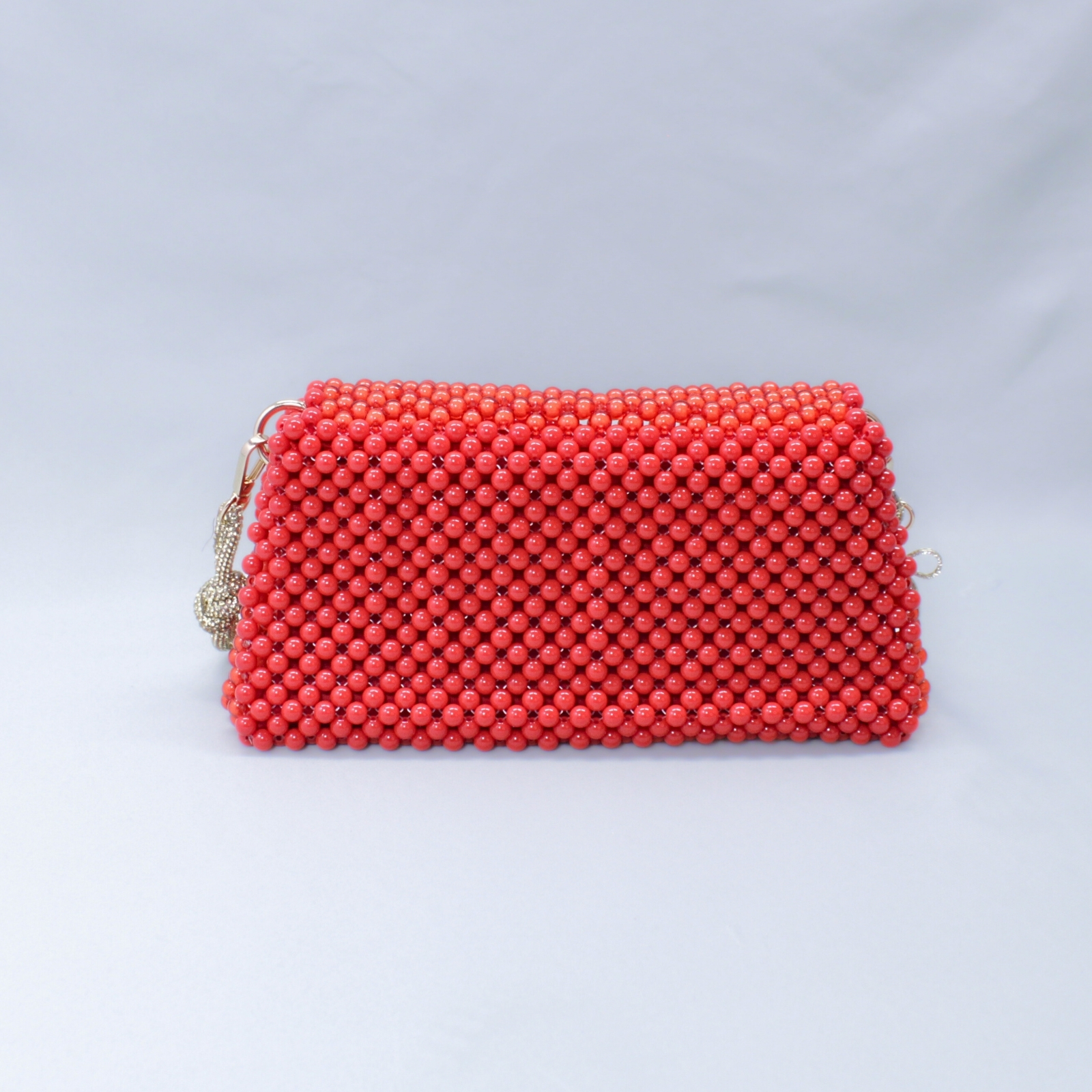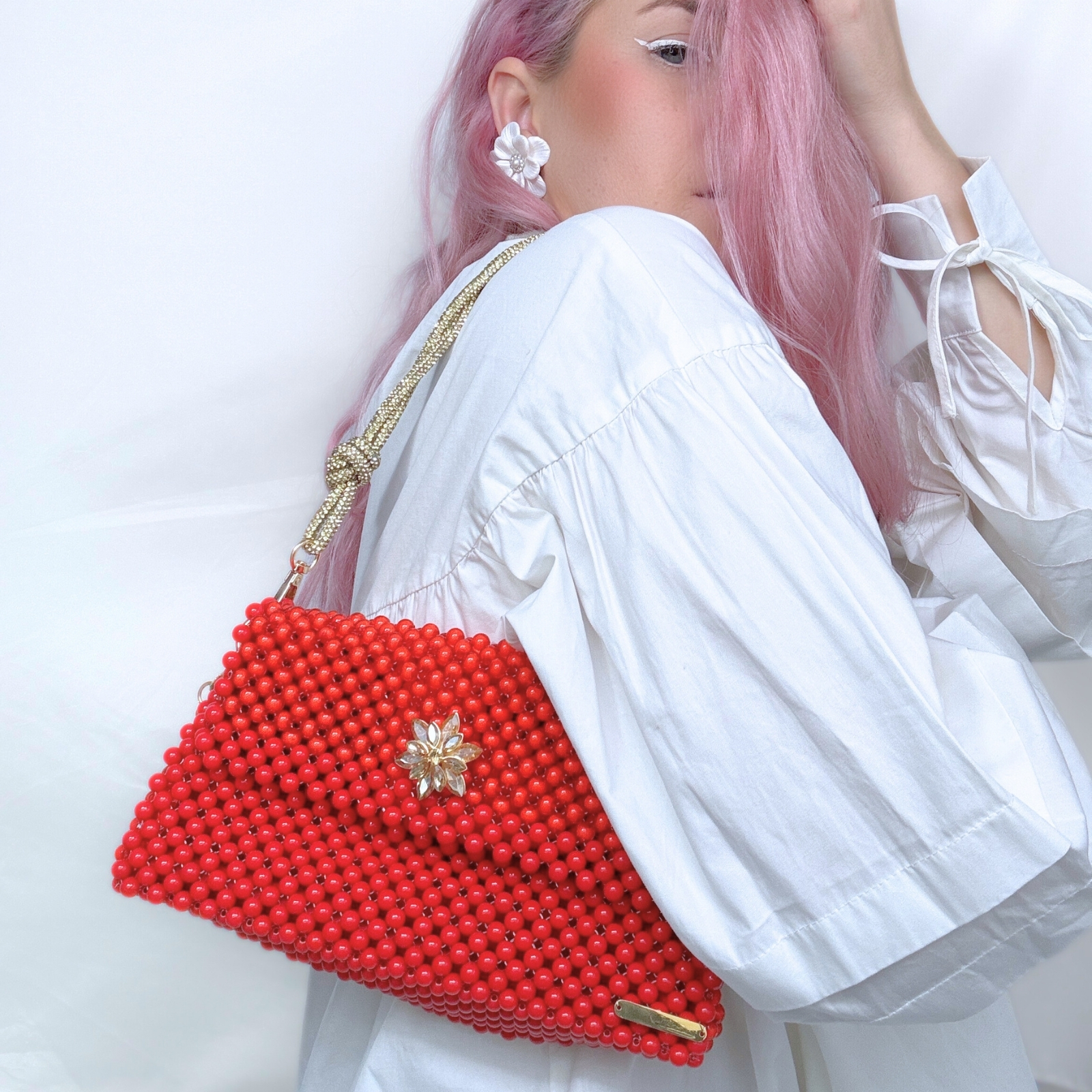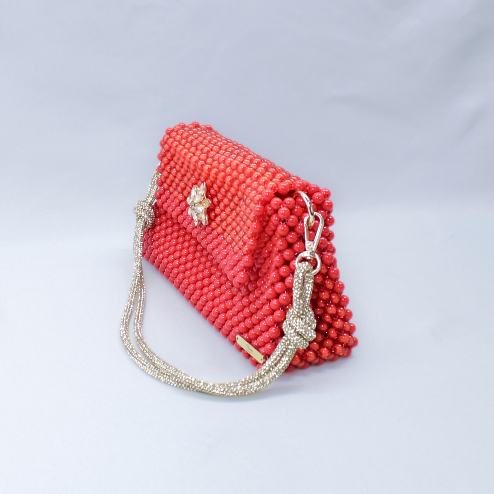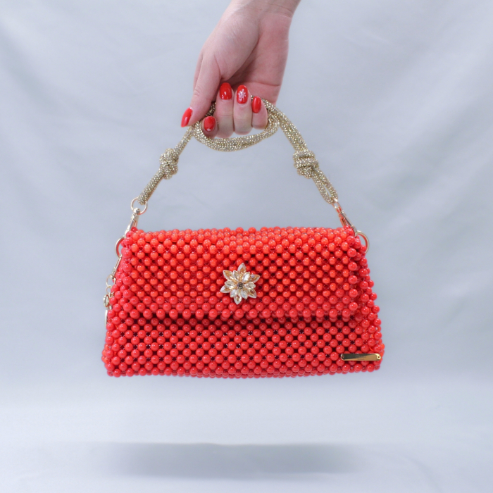 O geantă realizată manual în micul nostru atelier, creată din mărgele acrilice în două nuanțe de roșu, atent alese pentru a se completa perfect. În realitate, diferențele dintre cele două tipuri de mărgele sunt subtile, însă oferă un efect vizual rafinat: capacul și lateralele sunt lucrate dintr-un model de mărgele diferit, într-o frumoasă combinație de roșu cu accente aurii.