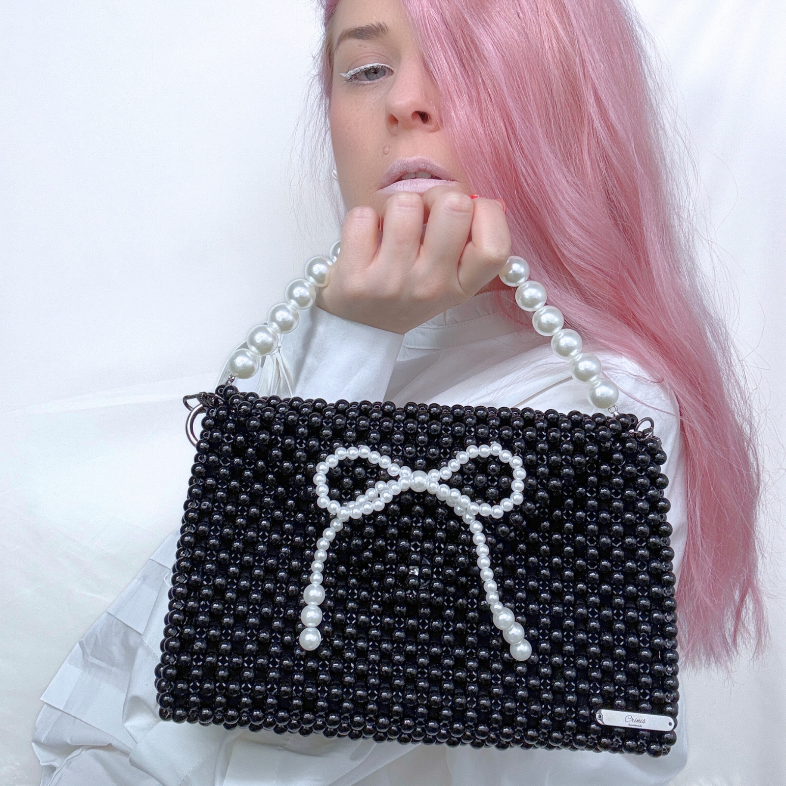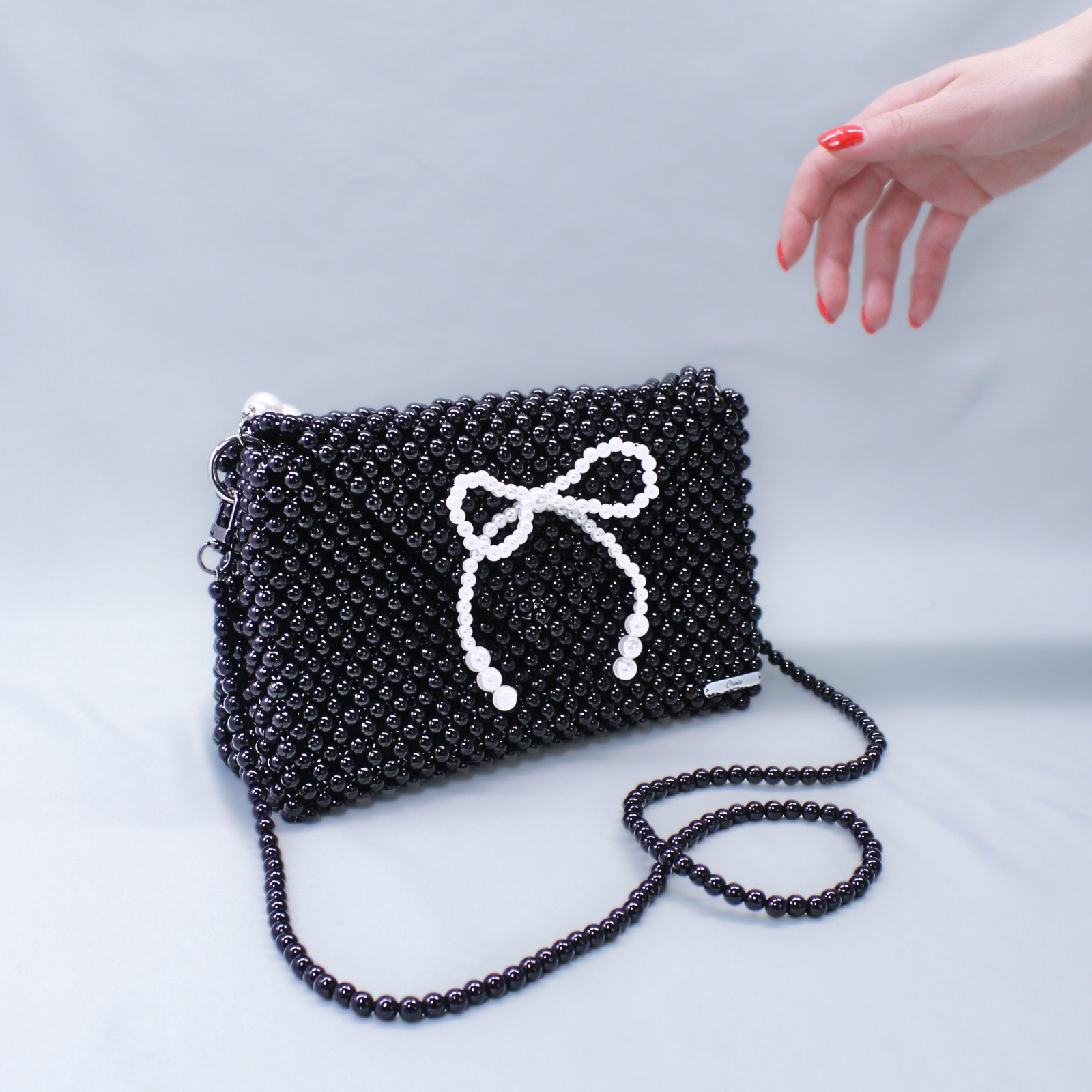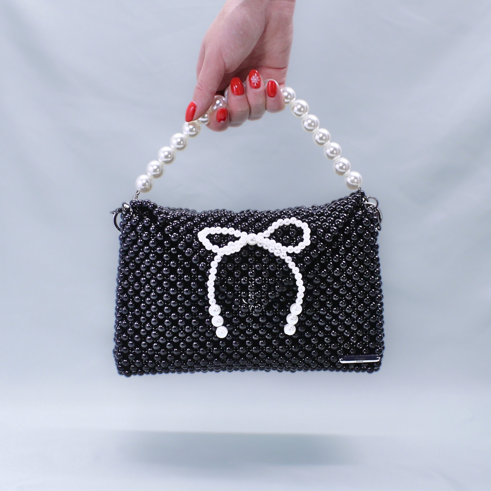 Atenția este atrasă imediat de fundița decorativă și de mânerul realizat din mărgele tip perlă albă, două detalii care transformă geanta într-o piesă cu adevărat specială. Pentru un plus de versatilitate, aceasta este prevăzută cu două mânere detașabile, astfel încât să poată fi purtată în stilul care ți se potrivește cel mai bine.