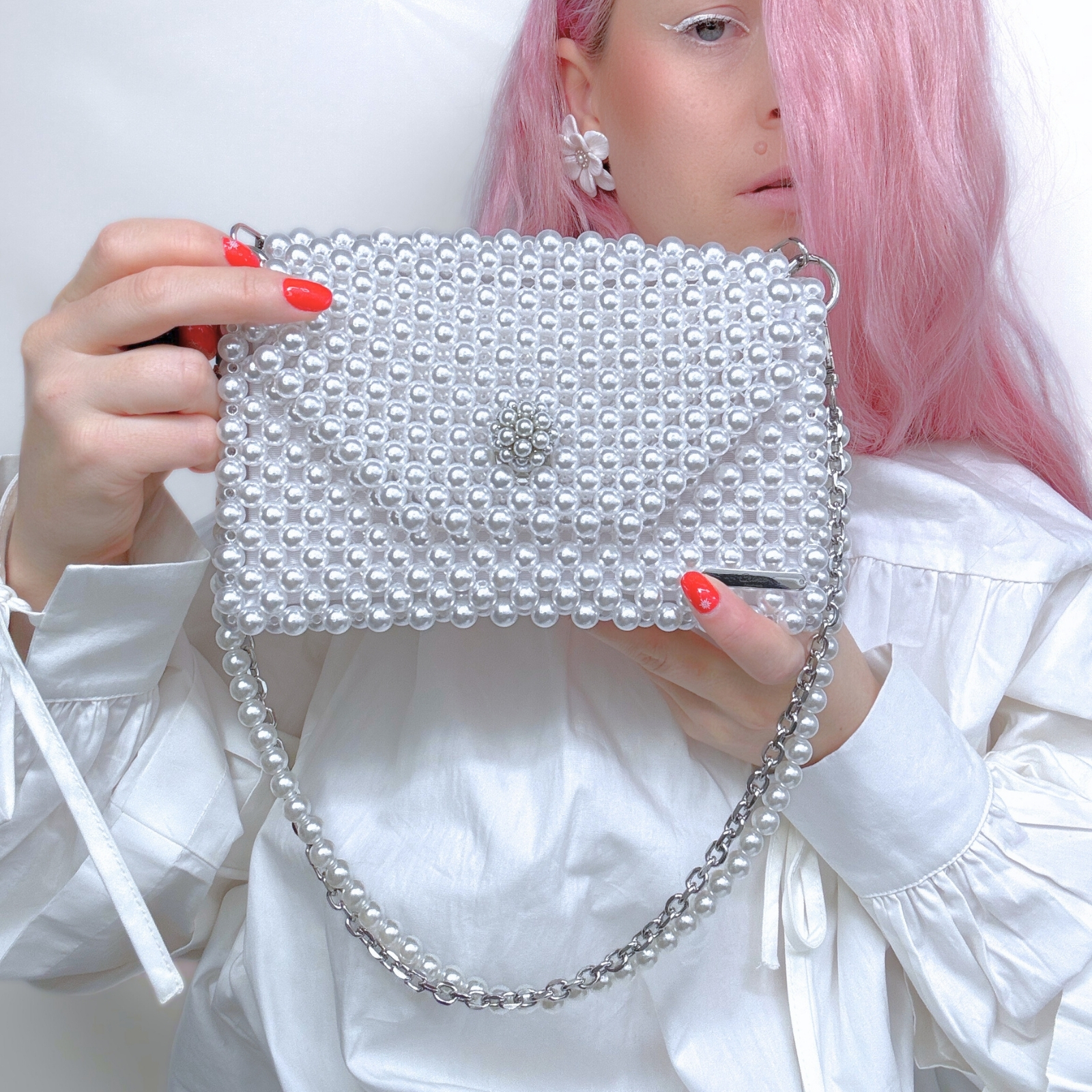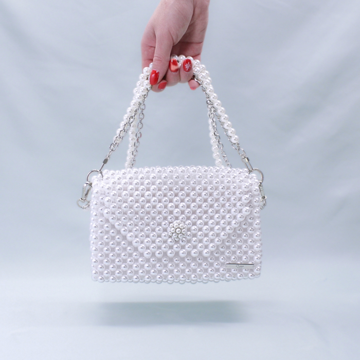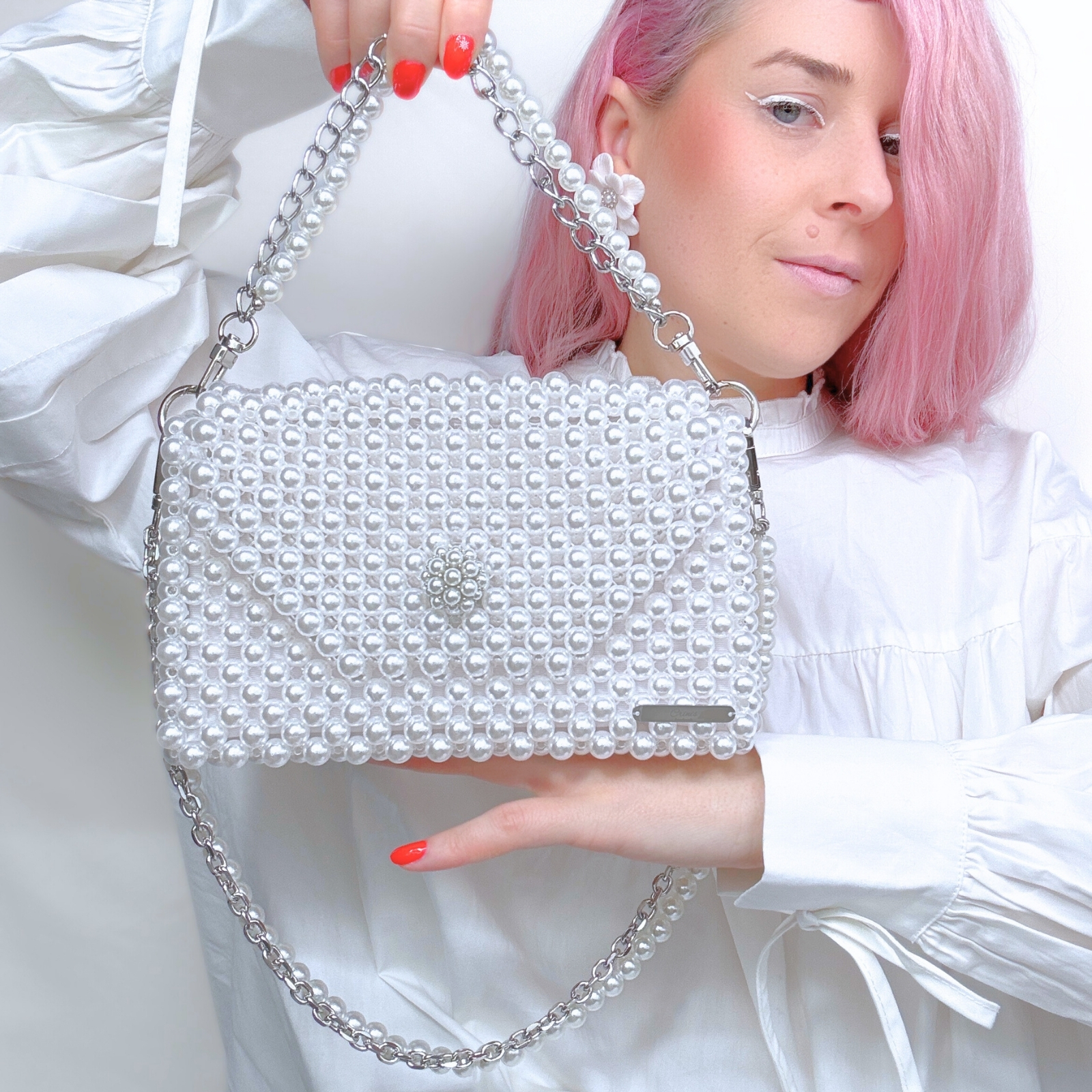 O geantă finuță și elegantă, lucrată manual în micul nostru atelier din mărgele acrilice albe, care combină frumusețea cu funcționalitatea.