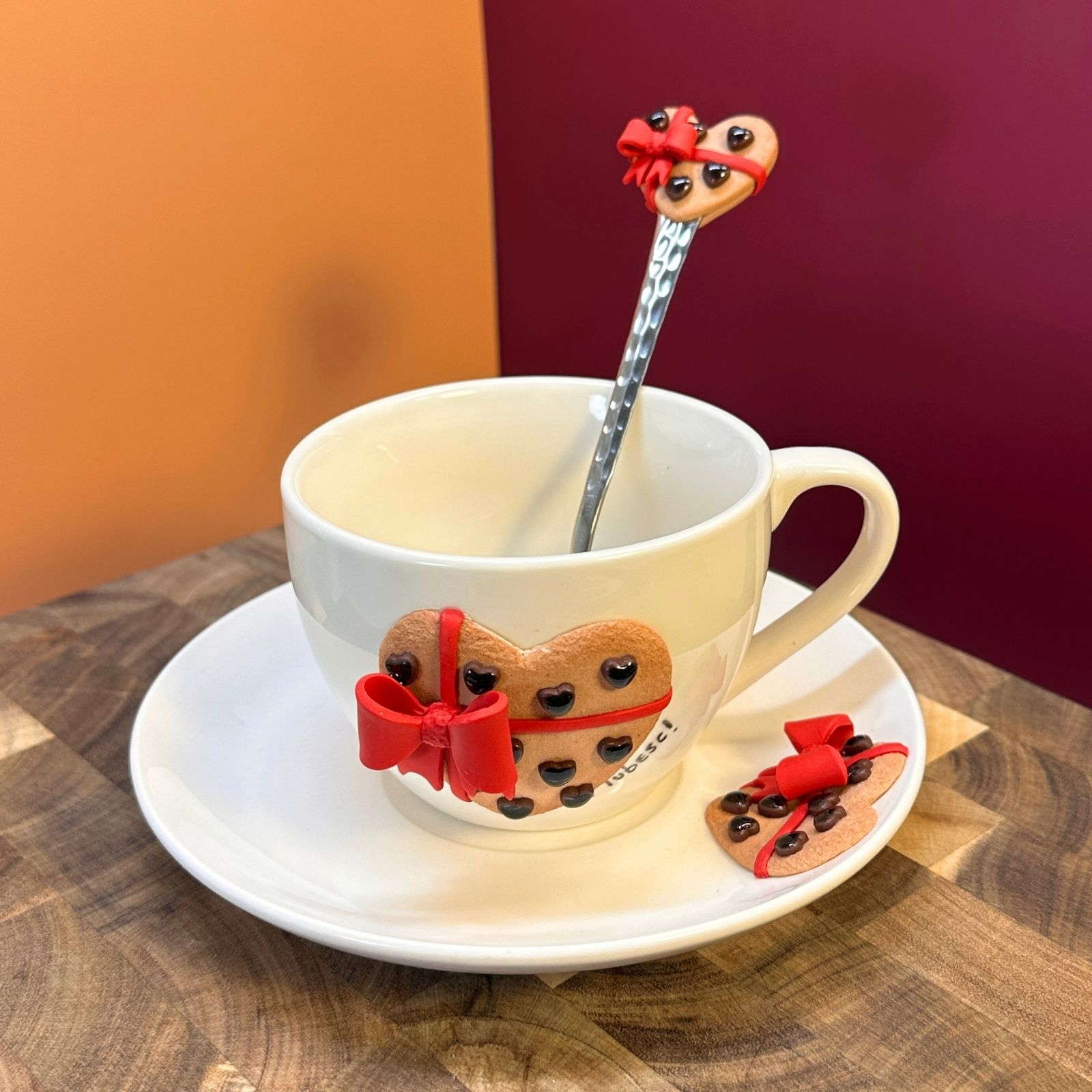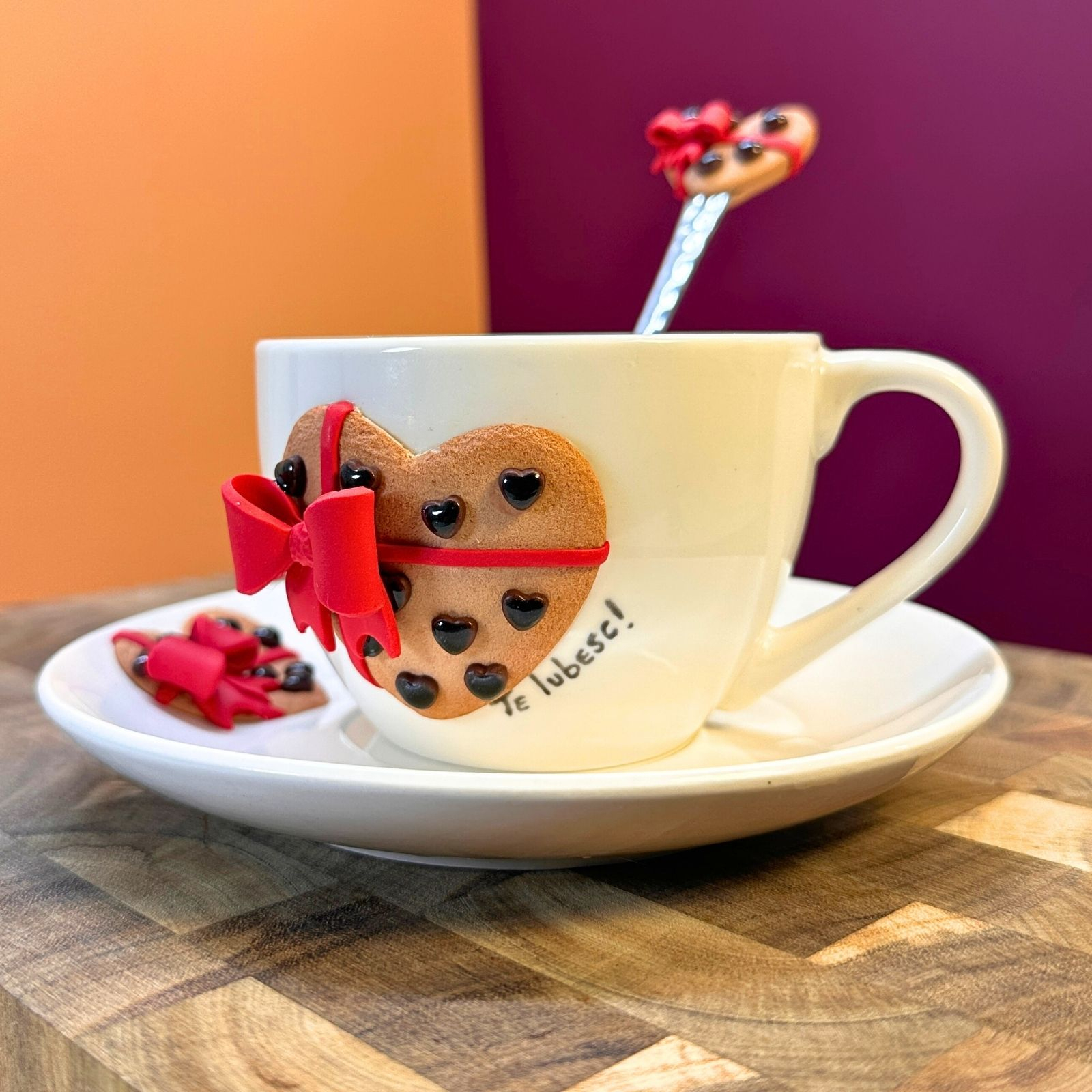 Un set delicat format din ceașcă, farfurioară și linguriță, inspirat de farmecul unei cutii de bomboane cu ciocolată, frumos legată cu o fundiță roșie. Forma de inimioară și detaliile atent lucrate transformă acest set într-o declarație dulce, dar profundă.