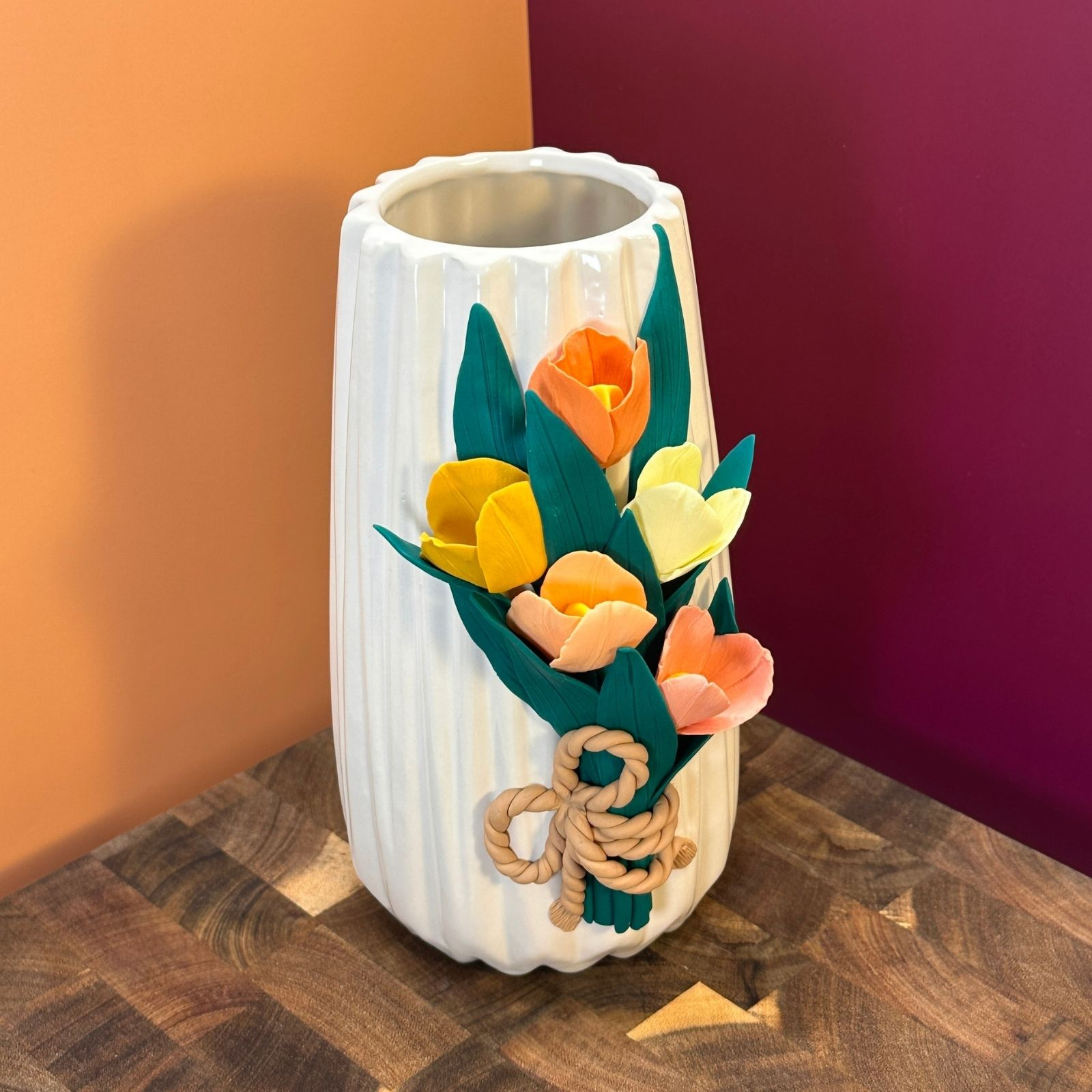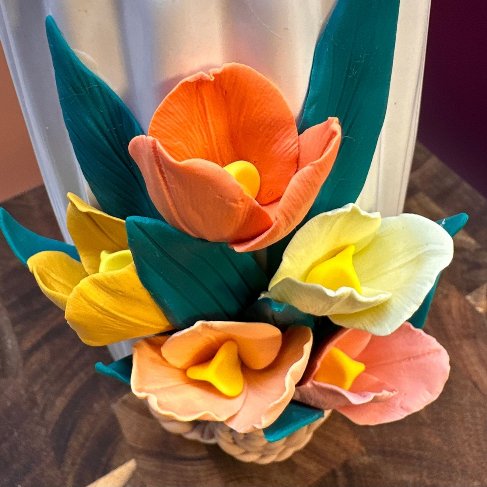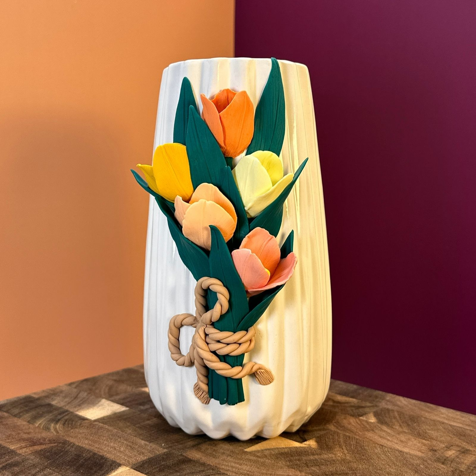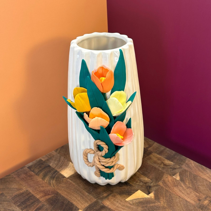 Vază decorată manual cu un buchet de lalele colorate, modelate cu grijă din lut polimeric, petală cu petală. Un aranjament vesel, plin de culoare și prospețime, care surprinde farmecul primăverii într-o formă ce nu se ofilește niciodată.