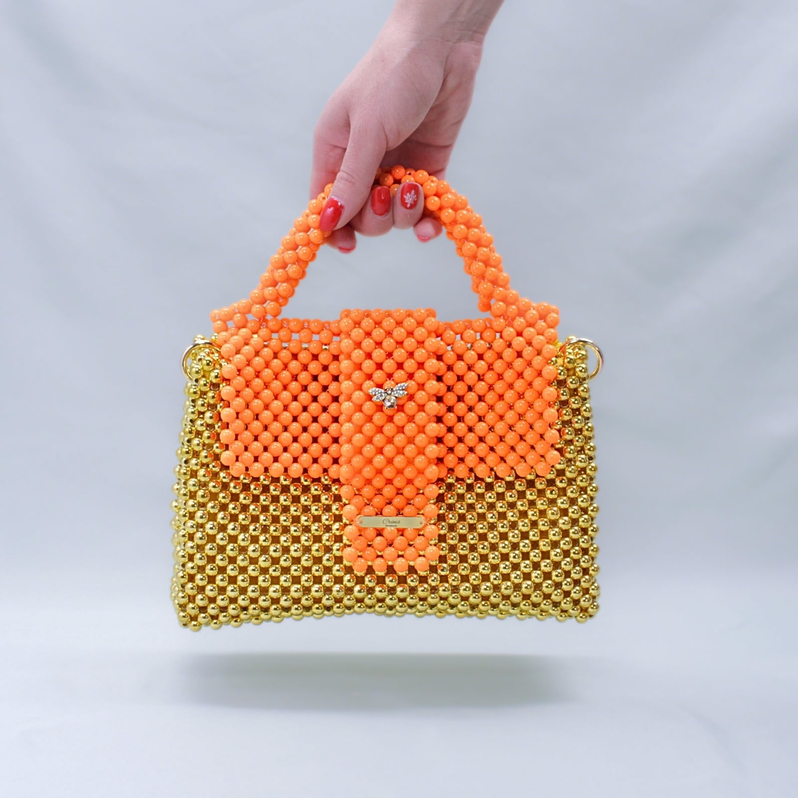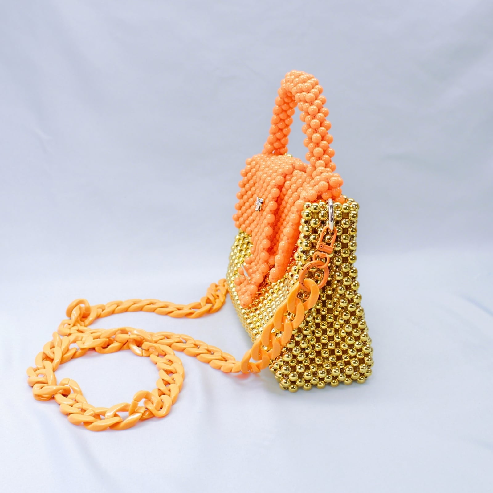 O piesă nonconformistă și plină de personalitate, lucrată manual din mărgele acrilice cu o combinație îndrăzneață de portocaliu și bază aurie.