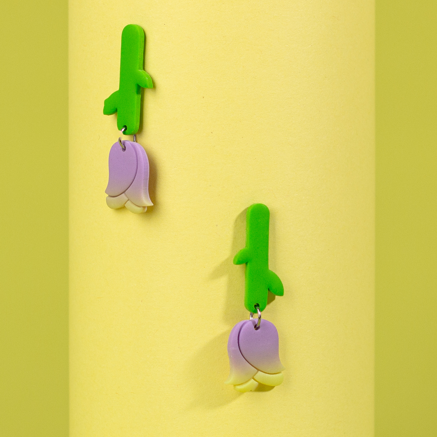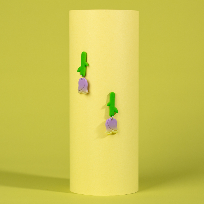 Parte din colecția Spring, cerceii Mystic Tulip surprind farmecul enigmatic al lalelelor într-o combinație spectaculoasă de mov intens și galben delicat spre vârfuri, creând un degradeu hipnotizant. Cu un design inspirat din natură, aceste bijuterii redau perfect forma și eleganța unei lalele cu tot cu tulpină, transformând-o într-un accesoriu rafinat.