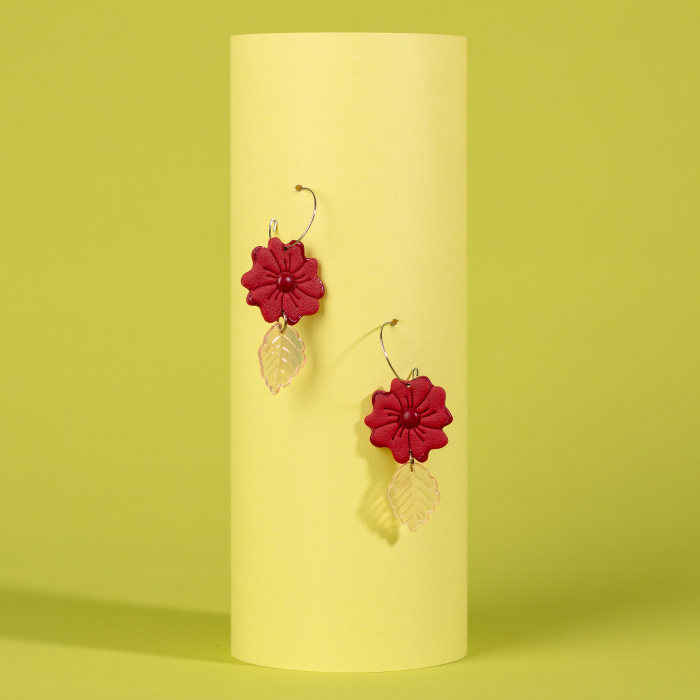 Descoperă eleganța și rafinamentul cu această pereche de cercei lungi din lut polimeric într-o nuanță visinie fermecătoare! Designul lor aparte, cu o floare mare și o frunză, adaugă un plus de feminitate și stil oricărei ținute. Nuanța profundă de visiniu își găsește echilibrul perfect în forma delicată a florii și a frunzei, creând un contrast uimitor și atrăgător. Acești cercei sunt accesoriul ideal pentru a-ți completa ținutele de seară sau de ocazie, aducând un strop de farmec și eleganță în fiecare apariție. Bucură-te de frumusețea lor distinctivă și lasă-i să-ți evidențieze rafinamentul și gustul pentru frumos!