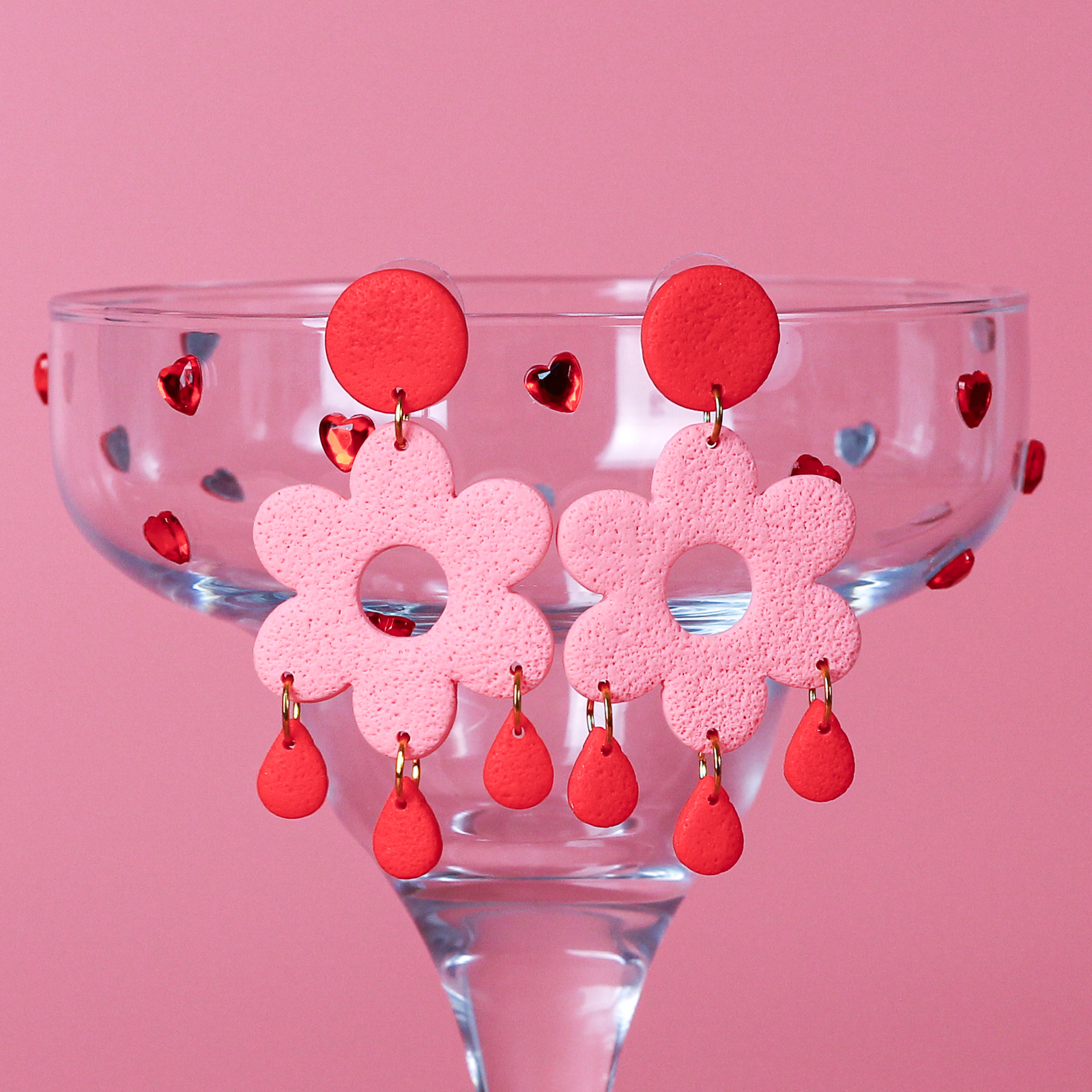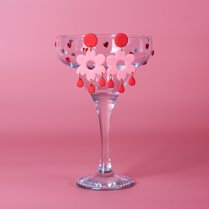 Cu o formă delicată de floare și picături de apă care dansează, această pereche în nuanțe de roșu și roz adaugă un strop de prospețime în orice ținută.