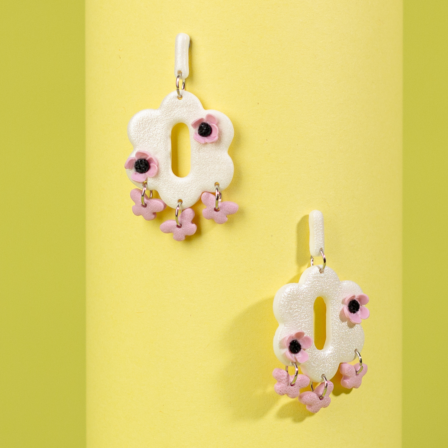 Descoperiți eleganța și delicatetea acestor cercei handmade din lut polimeric, într-un alb imaculat, cu motive subtile de fluturi.