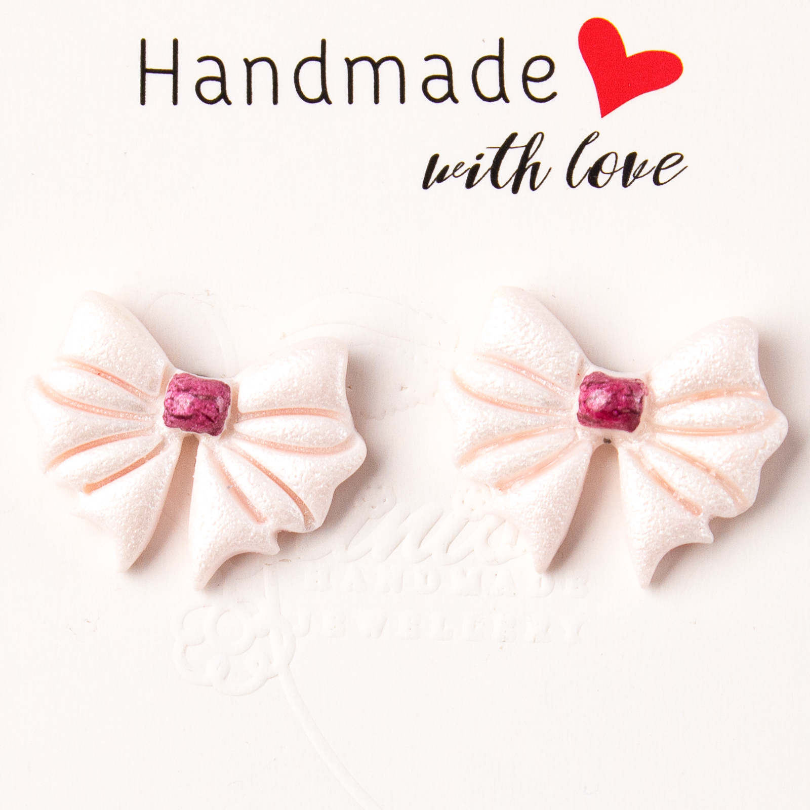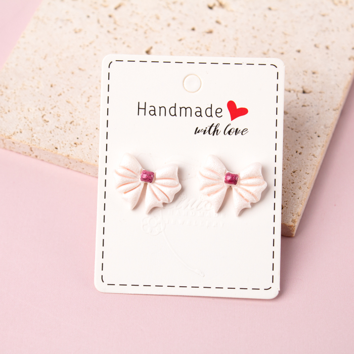 Îmbrăcați-vă într-o dulce eleganță cu acești adorabili cercei în formă de fundiță din lut polimeric! Fiecare pereche emană un farmec jucăuș și feminin, aducând un strop de veselie și rafinament în fiecare purtare. Perfecti pentru a adăuga o notă de stil și gingășie oricărei ținute!